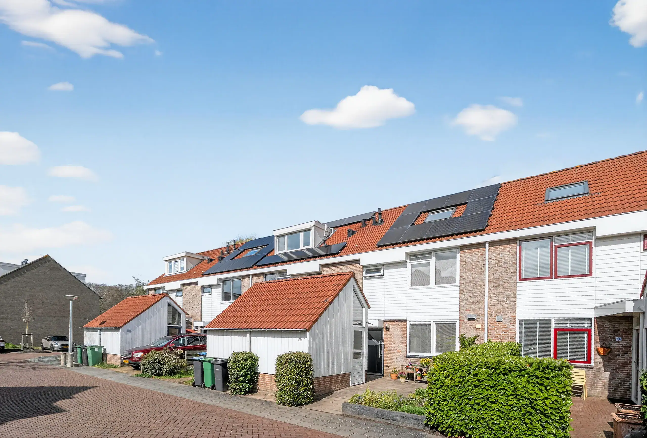 The house is approached via a sunny front garden, which also contains a practical storage shed, ideal for bicycles or garden tools.