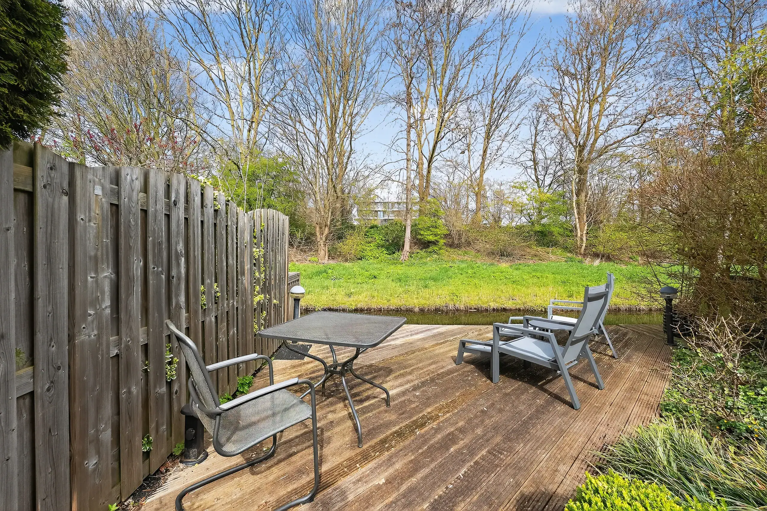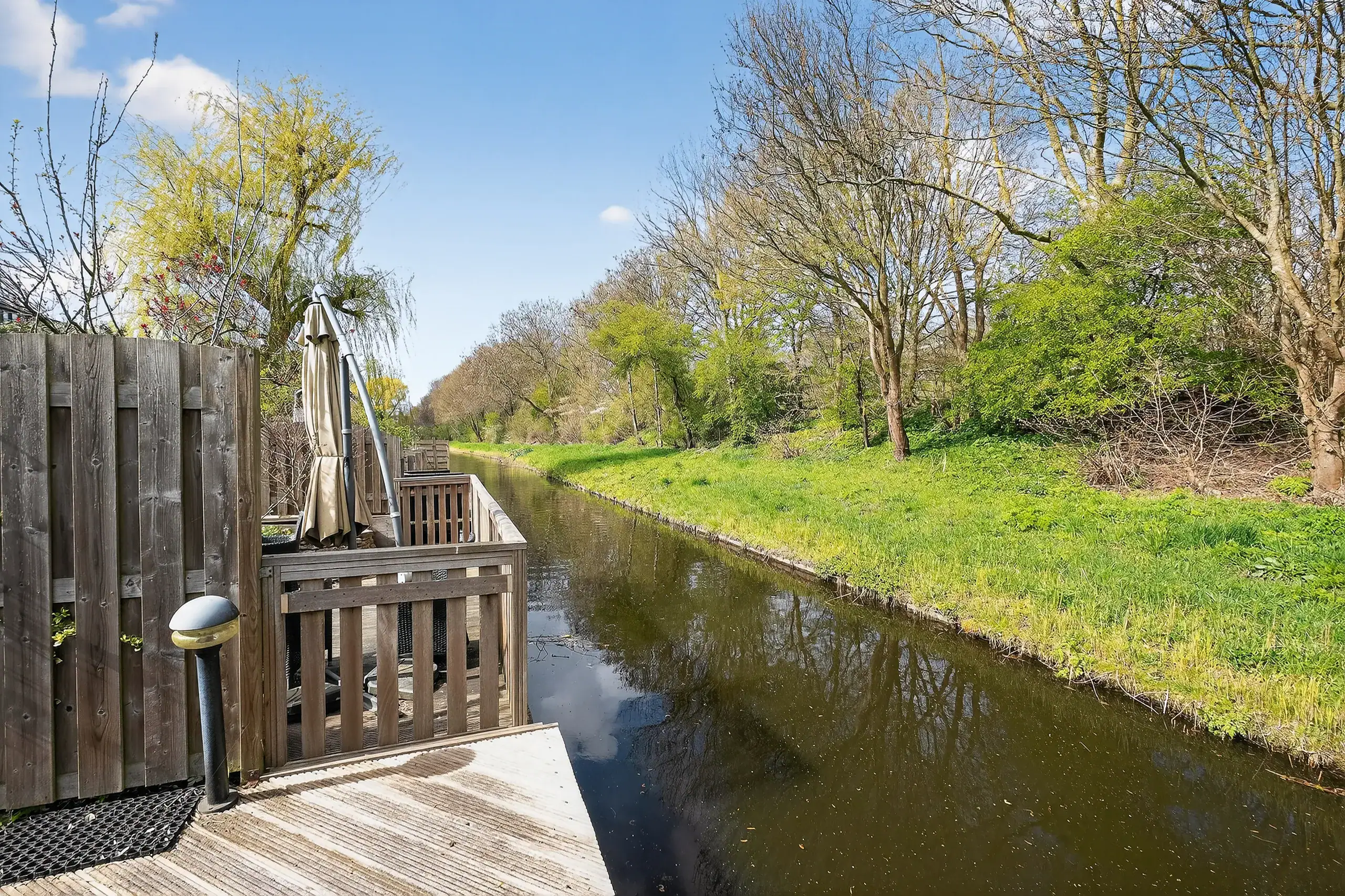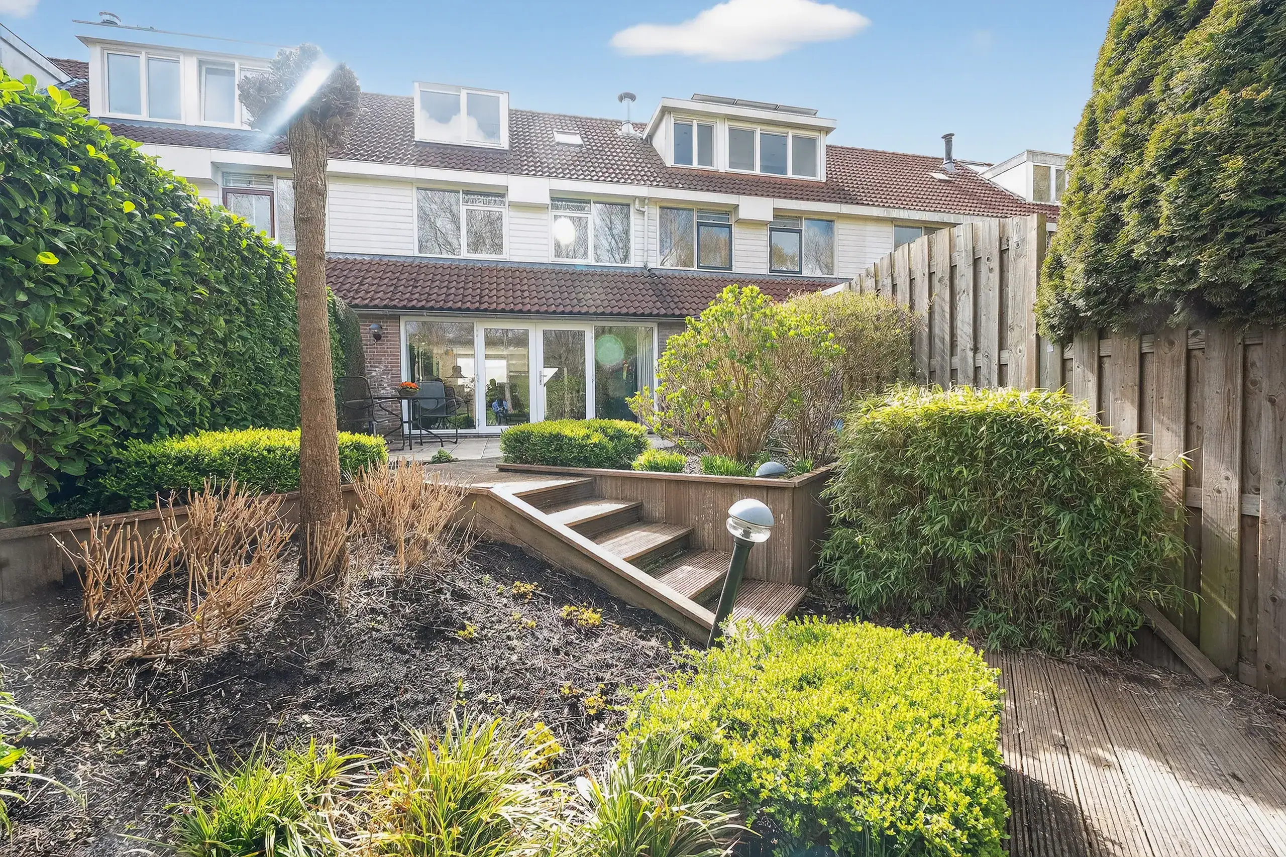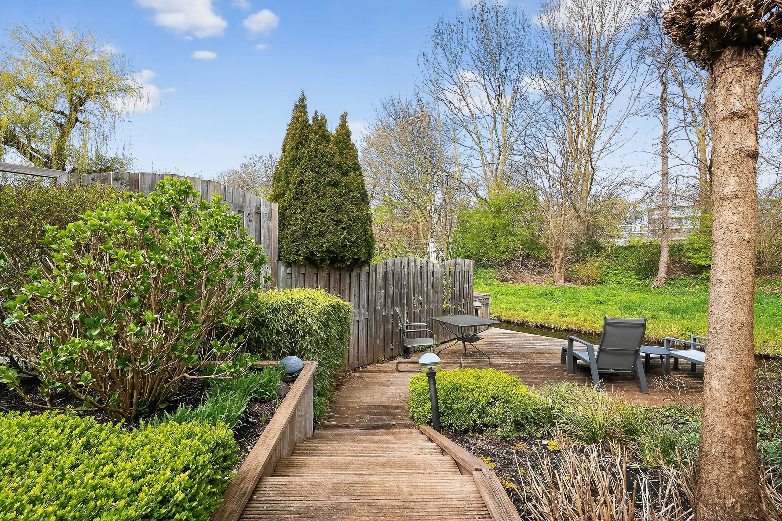 The beautifully landscaped rear garden, designed by a landscape architect, is a true eye-catcher and offers several pleasant seating areas. Directly adjacent to the house is a spacious terrace, while a second, lower terrace by the water is accessible via a playful wooden-stepped staircase. This allows you to enjoy sun and tranquility at any time of the day.