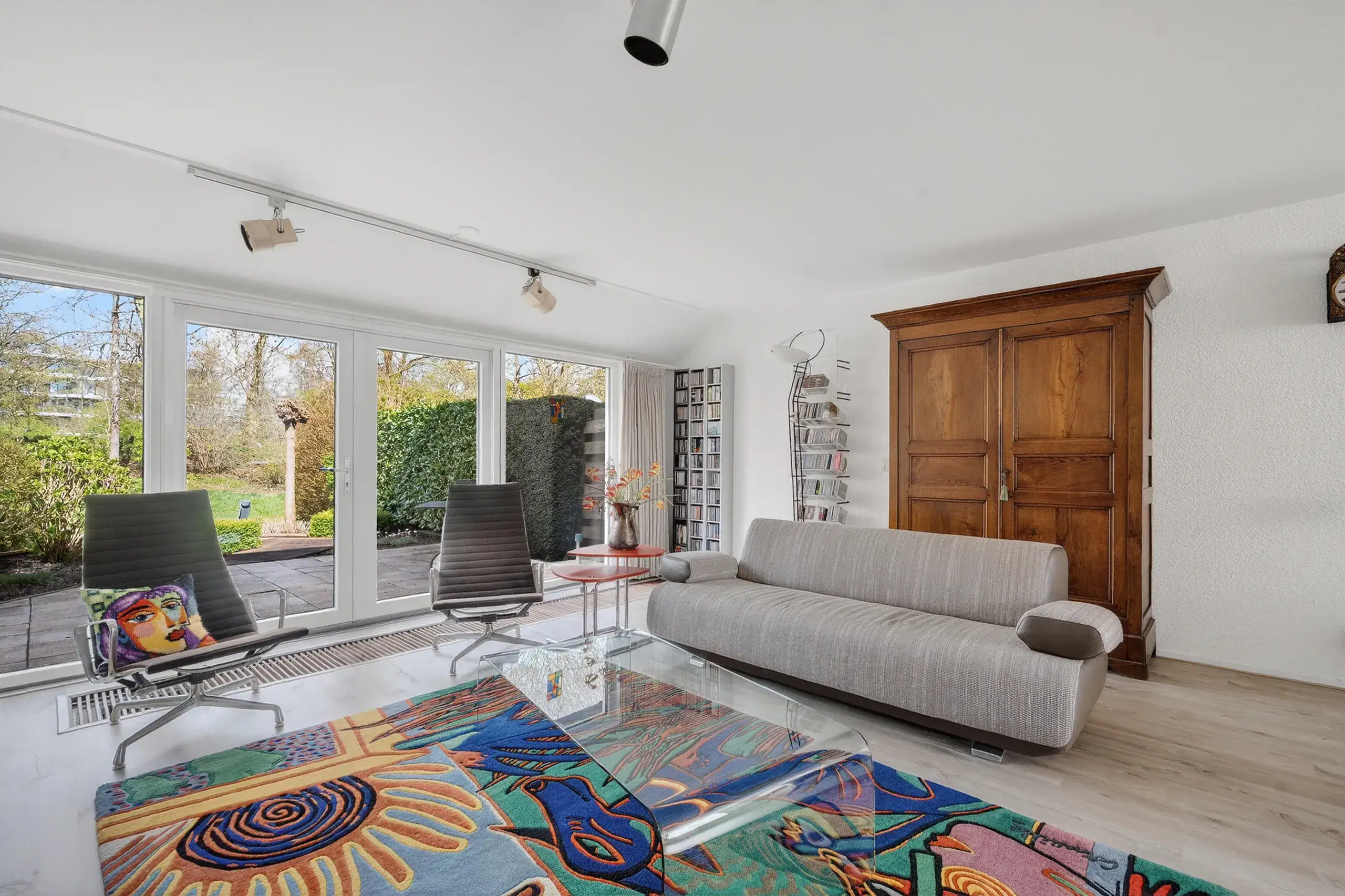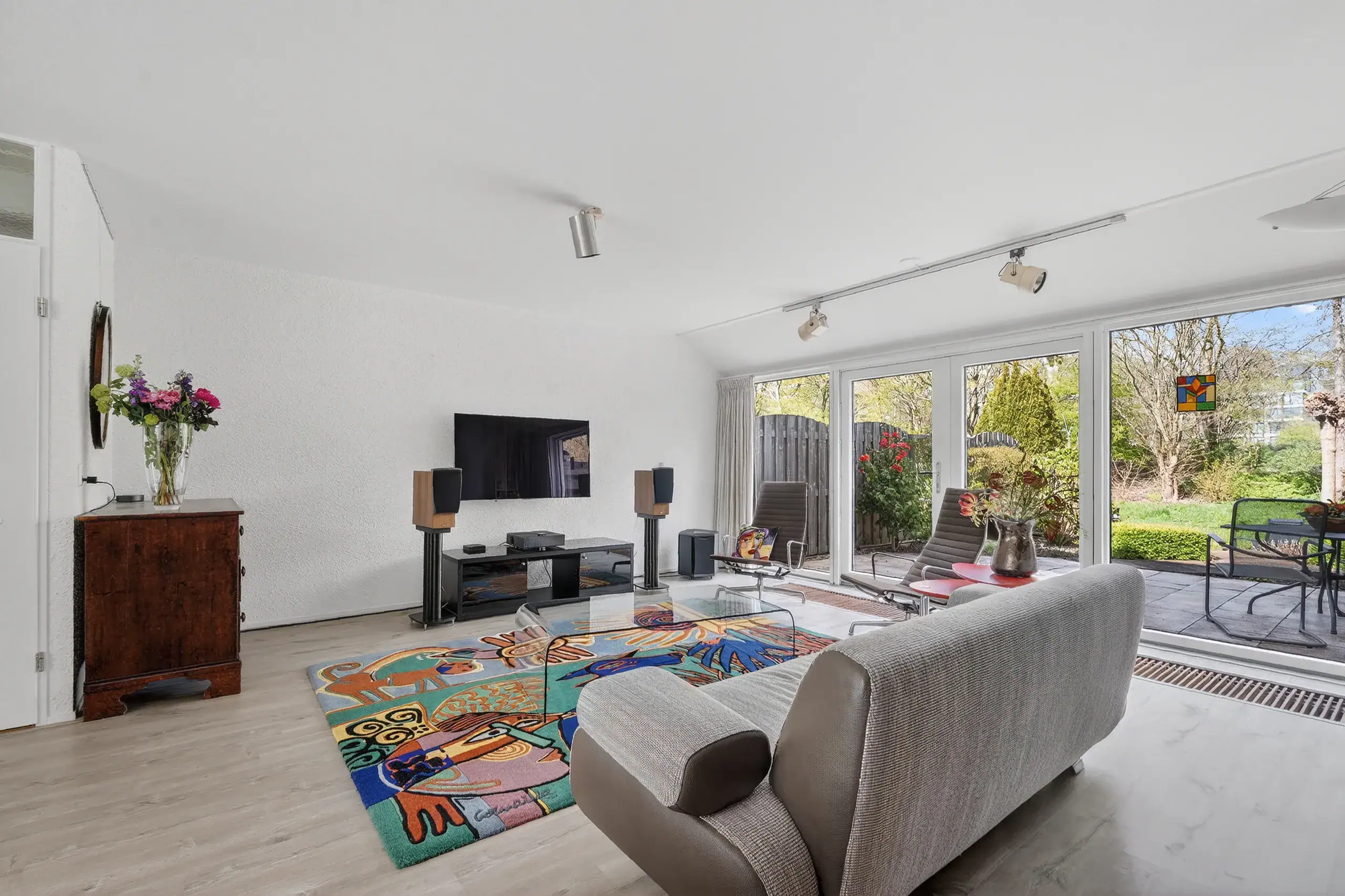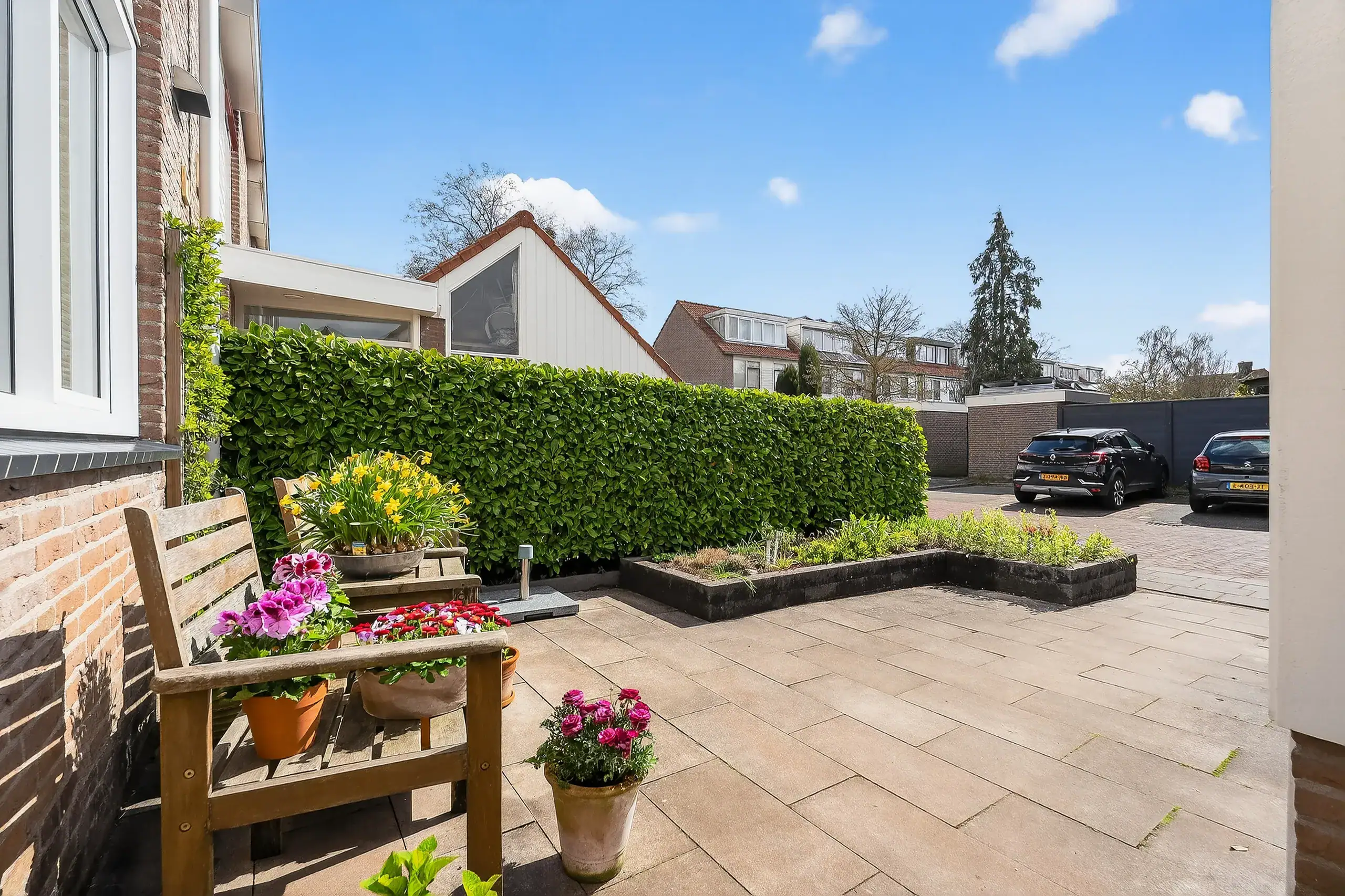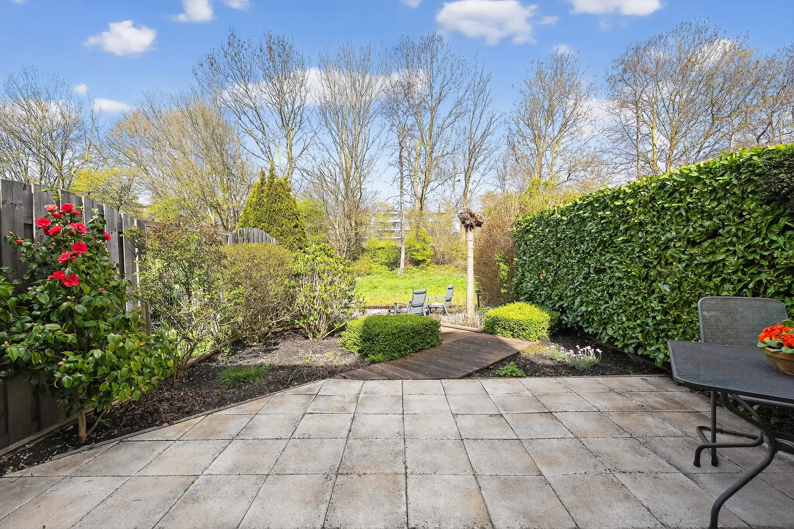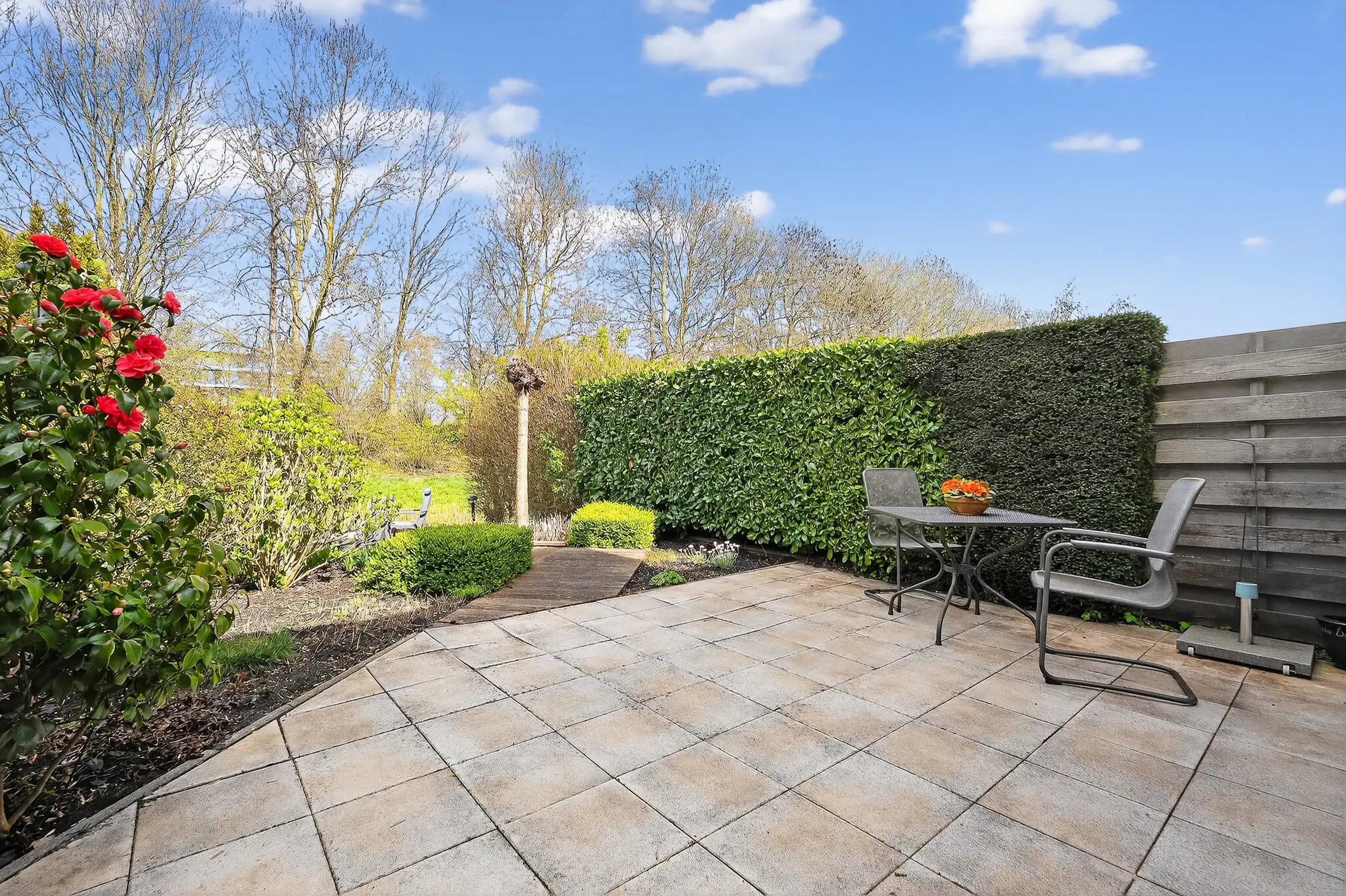 The beautifully landscaped rear garden, designed by a landscape architect, is a true eye-catcher and offers several pleasant seating areas. Directly adjacent to the house is a spacious terrace, while a second, lower terrace by the water is accessible via a playful wooden-stepped staircase. This allows you to enjoy sun and tranquility at any time of the day.