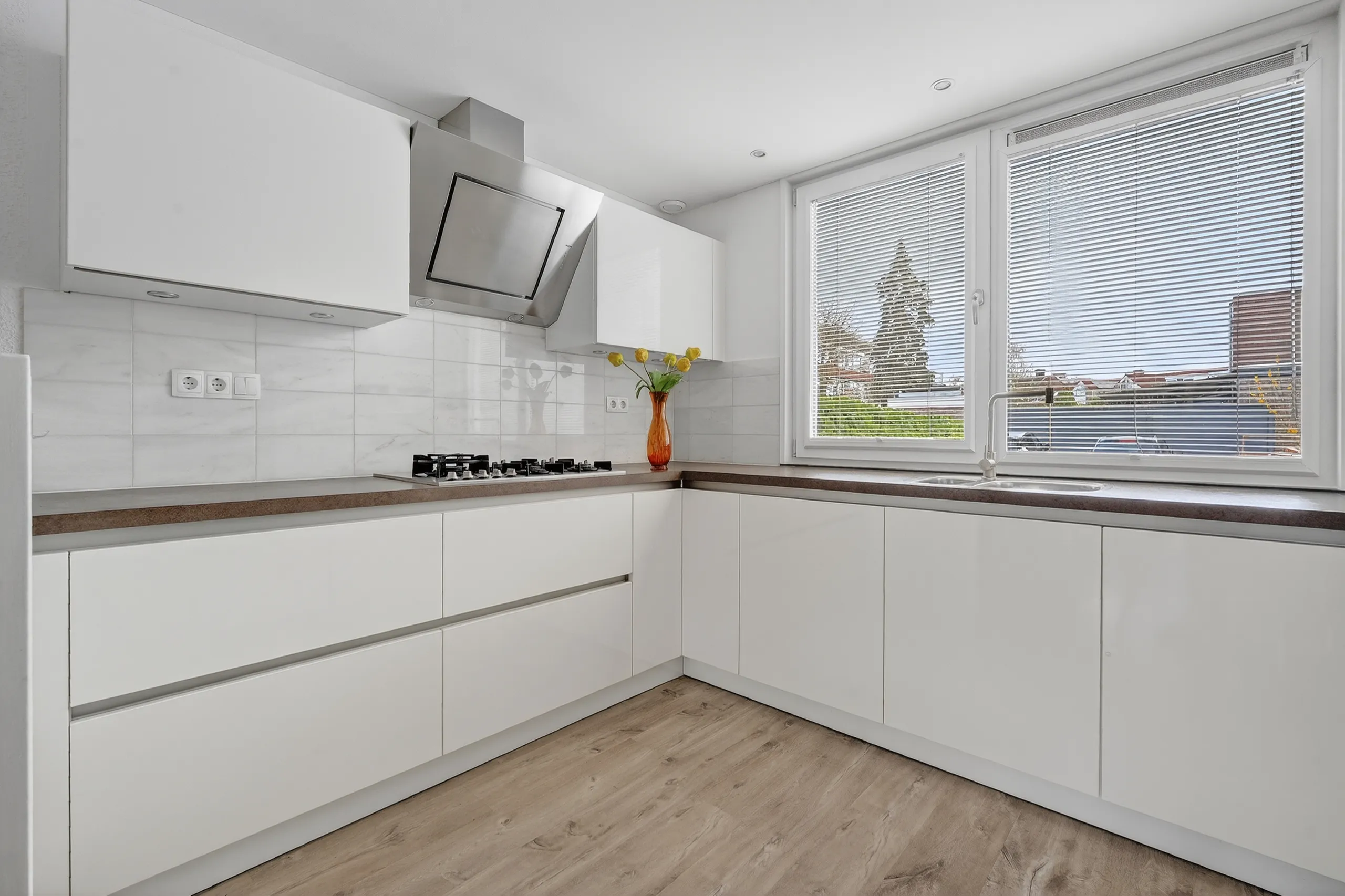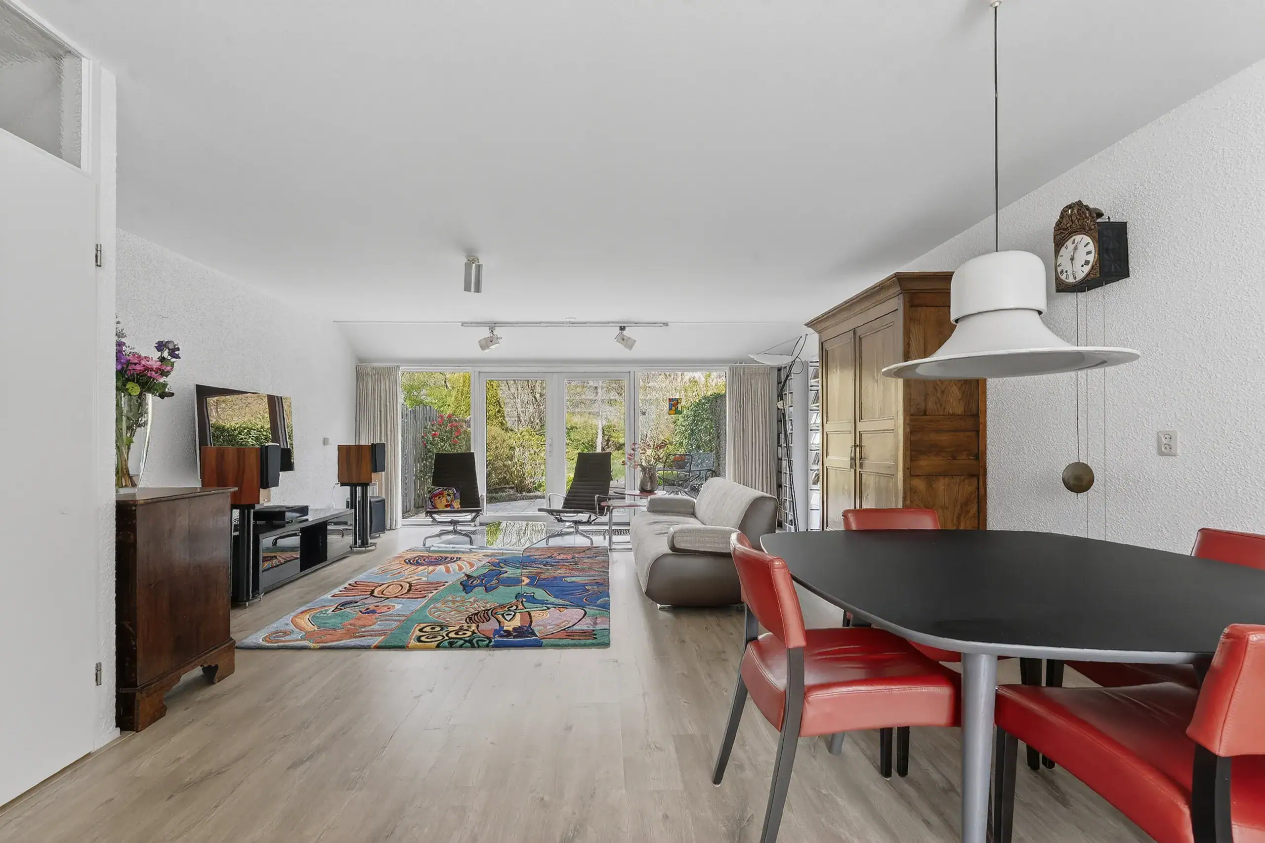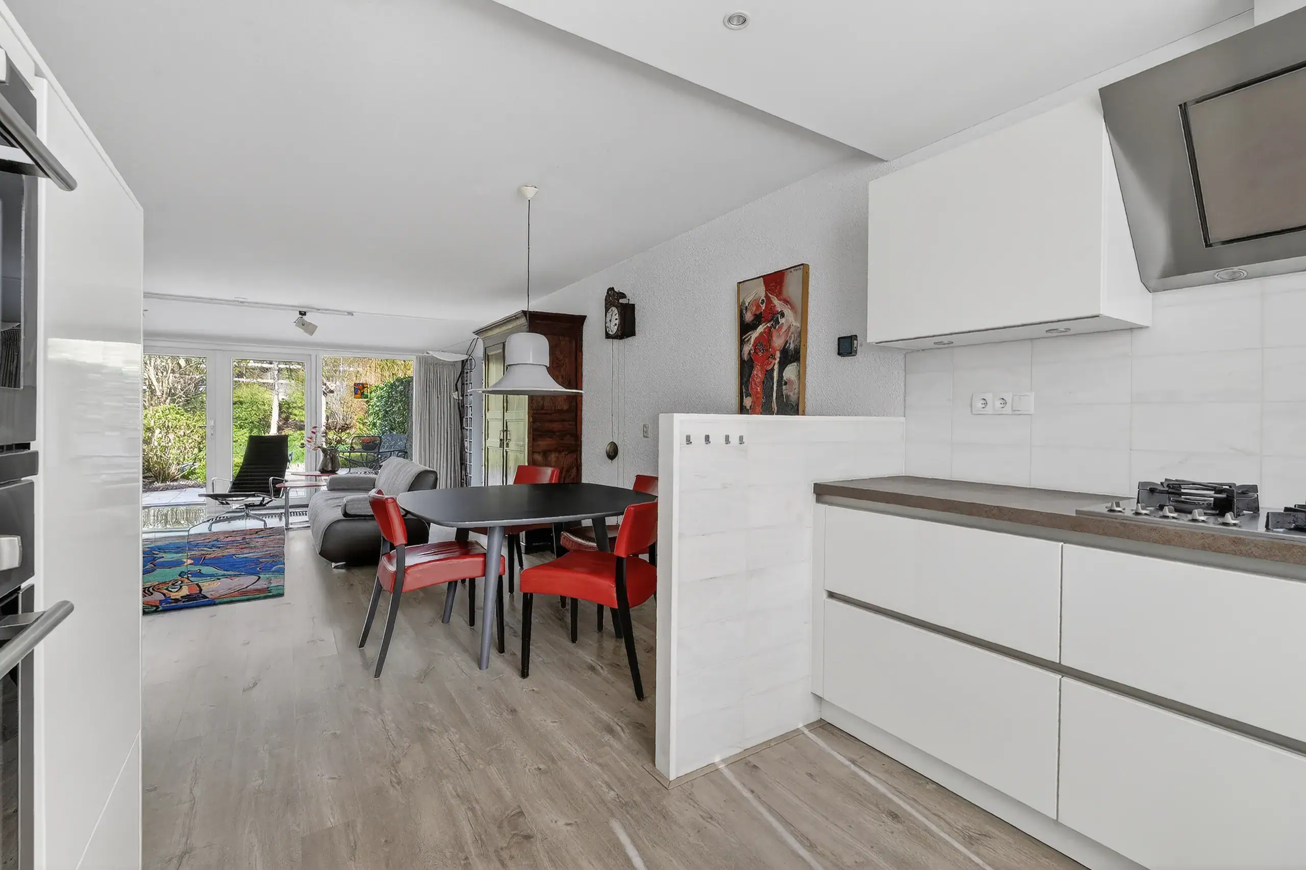 Upon entering, you arrive at a neat entrance hall with cloakroom space, a utility meter cupboard (equipped with a smart meter and fiber optic connection), and a separate toilet. From the living room, there is access to a practical under-stairs storage cupboard. The kitchen at the front of the house is finished in a light color scheme and equipped with various built-in appliances. The spacious and bright living room, together with the dining area, forms one open space and, thanks to the large windows and French doors, offers a beautiful connection to the garden. The layout is playful and offers plenty of possibilities for a comfortable seating area and a generous dining area. The French doors are fitted with screens and provide direct access to the terrace and the deep rear garden.