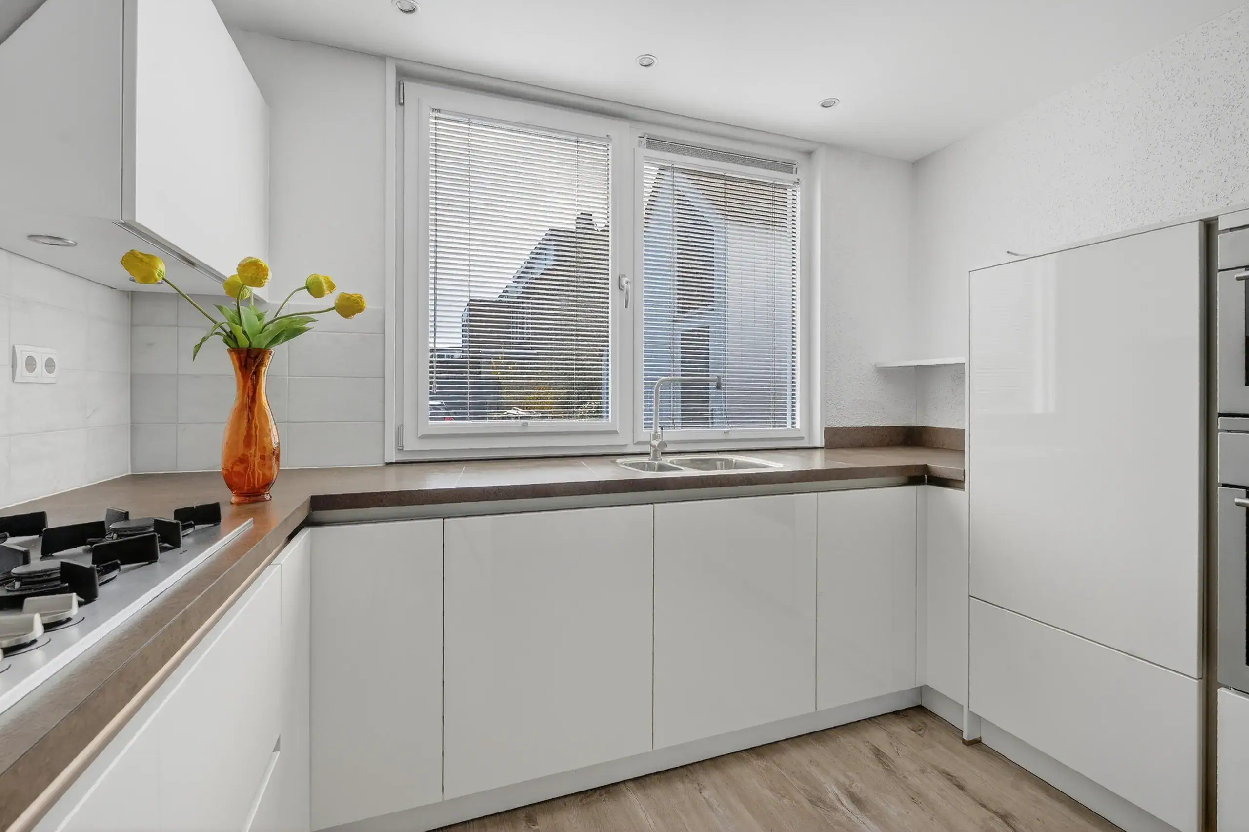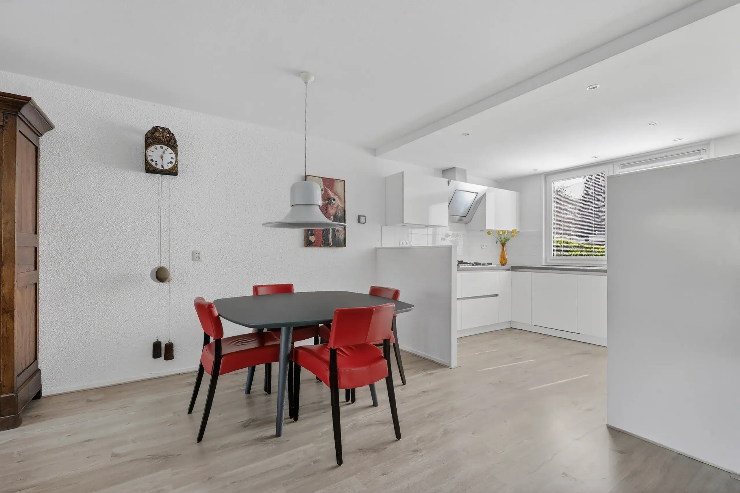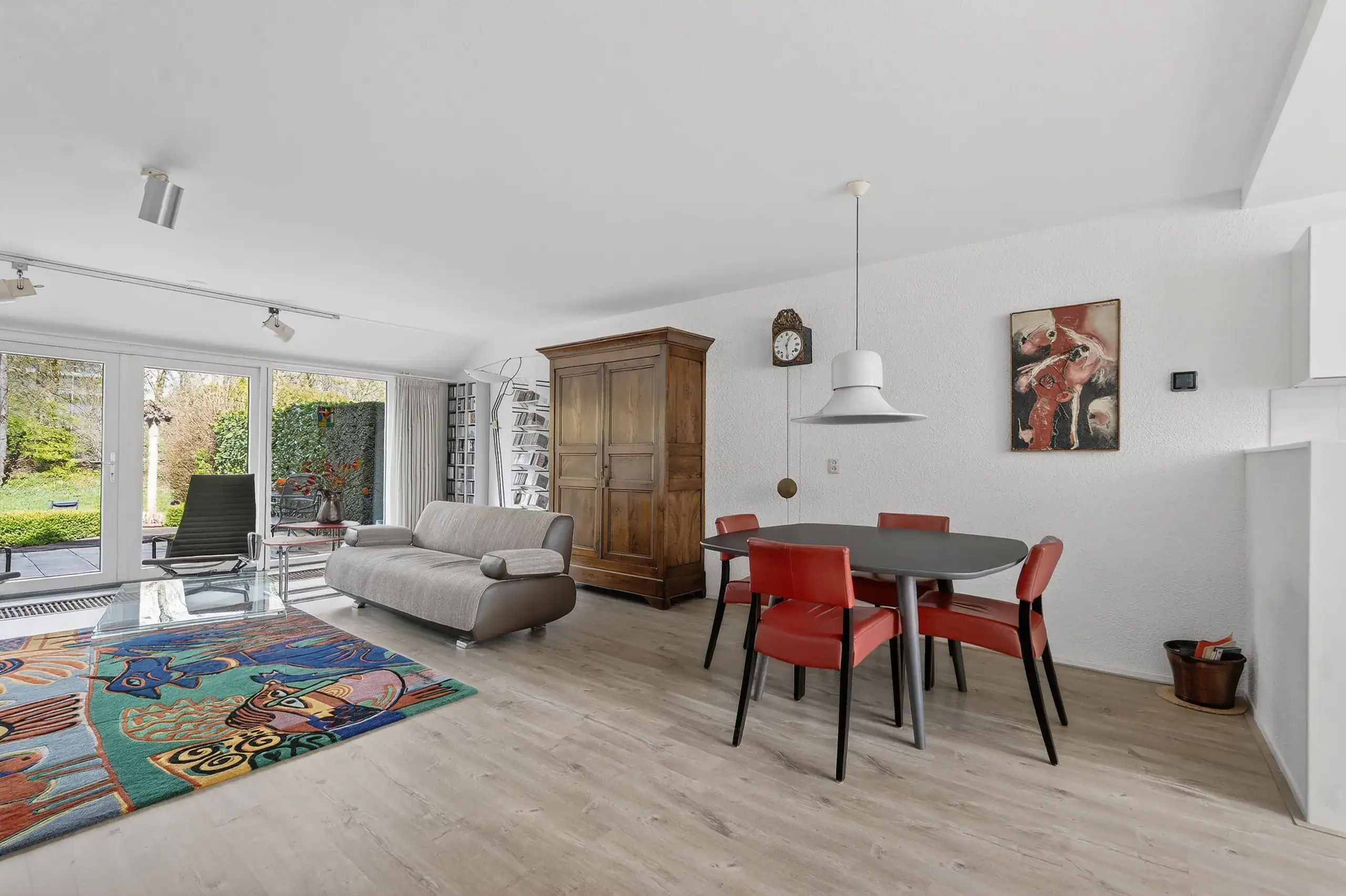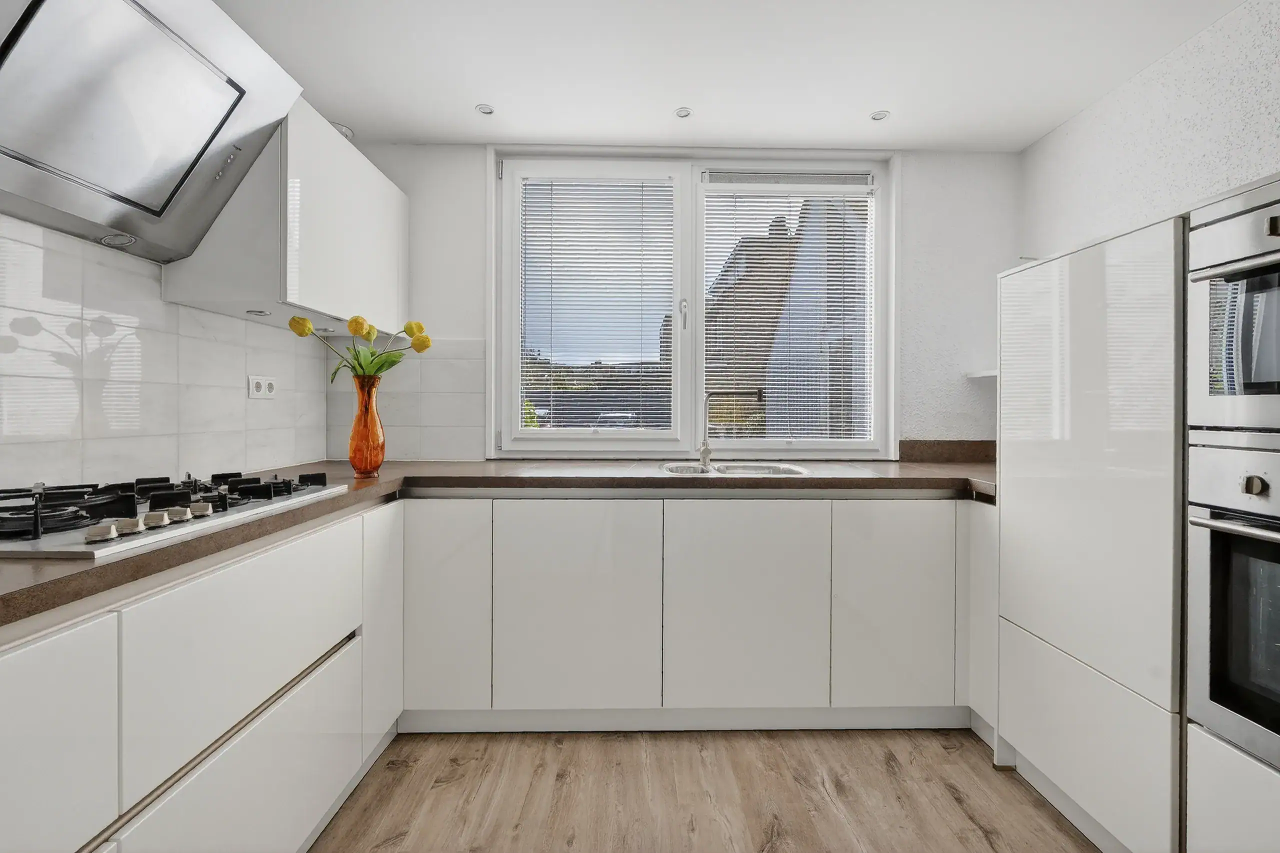 Upon entering, you arrive at a neat entrance hall with cloakroom space, a utility meter cupboard (equipped with a smart meter and fiber optic connection), and a separate toilet. From the living room, there is access to a practical under-stairs storage cupboard. The kitchen at the front of the house is finished in a light color scheme and equipped with various built-in appliances. The spacious and bright living room, together with the dining area, forms one open space and, thanks to the large windows and French doors, offers a beautiful connection to the garden. The layout is playful and offers plenty of possibilities for a comfortable seating area and a generous dining area. The French doors are fitted with screens and provide direct access to the terrace and the deep rear garden.