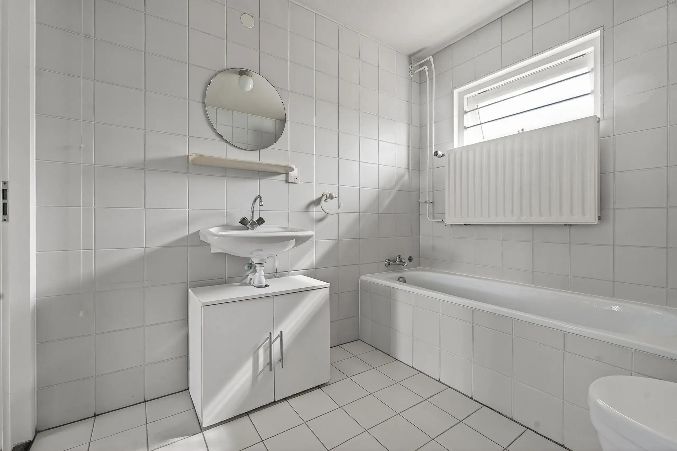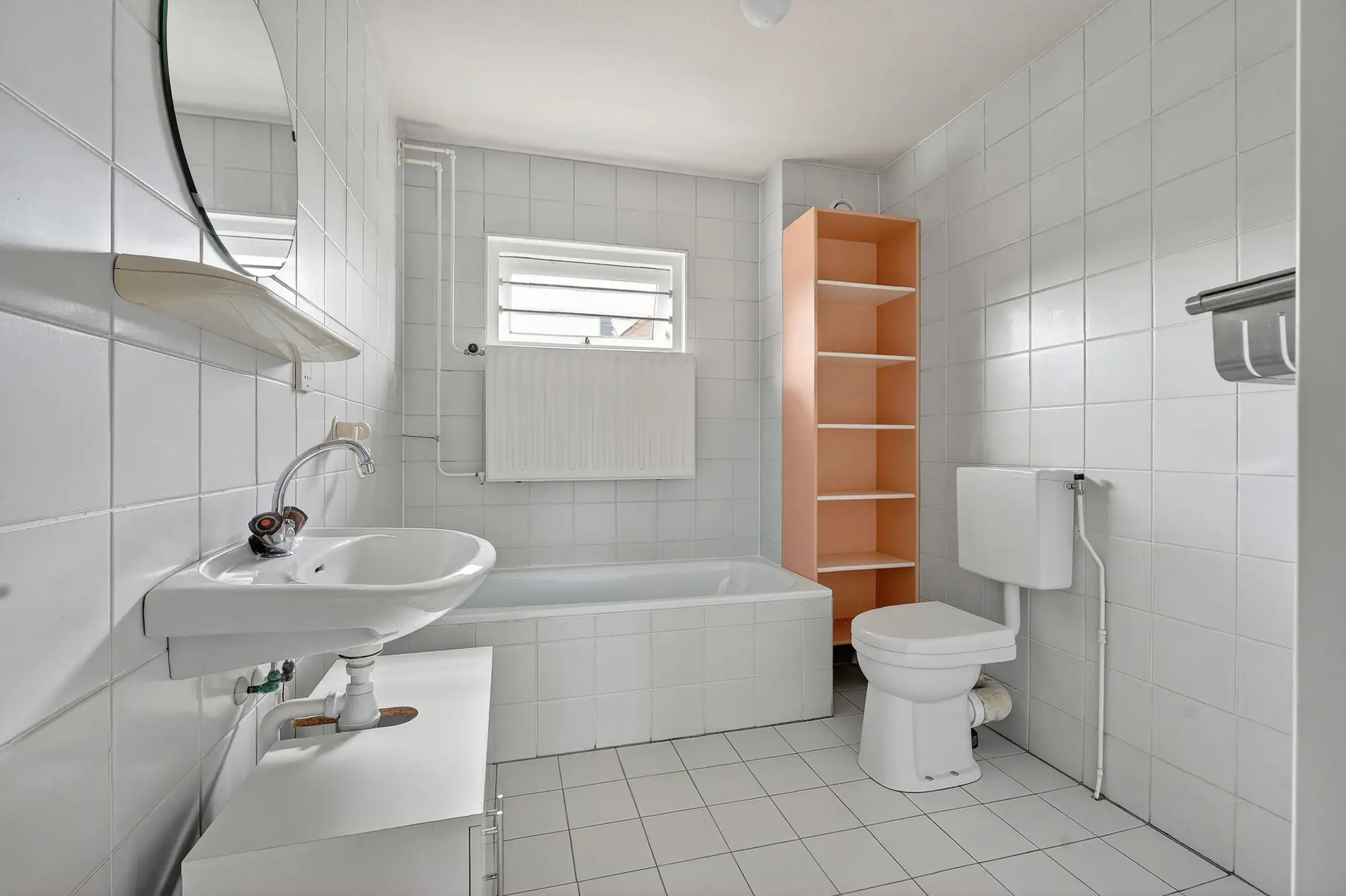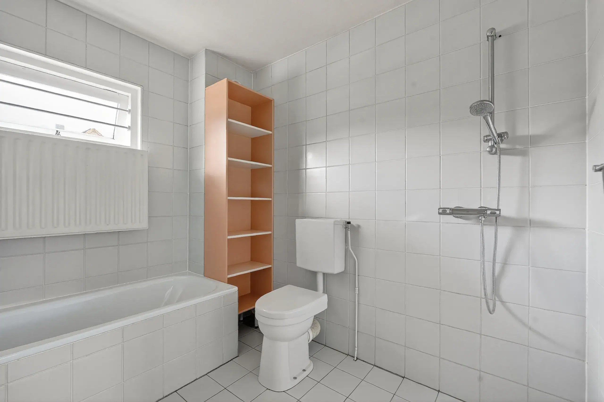 At the front is the second, also generously sized bedroom, which can be efficiently divided and adapted to various living requirements. The bathroom is compact but complete, featuring a shower, bathtub, sink, and toilet. Everything is functionally arranged and provides a good base for modernization according to personal taste.