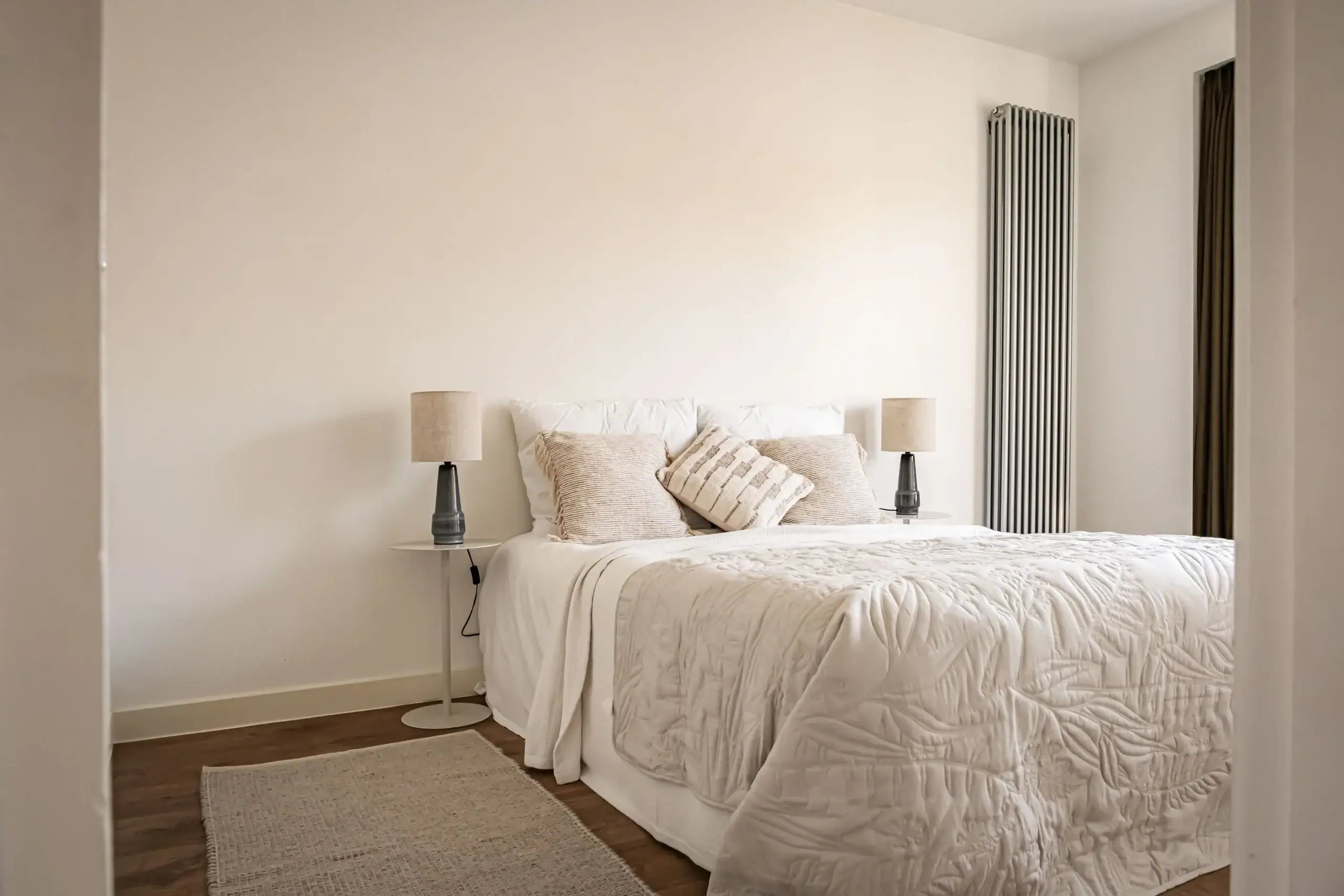 At the rear, there are two additional bedrooms, both with access to a west-facing balcony. This floor also features a handy storage room with the central heating system, washer, and dryer.