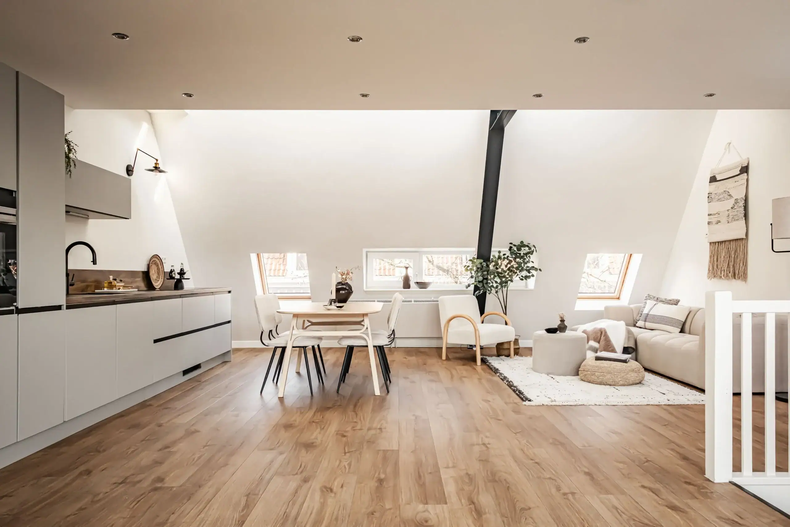 This floor, with partially higher ceilings, houses the expansive living room with an open kitchen. Large windows at the rear and several skylights provide abundant natural light. There are French doors leading to the first roof terrace (approx. 12 m²) facing west.