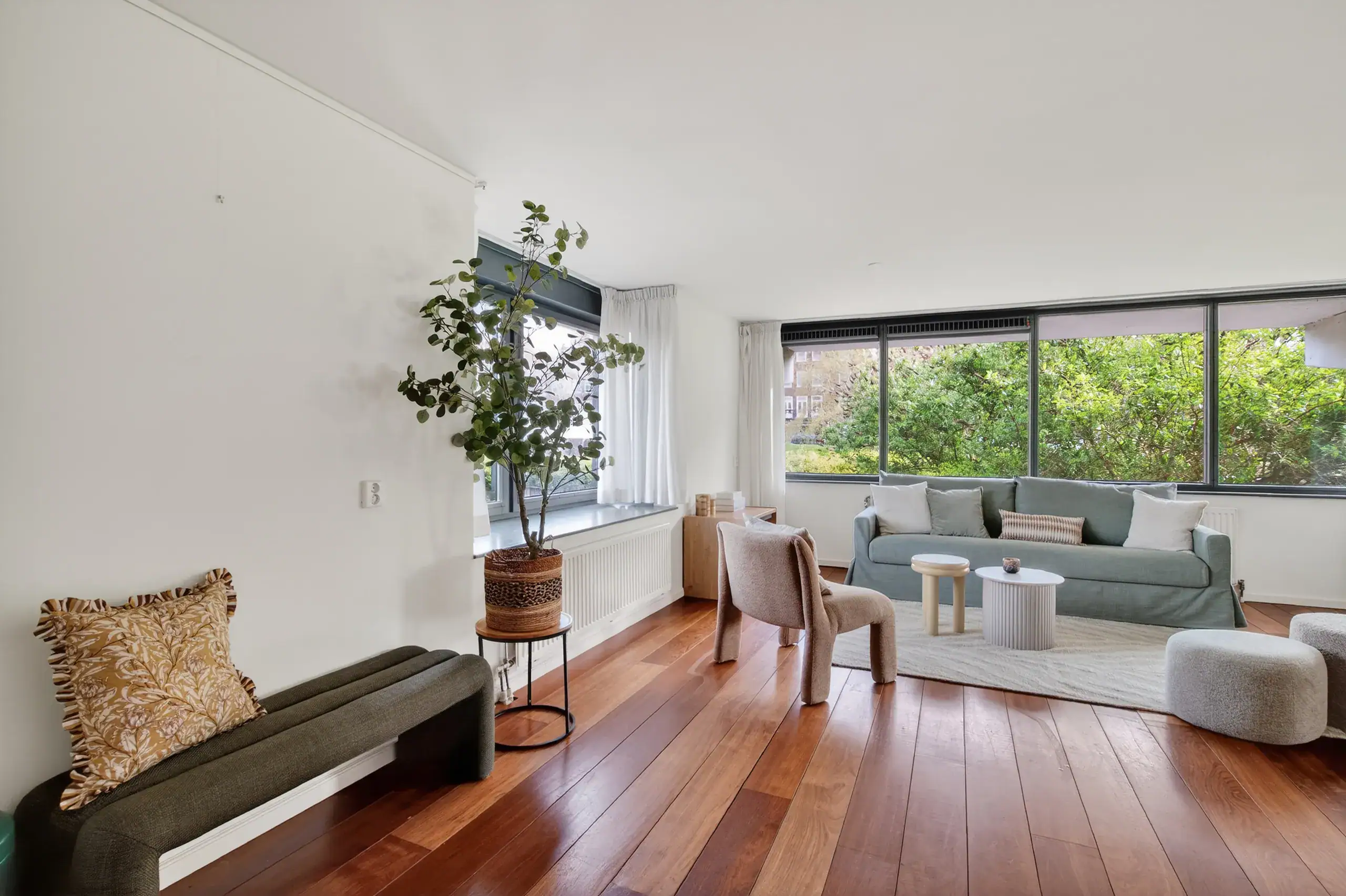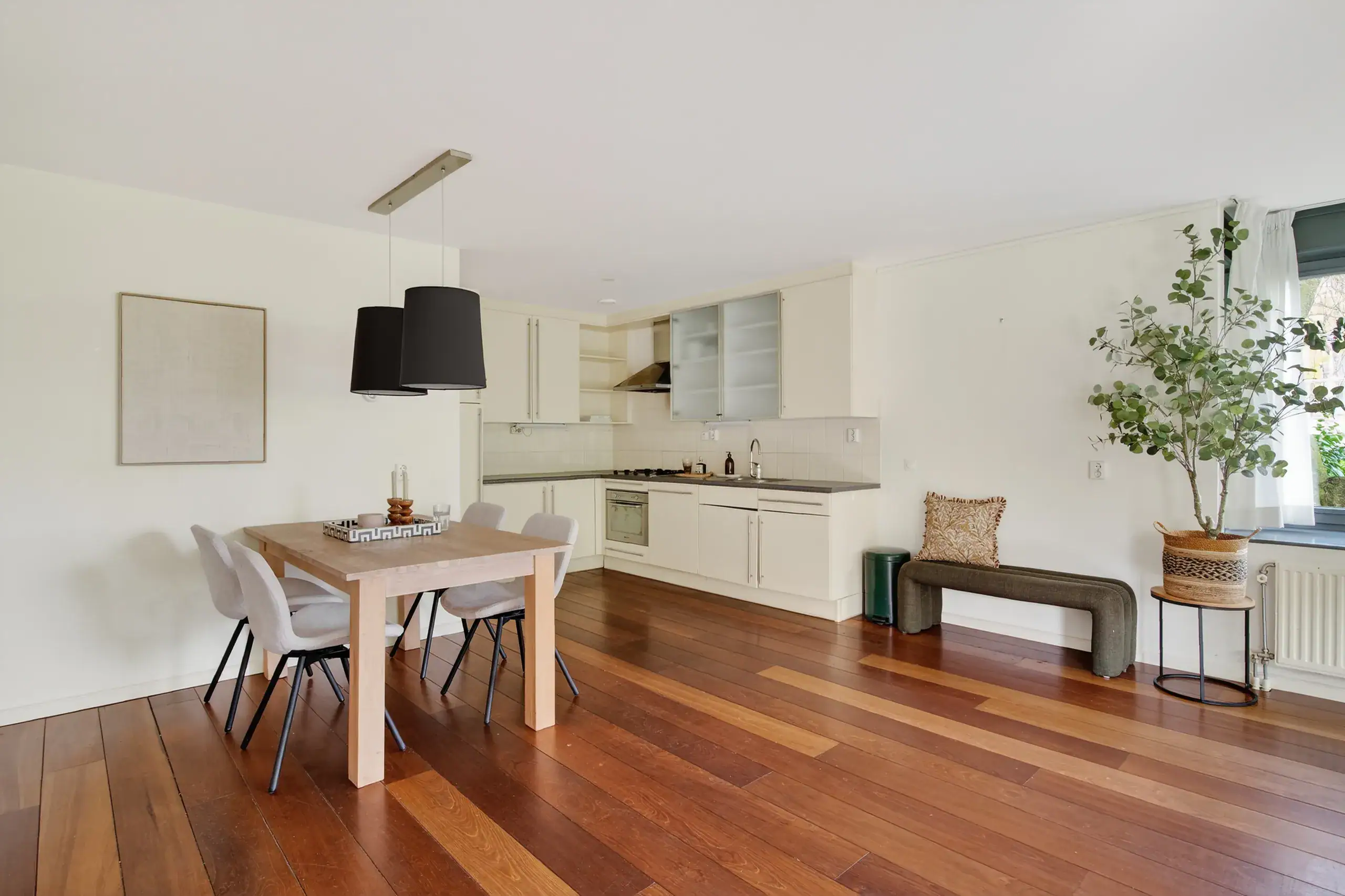 At the end of the hallway, you enter the spacious and bright living room with an open-plan kitchen located at the rear of the apartment. The living room is characterised by large windows overlooking the greenery, providing pleasant natural light and a welcoming atmosphere. The open kitchen is fitted with various built-in appliances and connects seamlessly to the dining and living area.