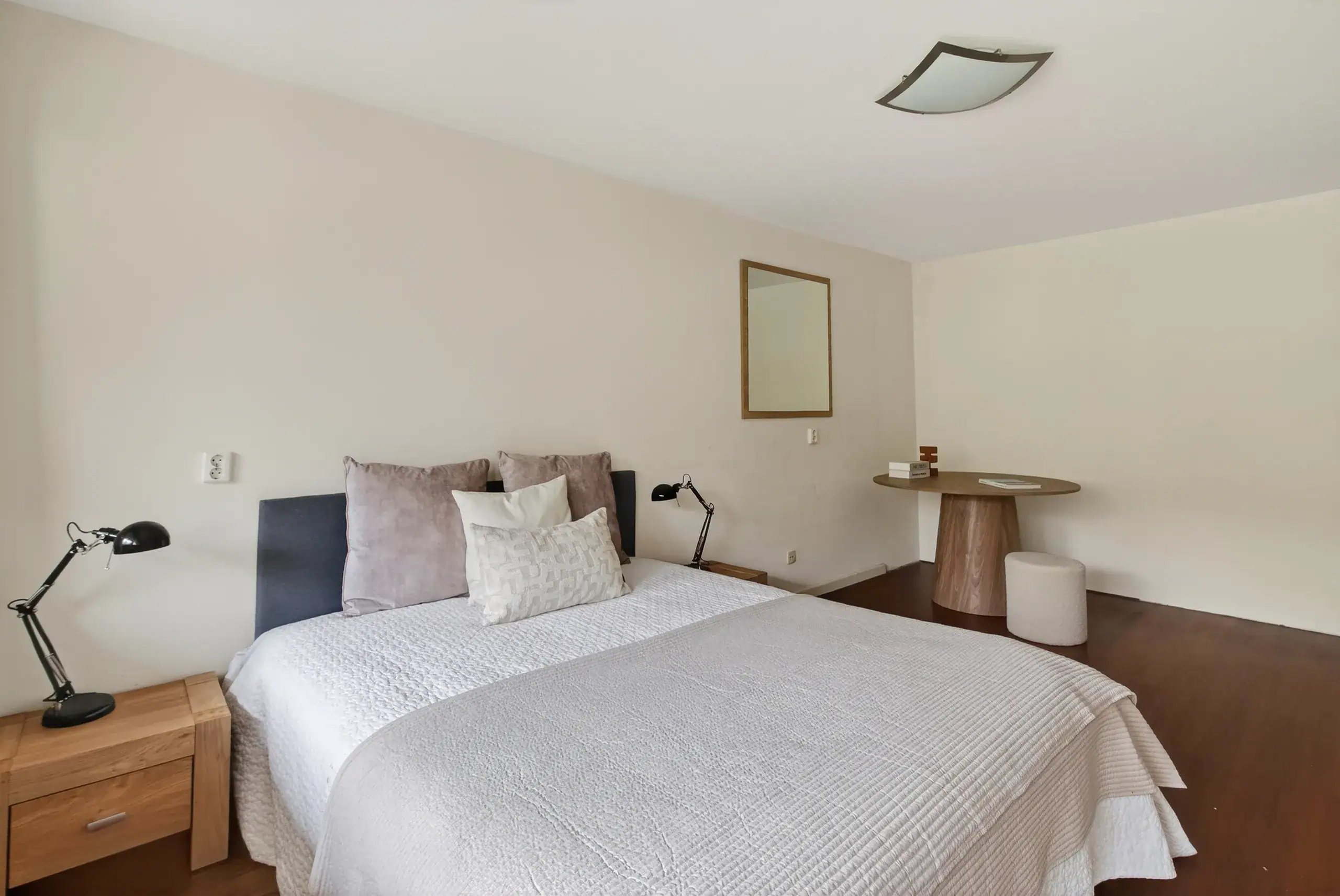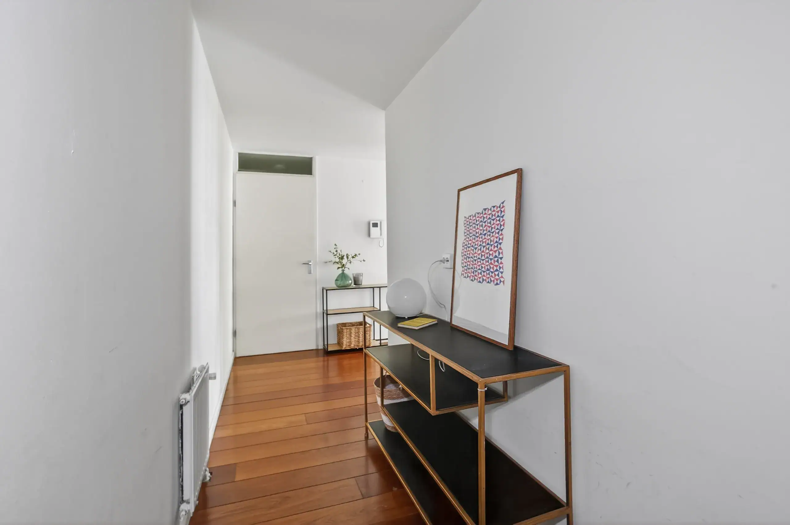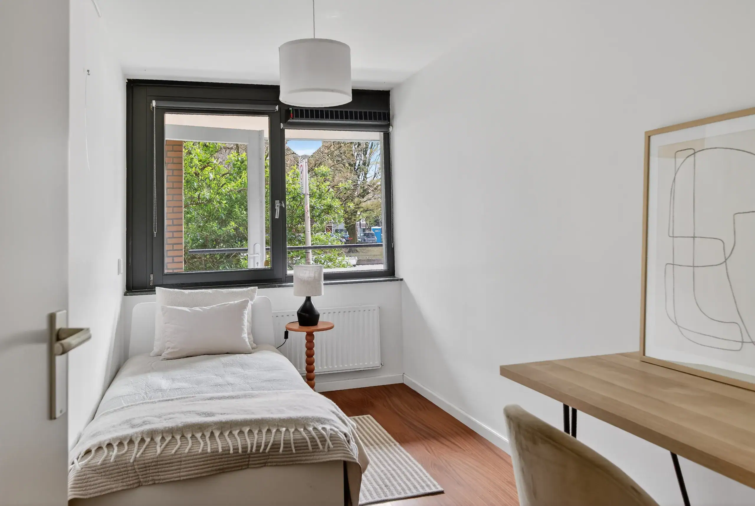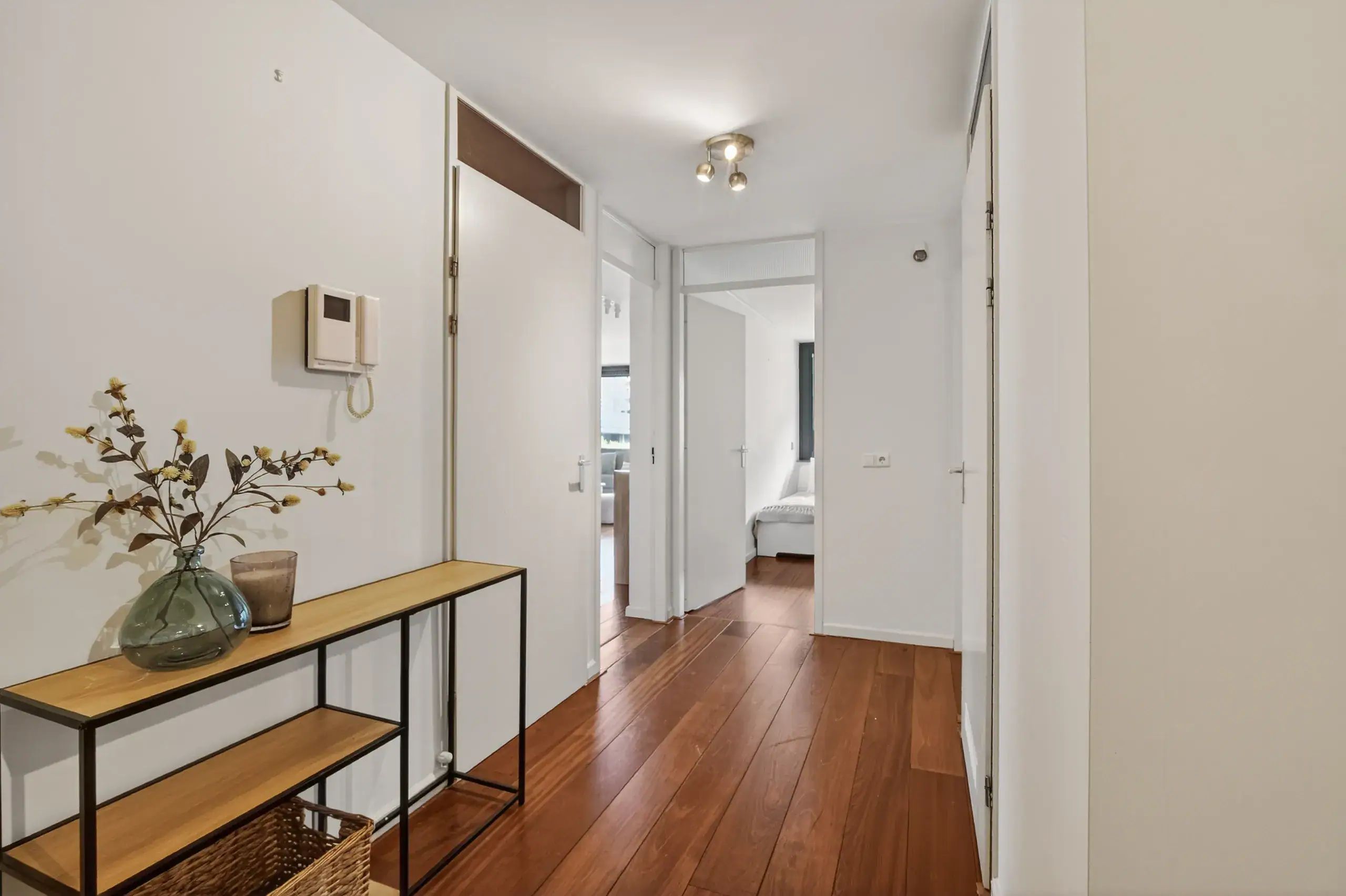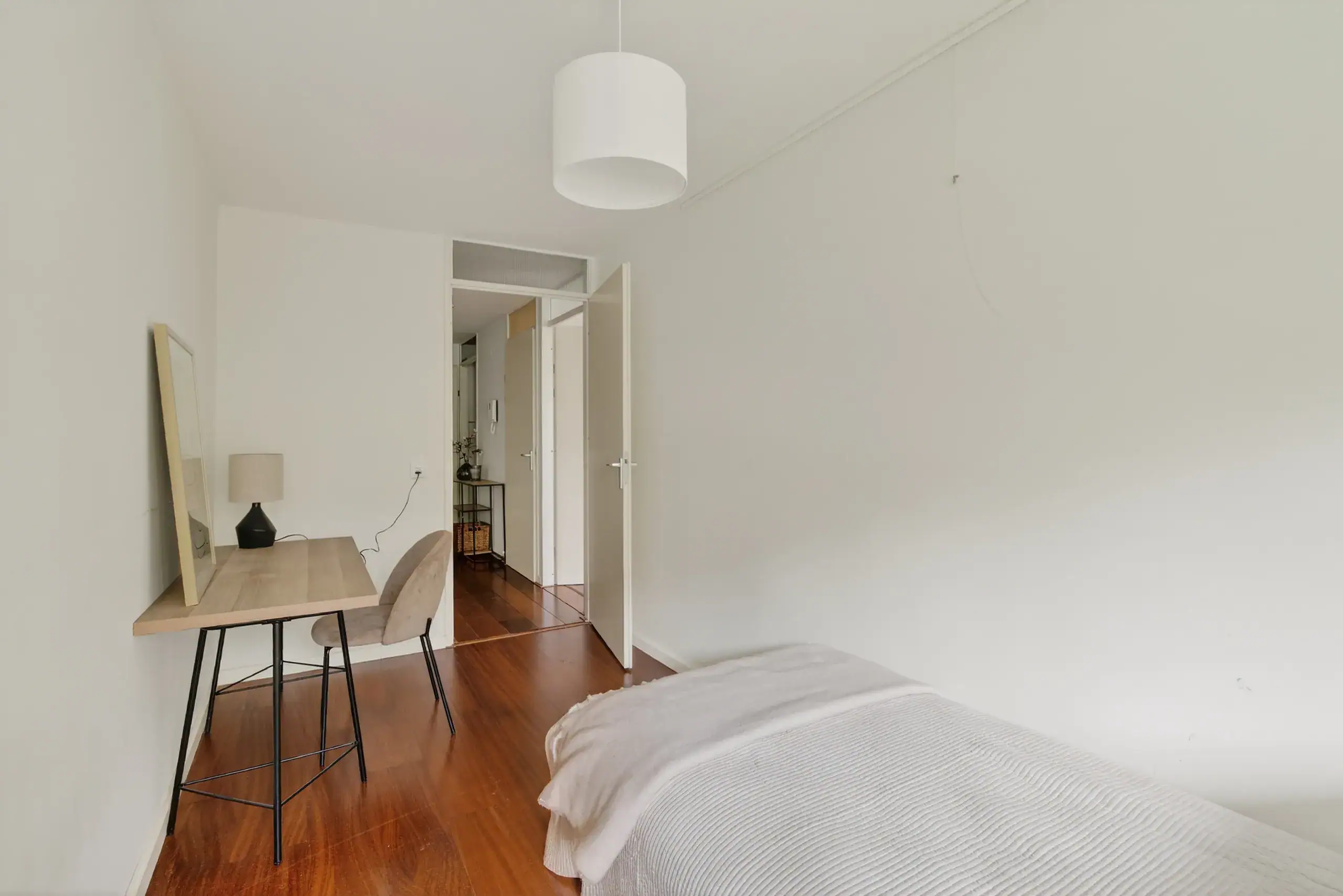 The apartment is accessed via a communal entrance. Upon entering, you arrive in a spacious and well-organised hallway that provides access to all rooms. Here you will find two well-proportioned bedrooms. The generous master bedroom stands out due to its ample space, while the second bedroom offers enough room for a bed and a desk.