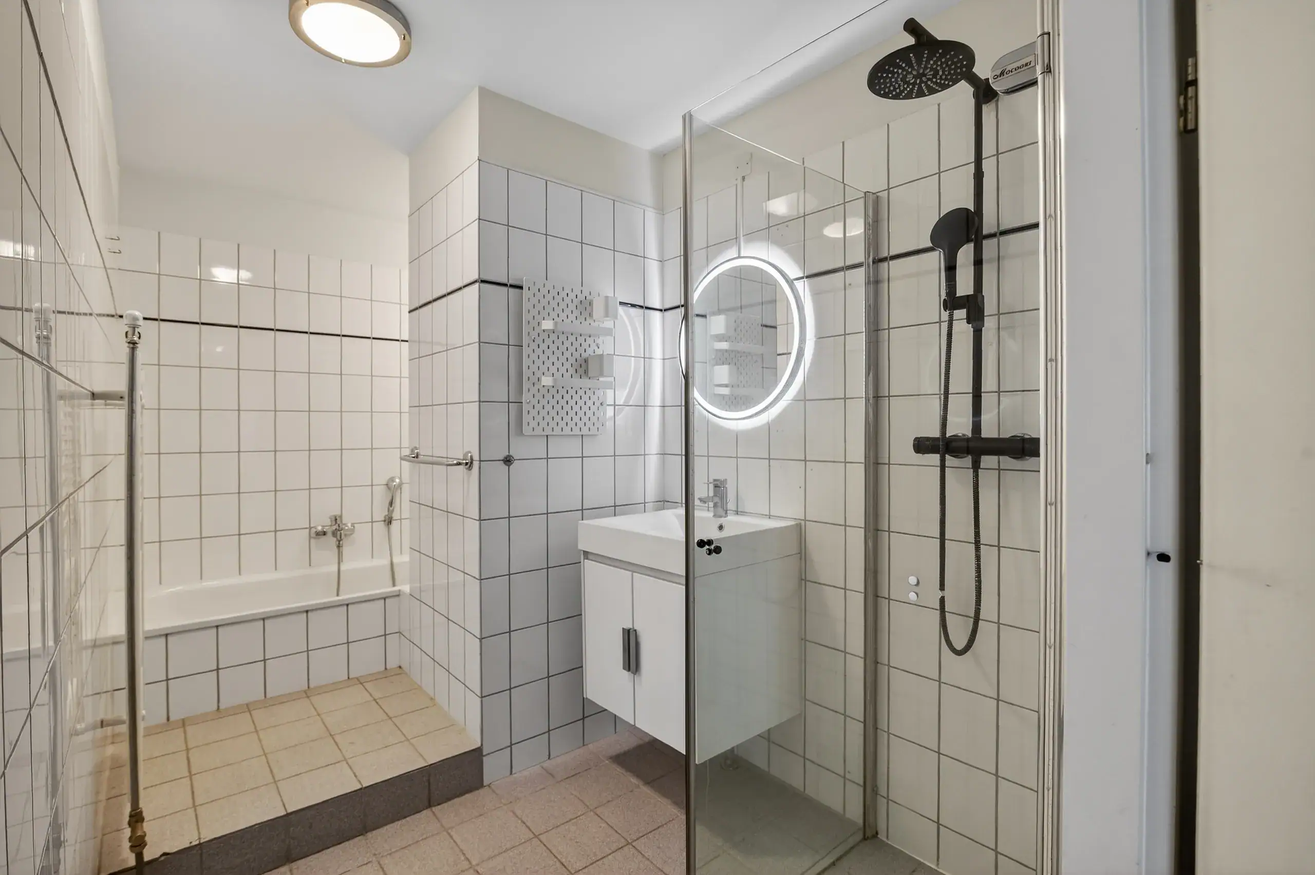 The hallway also leads to the bathroom, which is equipped with a bathtub, separate shower, washbasin unit, and radiator. The separate toilet is also accessible from the hallway. In addition, there is a practical storage/laundry room with connections for a washing machine and dryer.