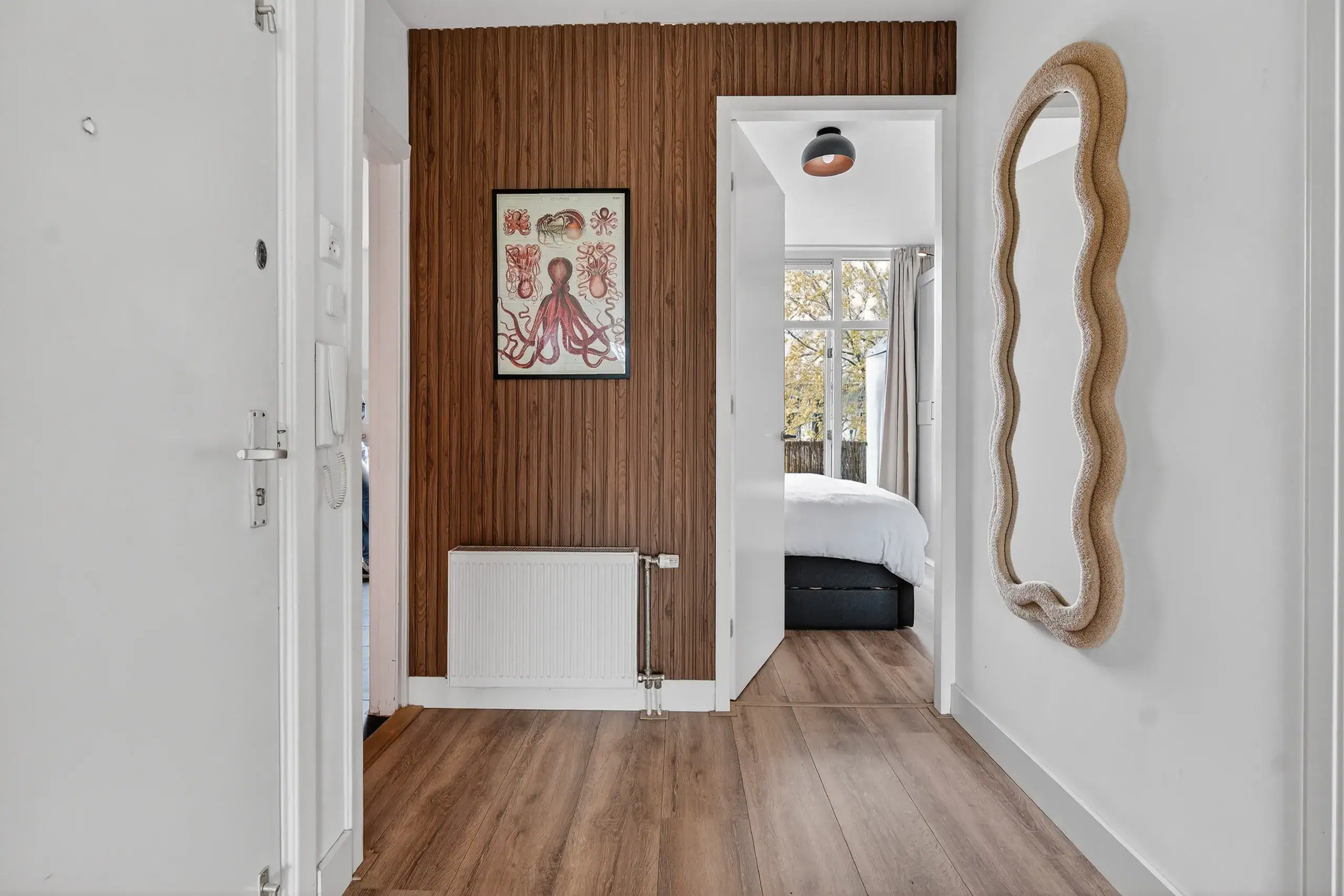 The main bedroom, located at the rear, features air conditioning and French doors leading to the balcony. Built-in wardrobes create a clean and streamlined look. The second (bed)room is also well-sized and offers flexibility for various living needs. Currently set up as a workspace, this room—along with the hallway—features stylish slatted wall panels that add a contemporary and warm character.