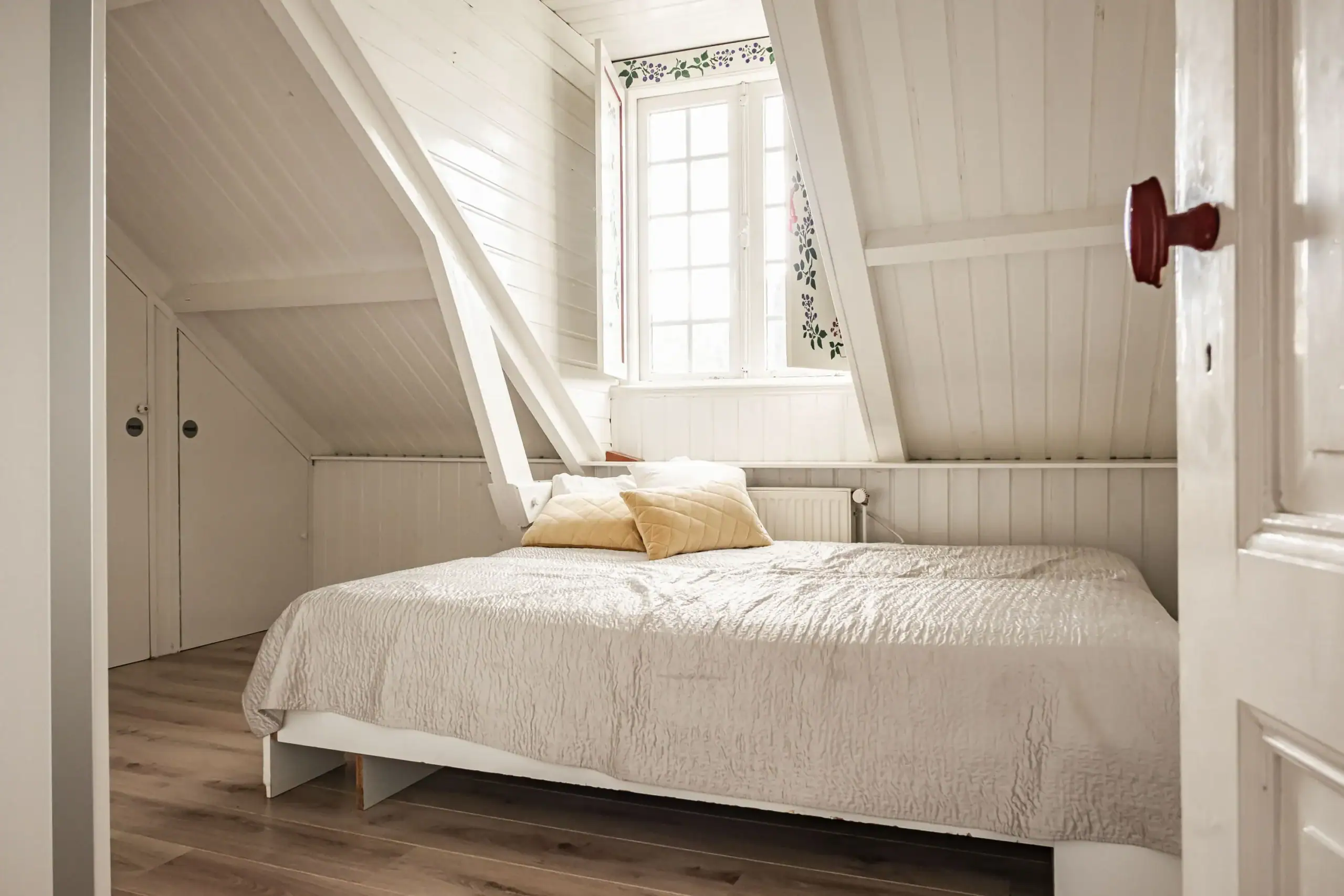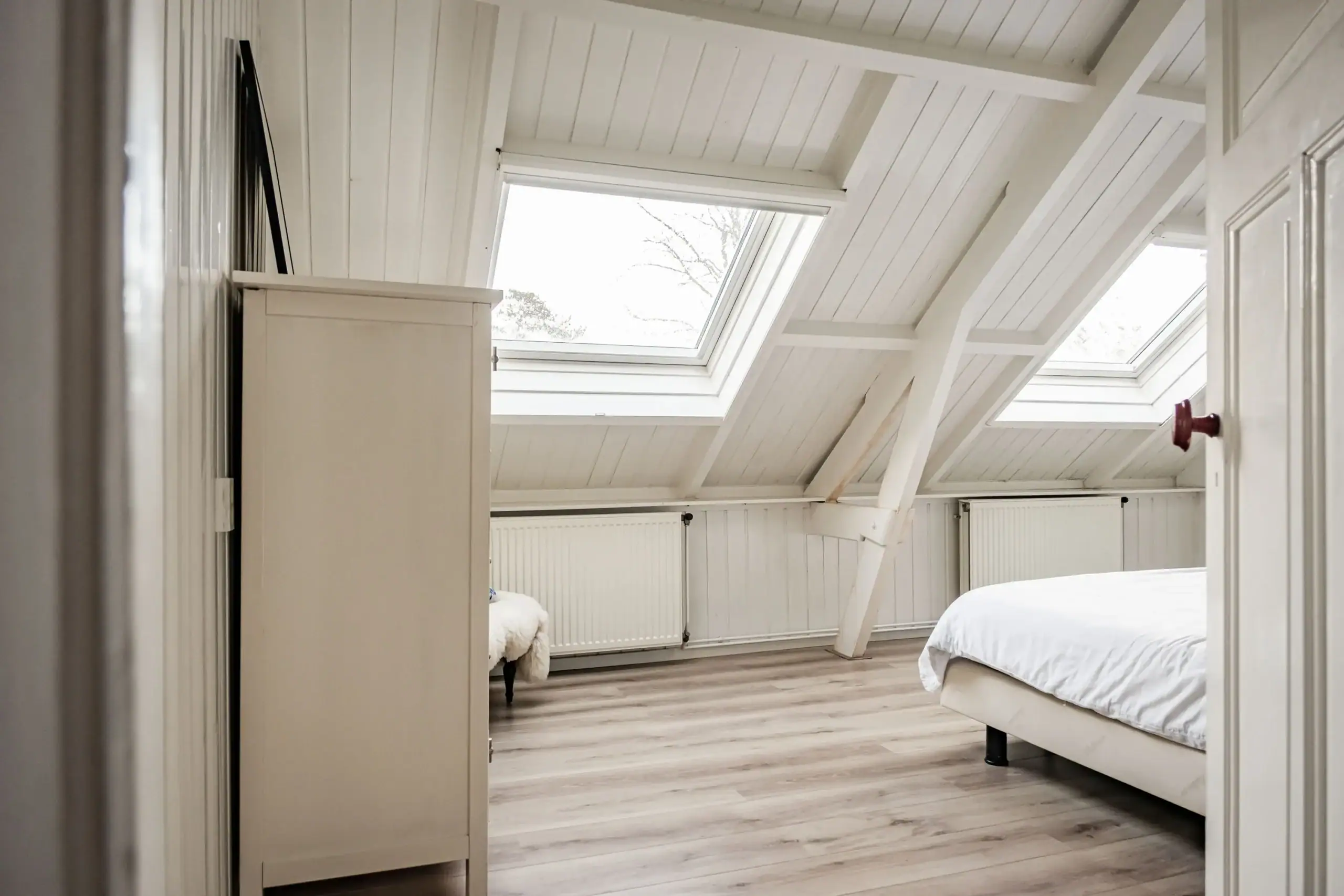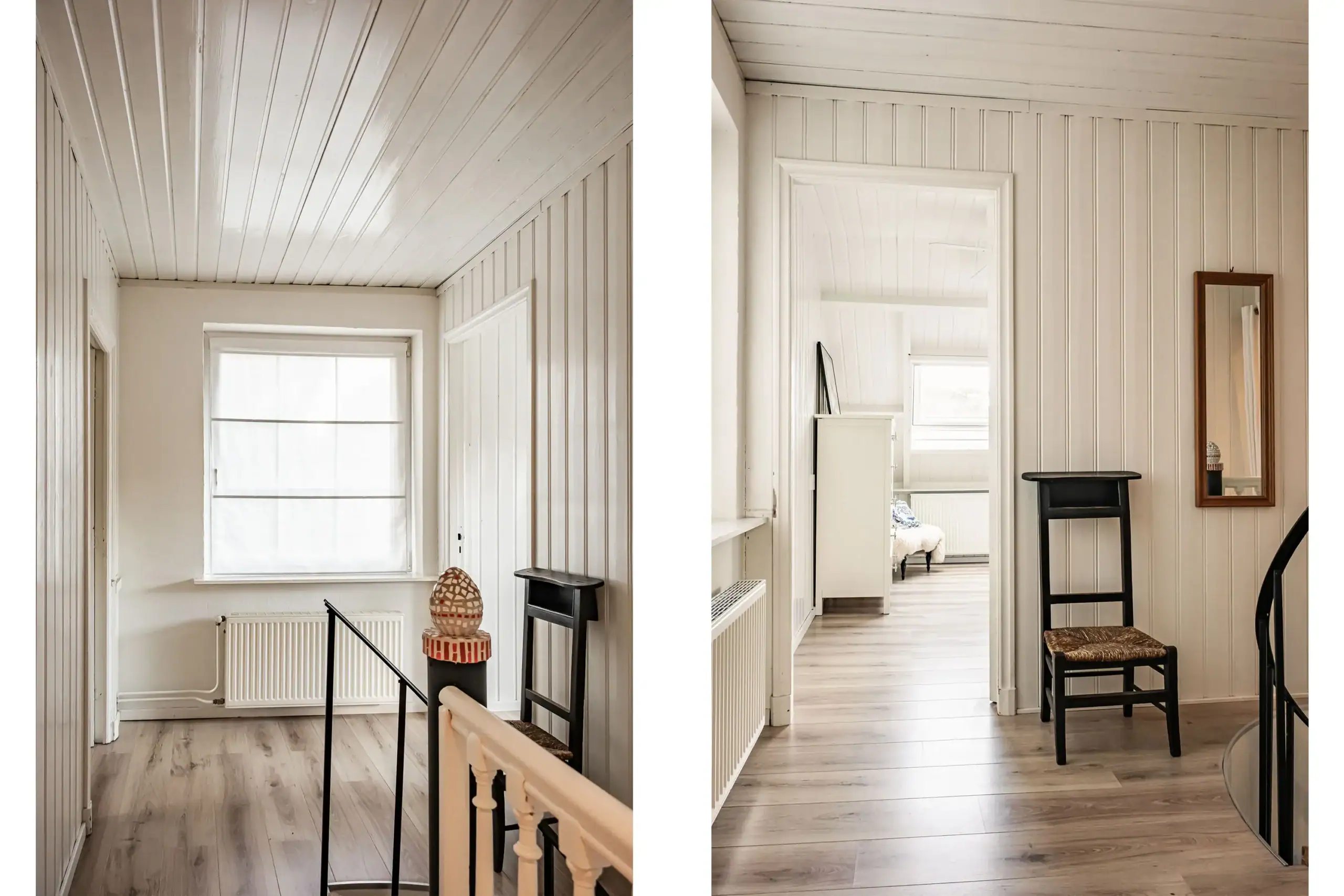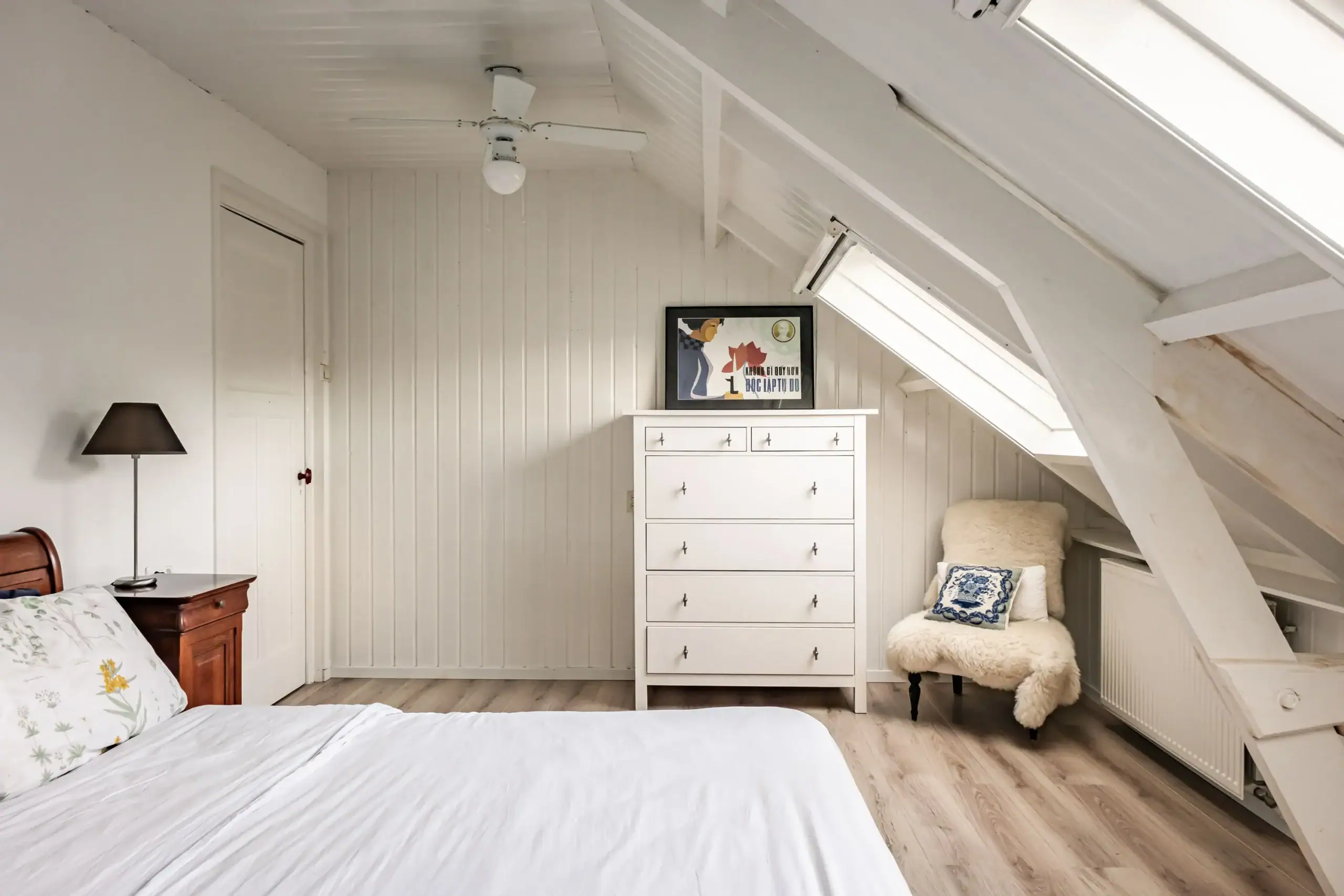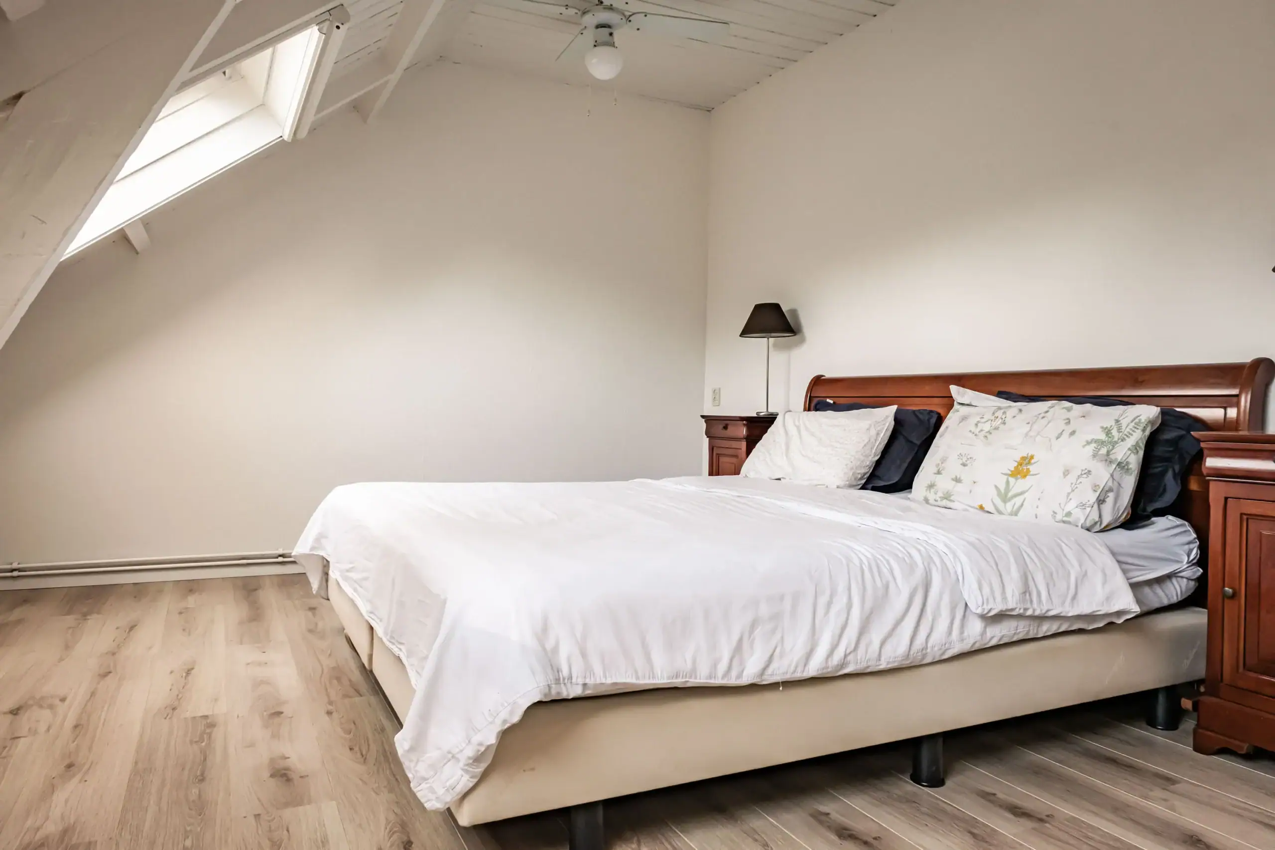 Bright landing. Large bedroom at the rear with two Velux roof windows; easily divisible into two comfortable (bed)rooms thanks to the layout. Neat bathroom with washbasin, WC and shower. Spacious front bedroom with dormer window and built-in cupboards for washing machine and tumble dryer.