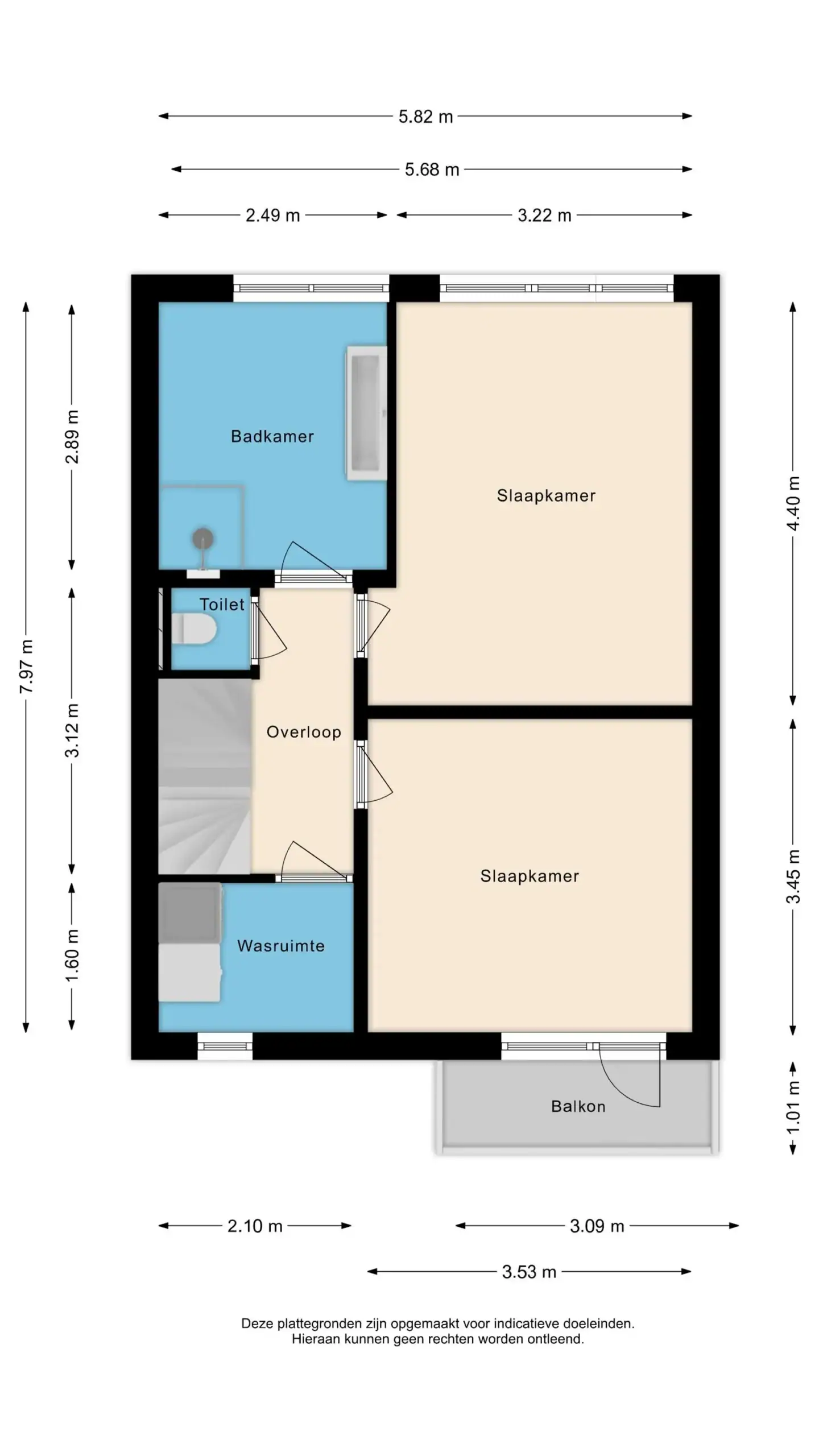 Via the landing you have access to two bedrooms, the laundry room, the bathroom, and the separate toilet. The bathroom was moved to another room in 2019 and completely renovated. The stylish tiles on both the walls and the floor create a chic appearance and form a beautiful whole. The bathroom is equipped with a spacious walk-in shower with rain and hand shower, a washbasin cabinet with a natural stone top, and a mirror with lighting. The bedroom at the rear is the master bedroom: a spacious room with air conditioning and enough space for a large bed and wardrobe. The window in this bedroom is also fitted with a roller insect screen. The second bedroom is located at the front of the house and provides access through a single door, fitted with a screen door, to the sunny balcony. The separate laundry room is very practically arranged. Here you will find the connections for the washing machine and dryer and there is ample space to hang laundry and fold it on the convenient worktable.
