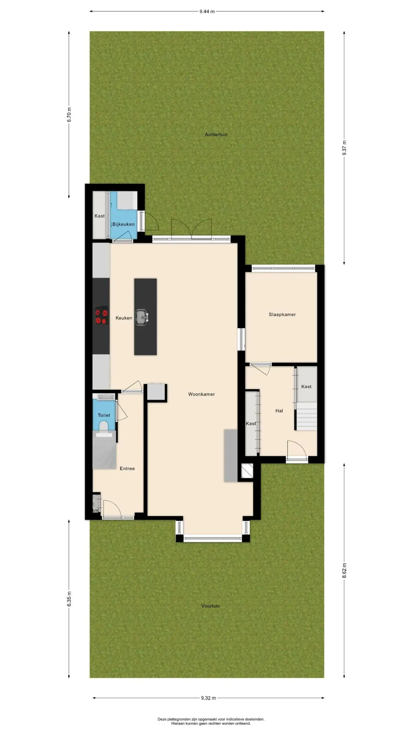 Through the French doors in the living room you reach the backyard. The garden has been carefully designed and maintained and features several pleasant terraces. In addition, the garden is equipped with lighting, a practical rear entrance, a hot water tap, and a regular outdoor tap. In the afternoon you can enjoy the sun here.