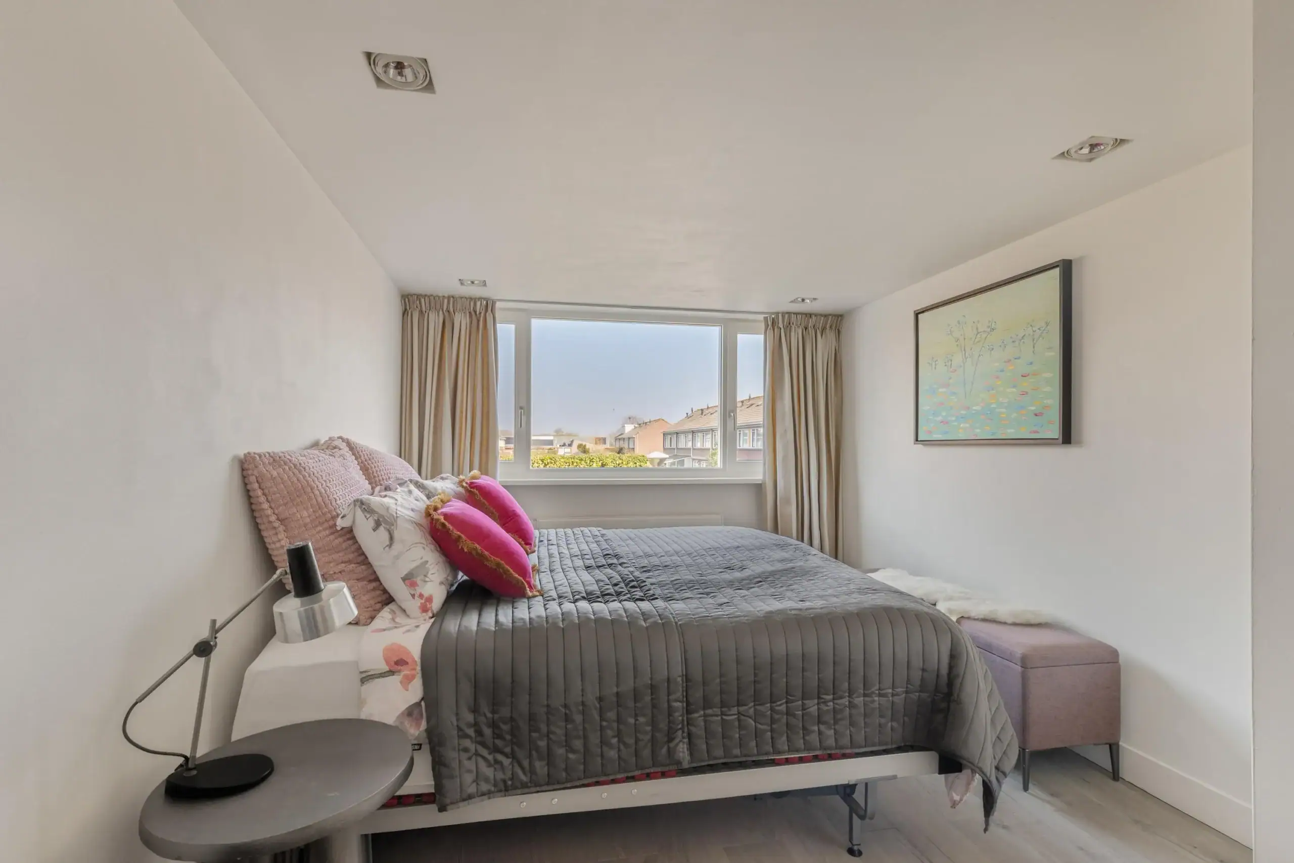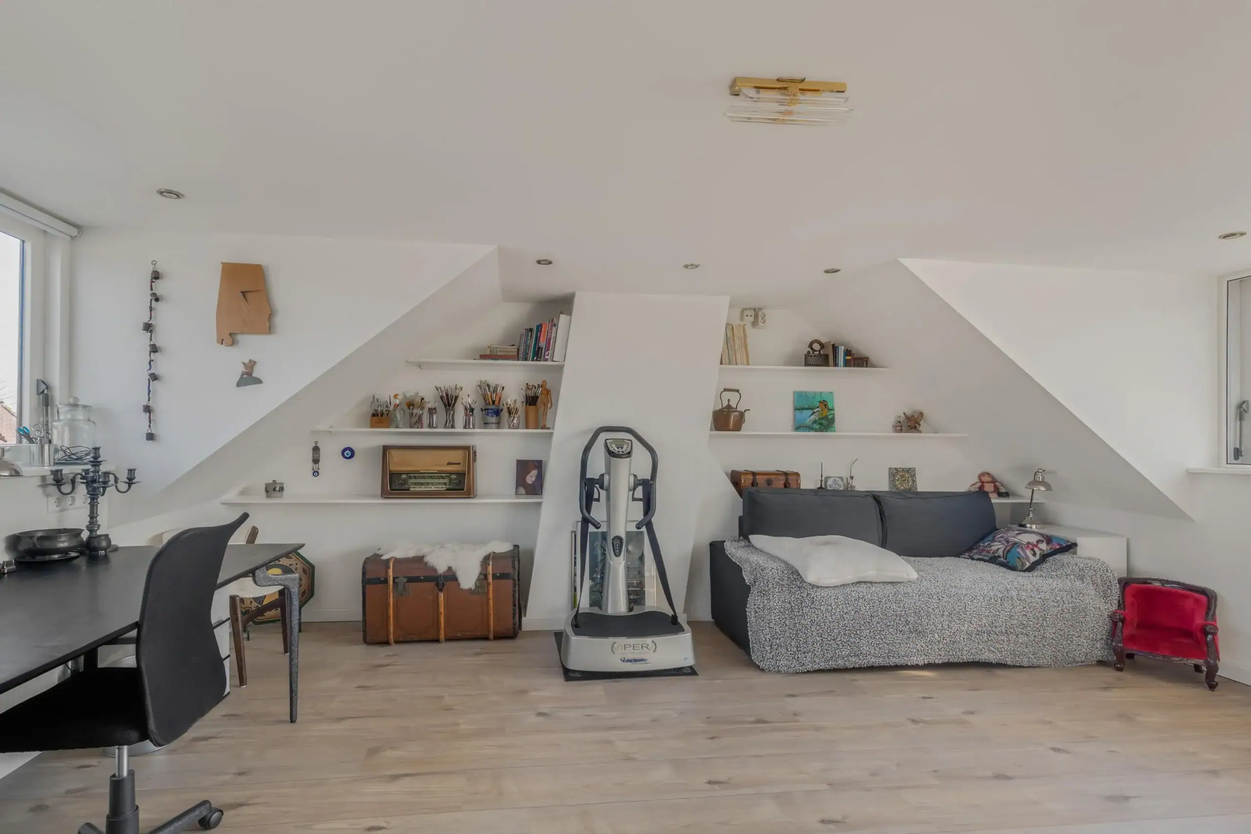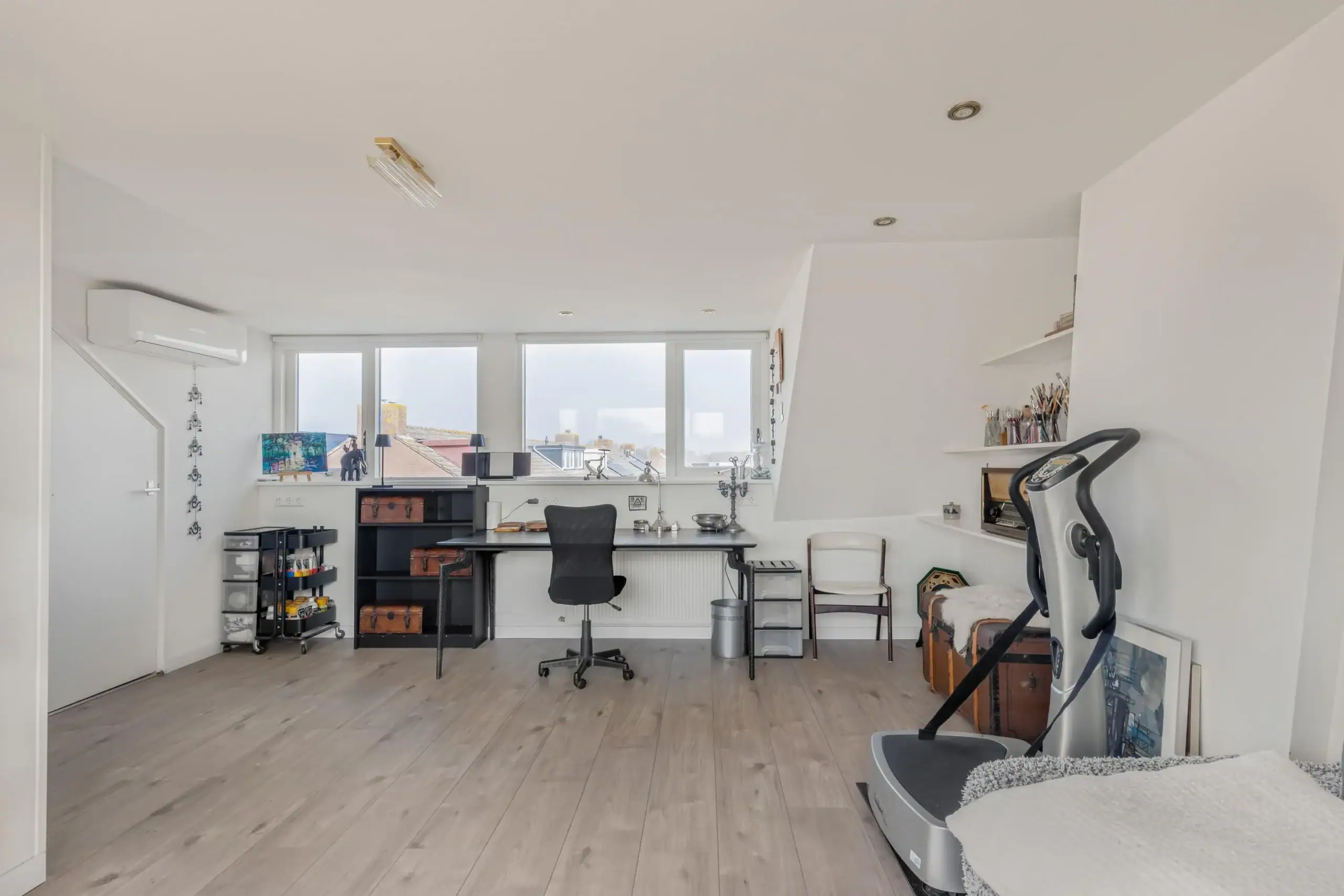 Spacious second floor with dormer windows at both the front and the rear, providing extra space and a pleasant amount of natural light in this beautiful room. This room is also equipped with air conditioning, ensuring the space remains comfortably cool during warm summer days. In addition, recessed spotlights have been installed in the ceiling and there is a dressing table. Behind the knee walls there is plenty of practical storage space. The central heating boiler is neatly concealed in a cabinet, where additional storage space is also available.