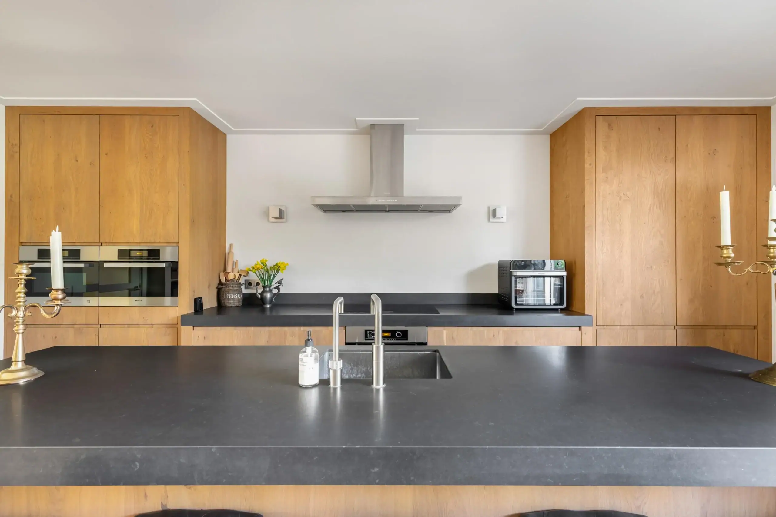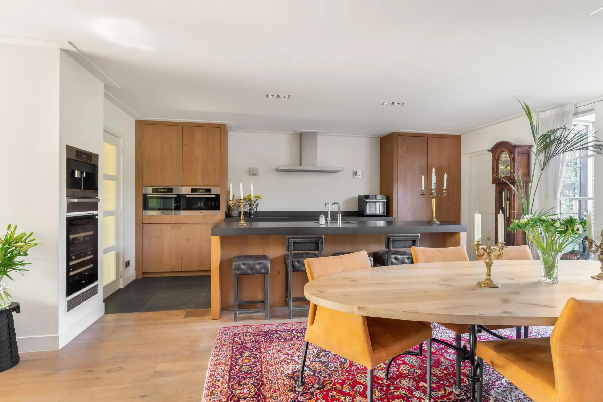 The beautifully landscaped front garden provides access to the entrance of the house. In the hallway there is a spacious toilet with washbasin, a place for the wardrobe, and the meter cupboard. Upon entering, the generous kitchen-diner and the pleasant atmosphere of the home immediately stand out. At the front of the living room a bay window has been created, next to which there is a comfortable seating area by the TV with an attractive gas fireplace. The bay window is equipped with a screen. The spacious living room is finished with a beautiful wooden floor and features comfortable underfloor heating. The kitchen-diner with large kitchen island is fully equipped with luxury features and high-quality built-in appliances: a coffee machine, plate warmer, wine climate cabinet, combi-oven, steam oven, oven, dishwasher, Quooker, refrigerator, and freezer. All appliances, except the freezer, are from the brand Miele. In addition, there is plenty of work and storage space in the drawers and cabinets. The pantry provides additional storage space and several electrical outlets. The living room is also equipped with air conditioning.