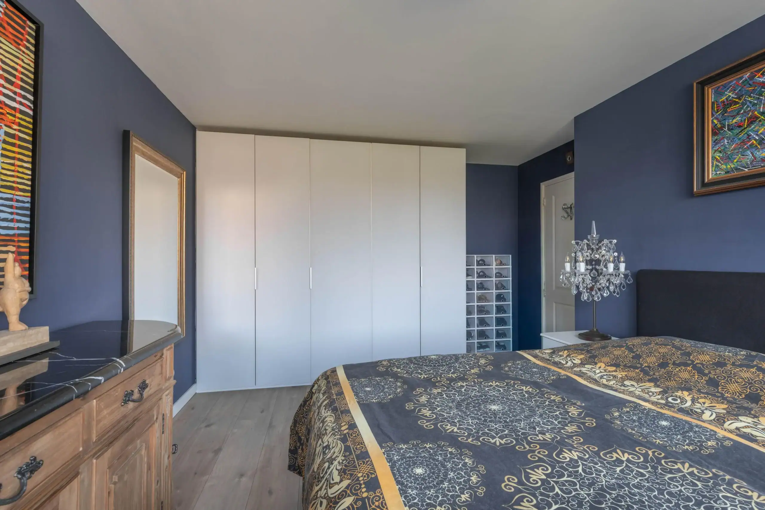 Through a sliding door, the space on the side of the house can be accessed. An additional living room has been created here: the former garage has been converted and expanded into a multifunctional space. This area has its own entrance and a spacious bedroom with a dressing table. In the hallway there are custom-made cabinets with plenty of storage space and connections for a washing machine and dryer. The meter cupboard for the home automation installation is also located here.