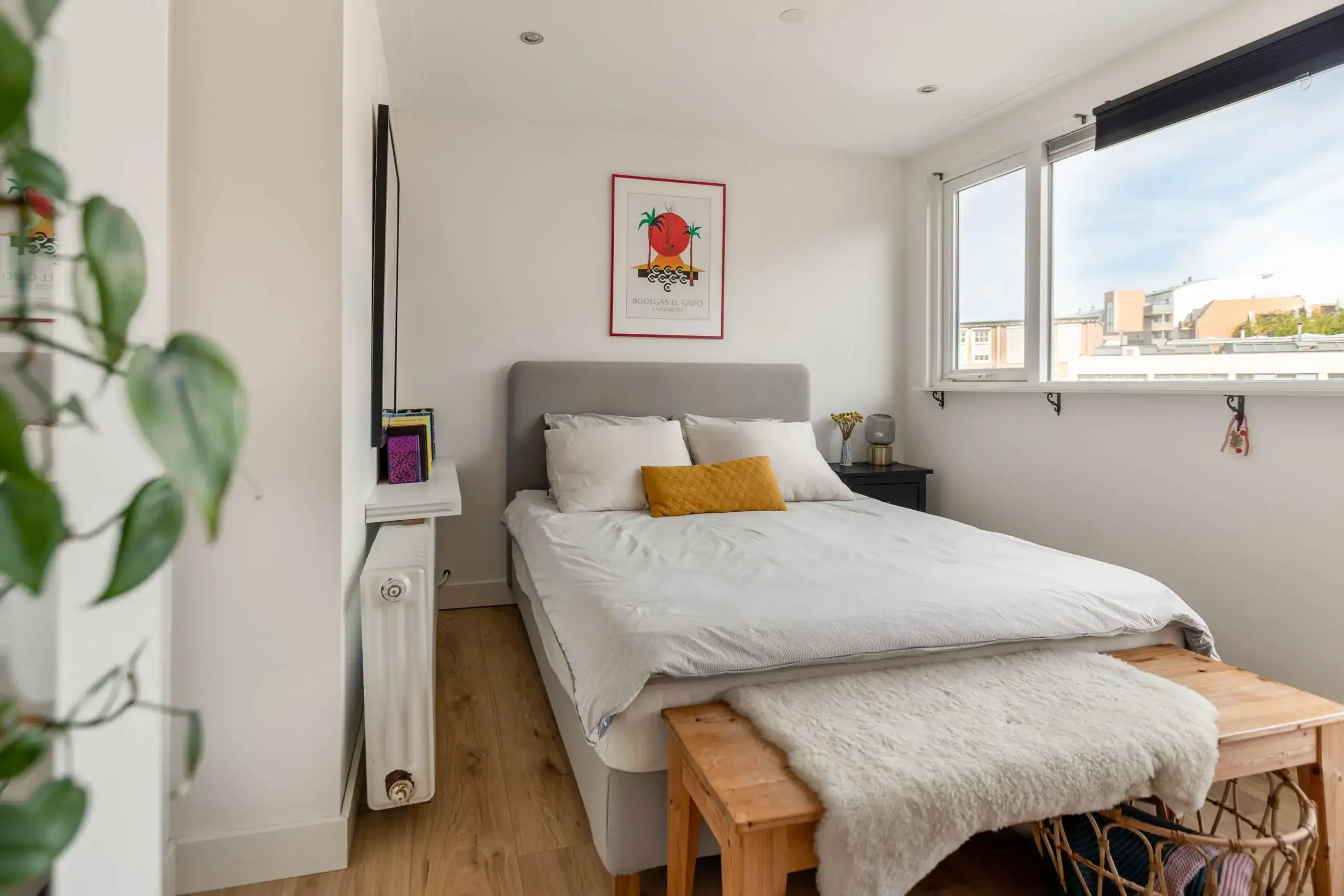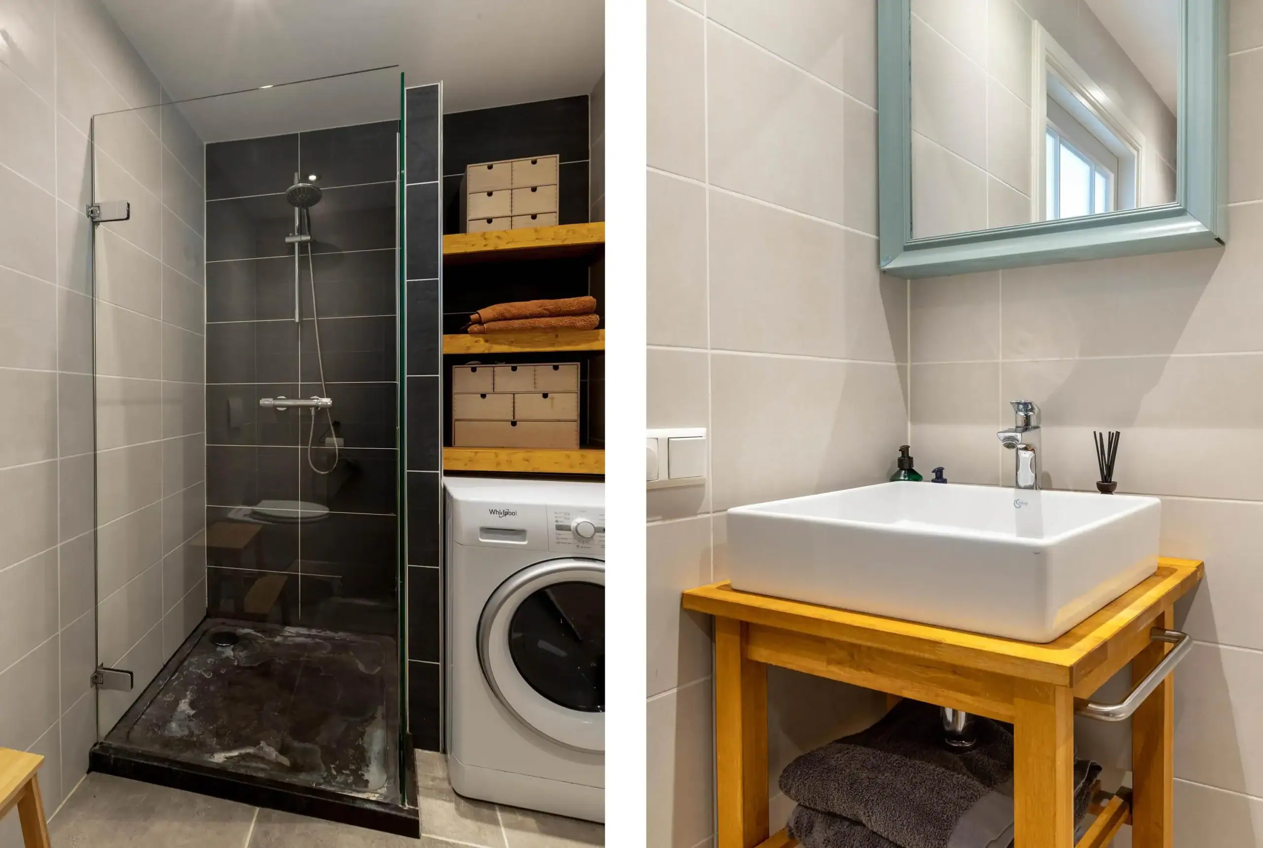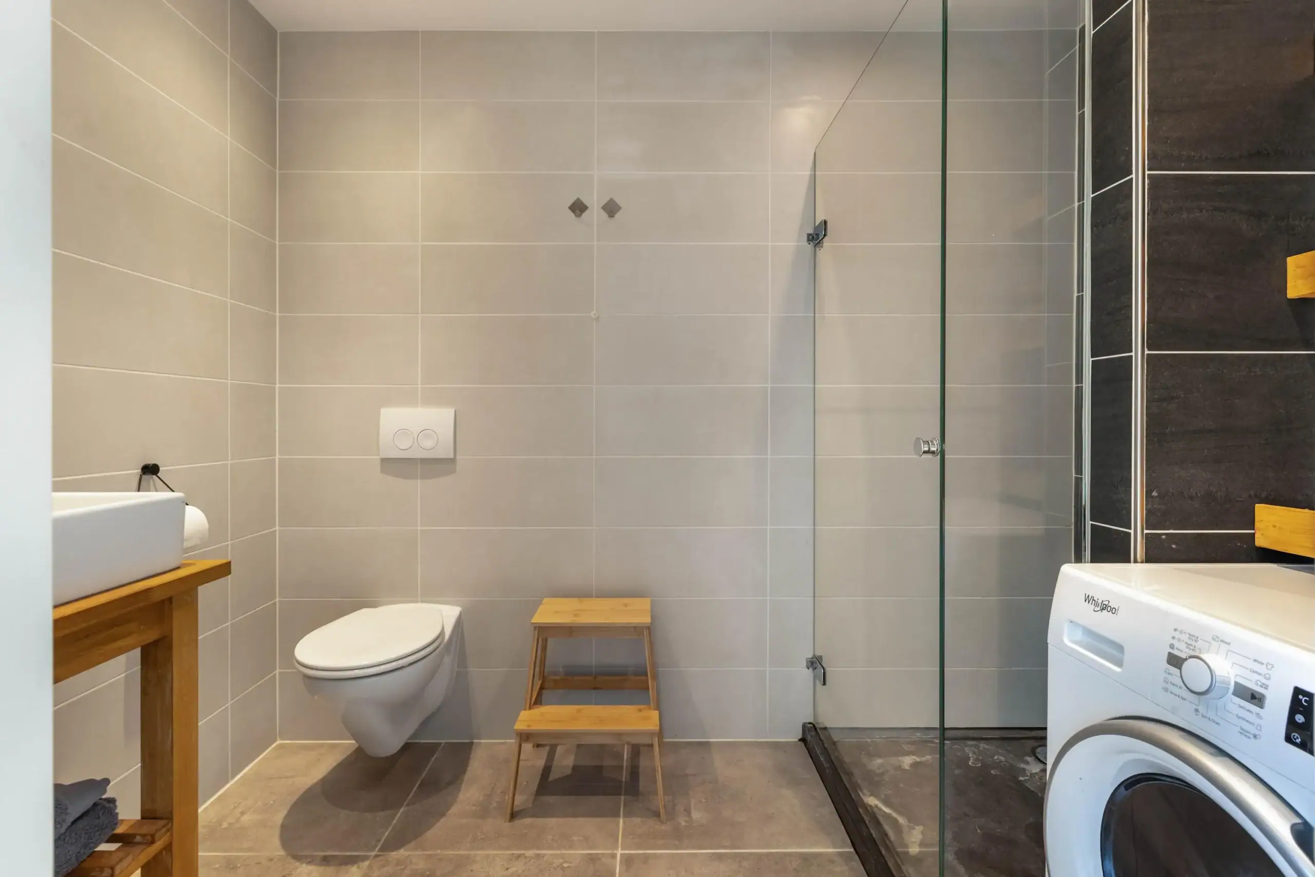 Two bedrooms, separated by a modern bathroom with a shower with glass doors, bathroom furniture, second toilet and connections for the washing machine and dryer. There is also a door to the roof terrace.