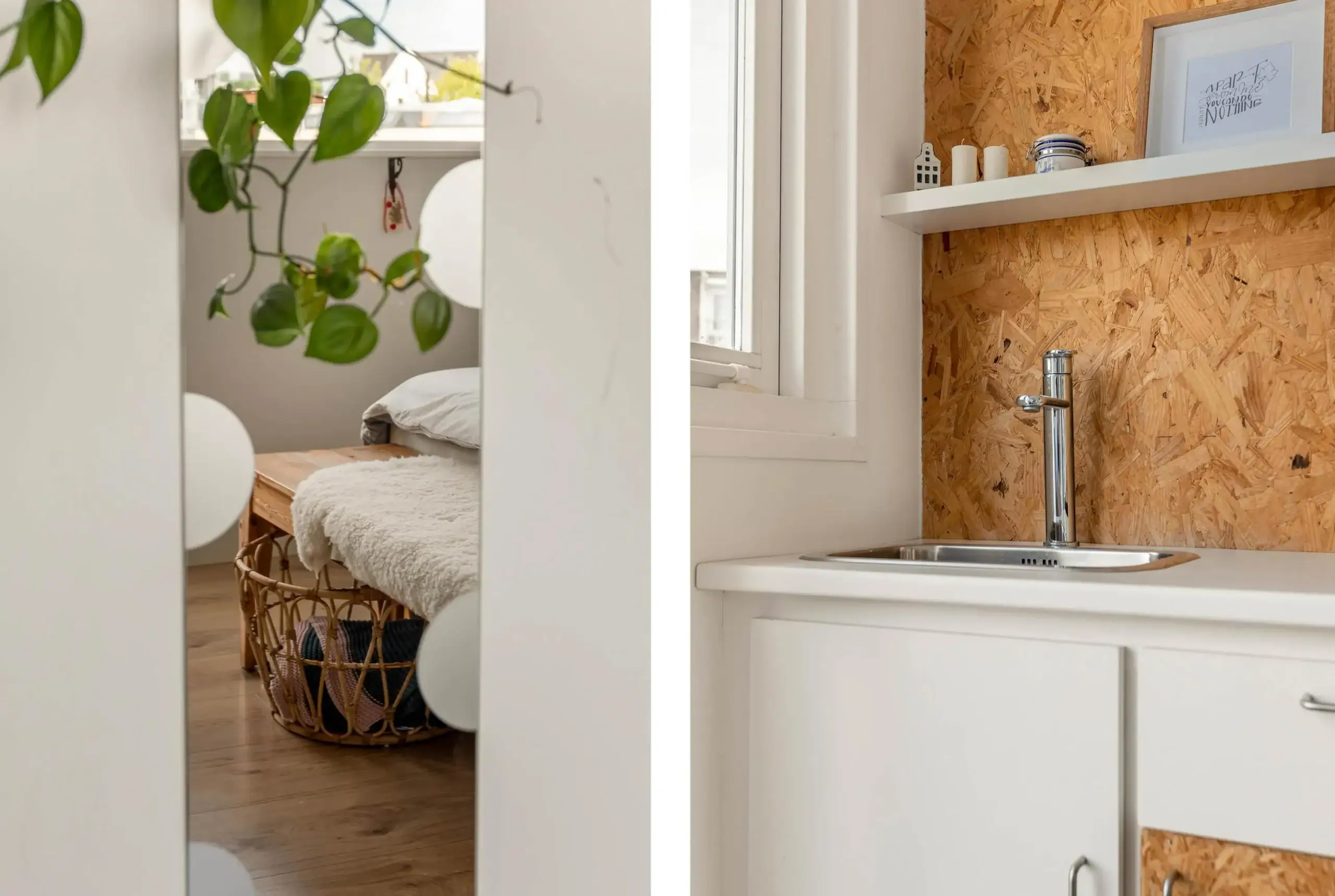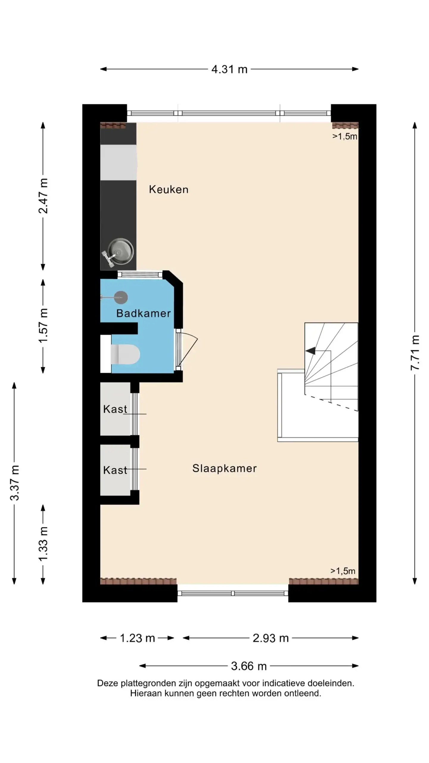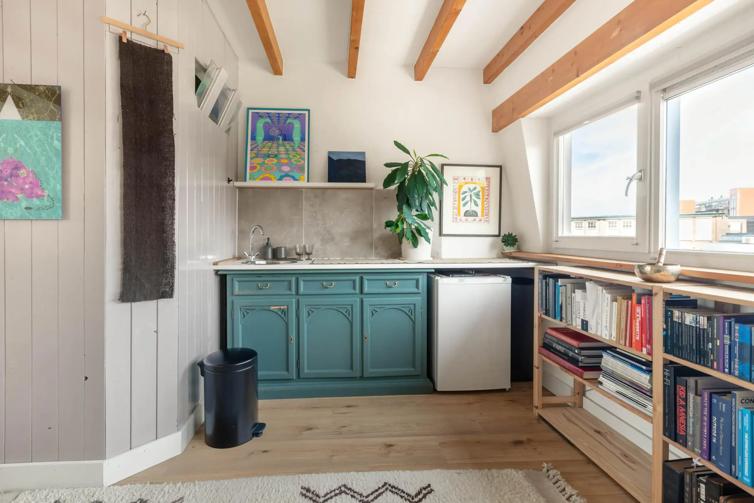 Spacious bedroom/studio with its own kitchenette and bathroom with walk-in shower and third toilet.