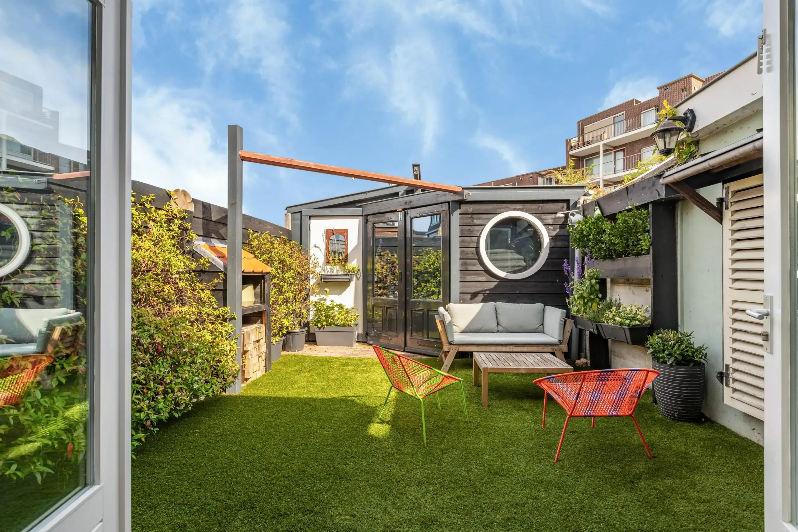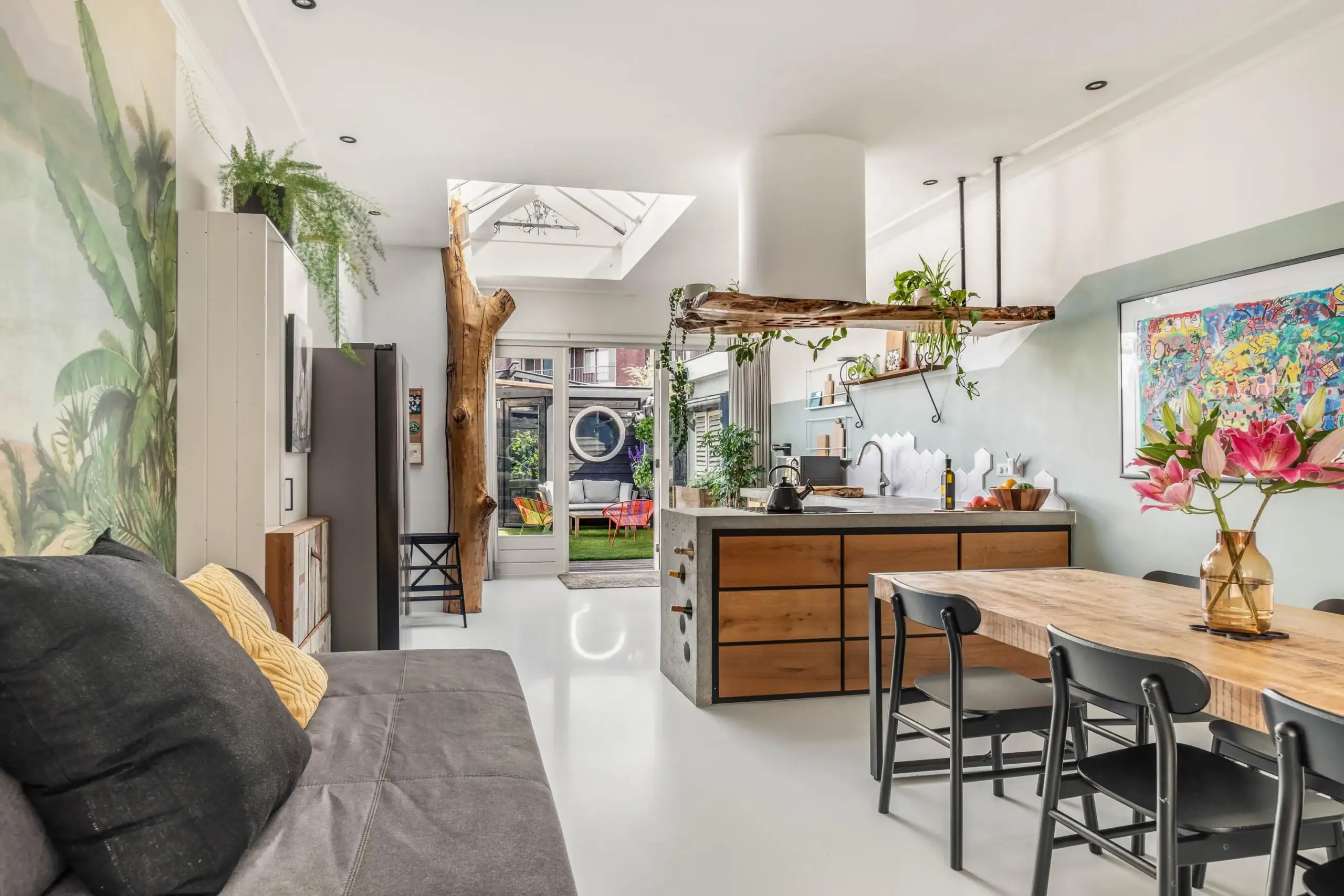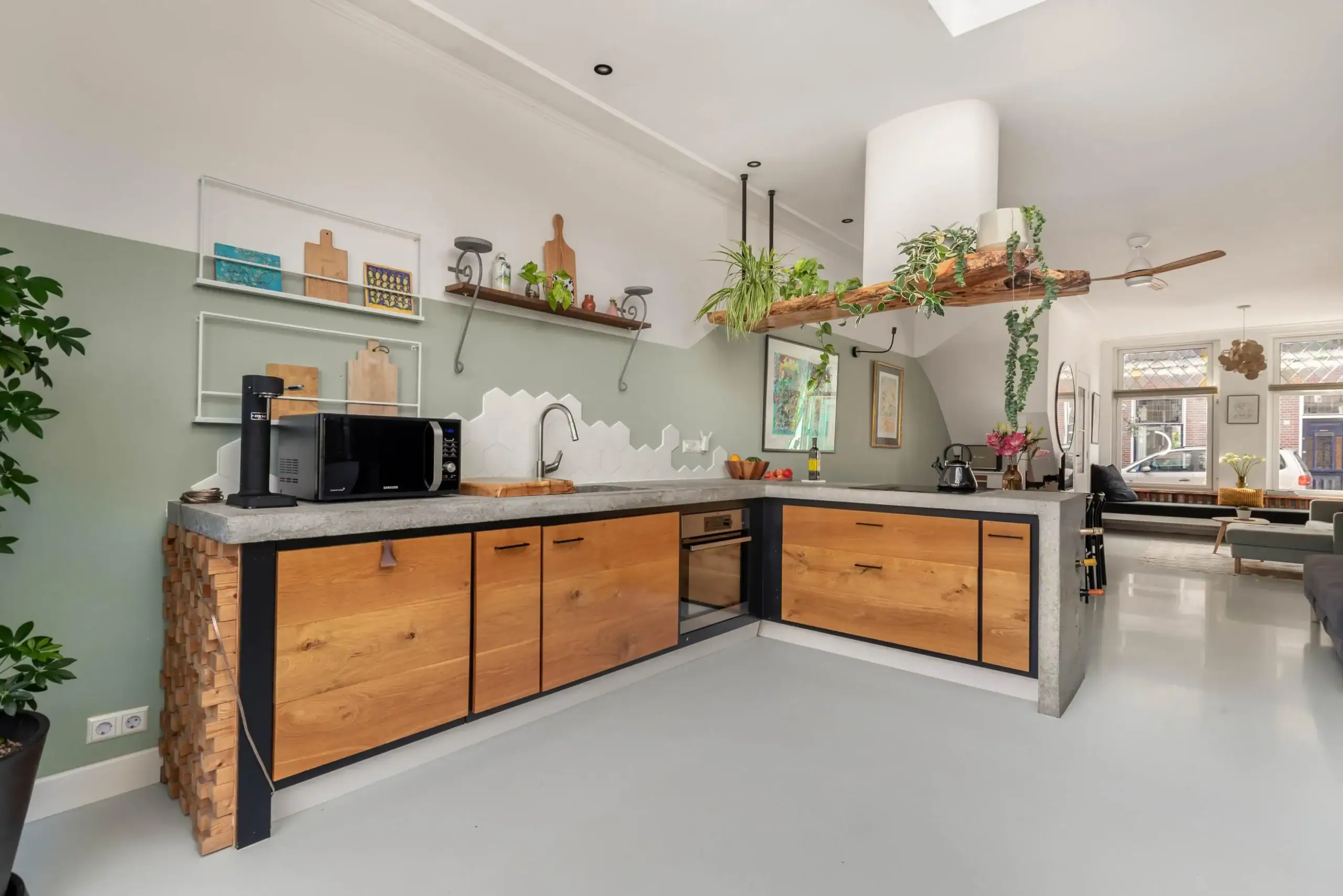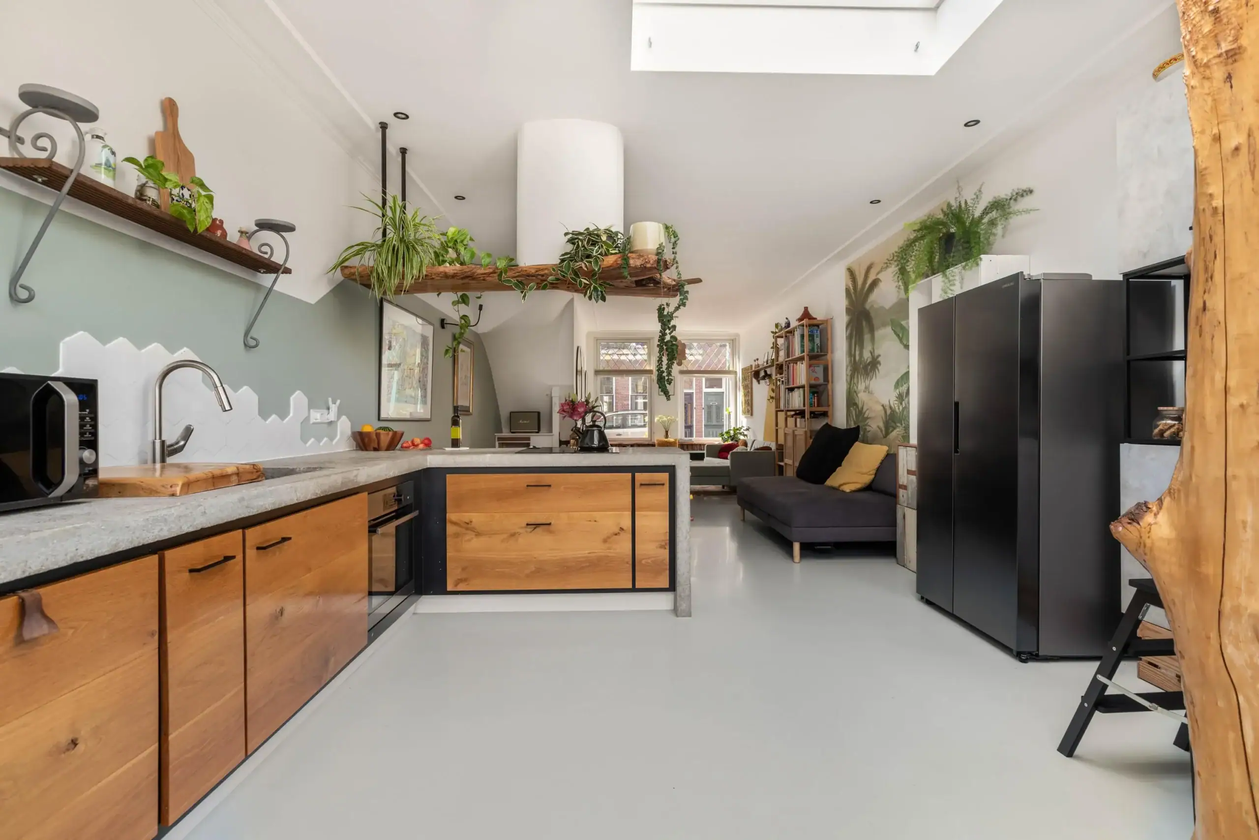You enter through the hall into the spacious and attractive living room. There is an open kitchen which, thanks to its layout and choice of materials, is a real eye-catcher. The extension has a skylight, which provides extra space and light throughout the living room. There is a beautiful concrete floor with underfloor heating, ideal! French doors lead to the garden. The north-facing garden has a cosy atmosphere and features a detached shed with back access.