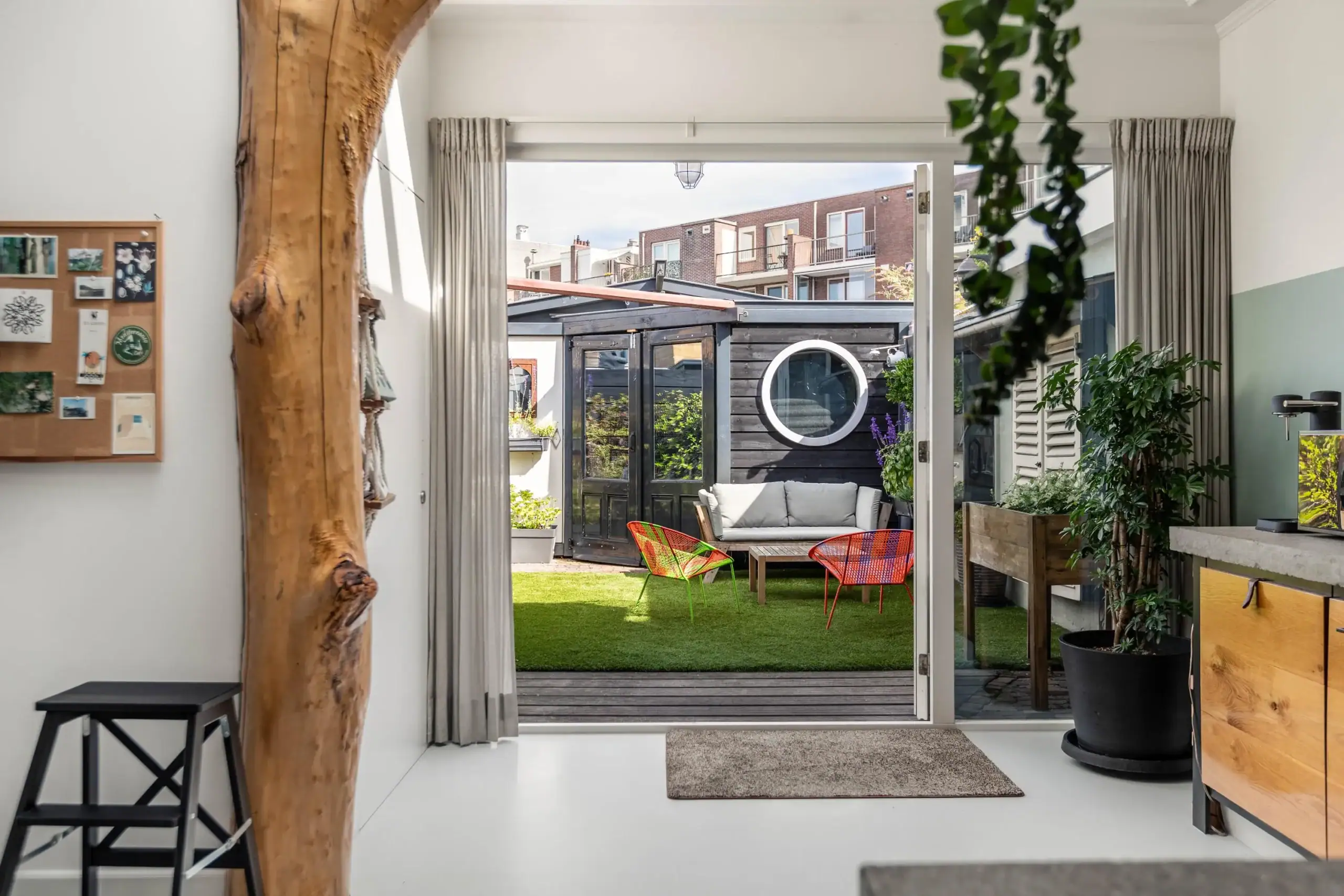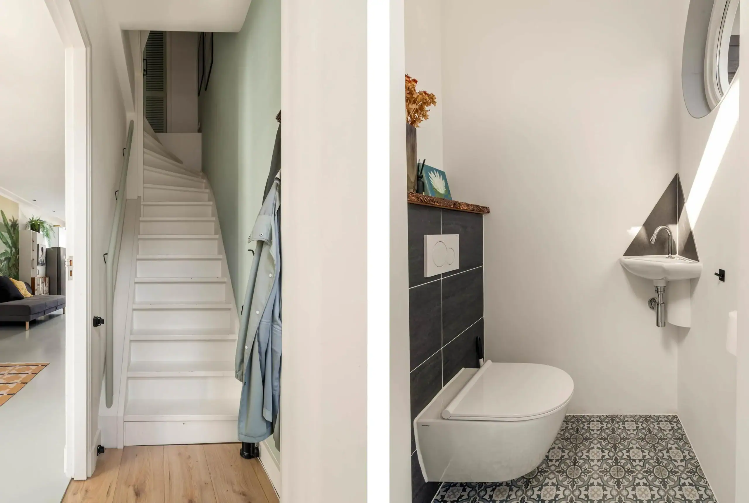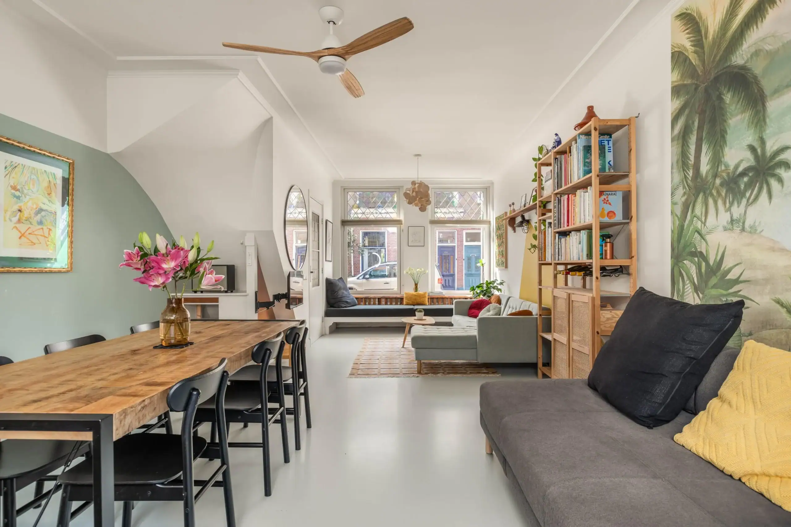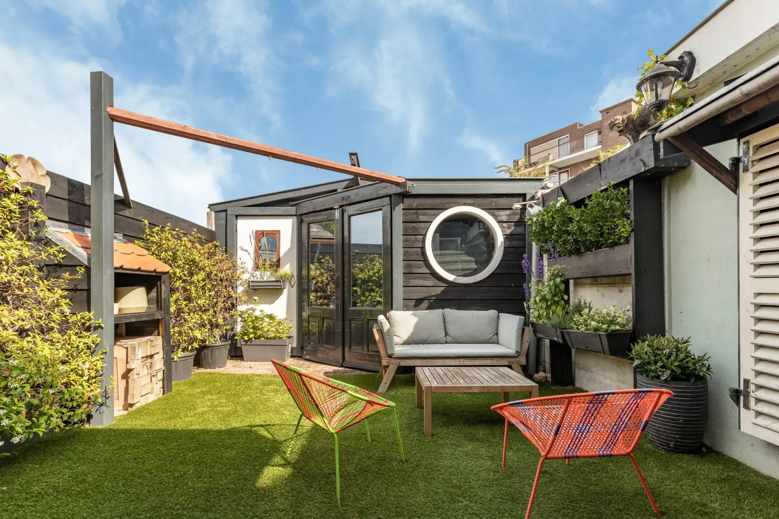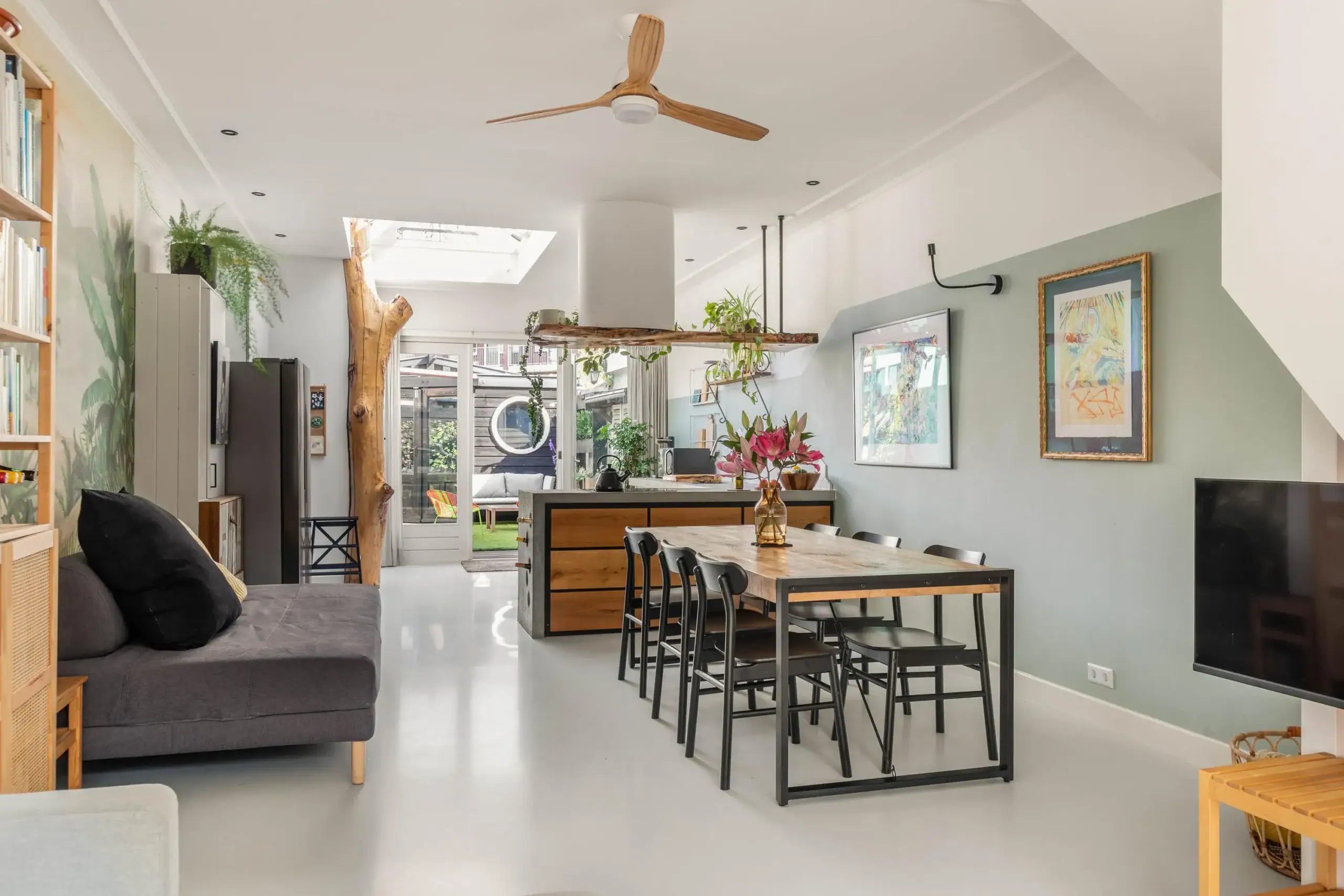 You enter through the hall into the spacious and attractive living room. There is an open kitchen which, thanks to its layout and choice of materials, is a real eye-catcher. The extension has a skylight, which provides extra space and light throughout the living room. There is a beautiful concrete floor with underfloor heating, ideal! French doors lead to the garden. The north-facing garden has a cosy atmosphere and features a detached shed with back access.