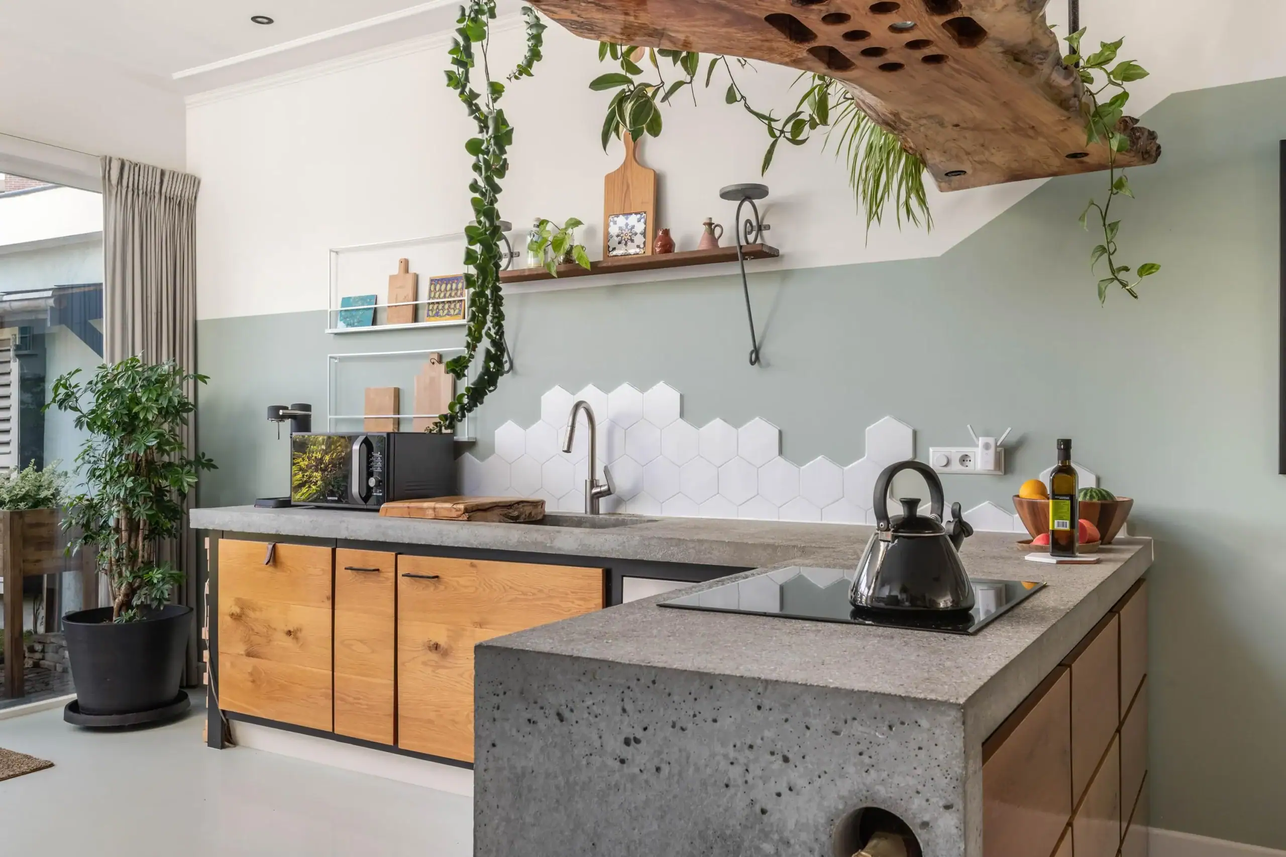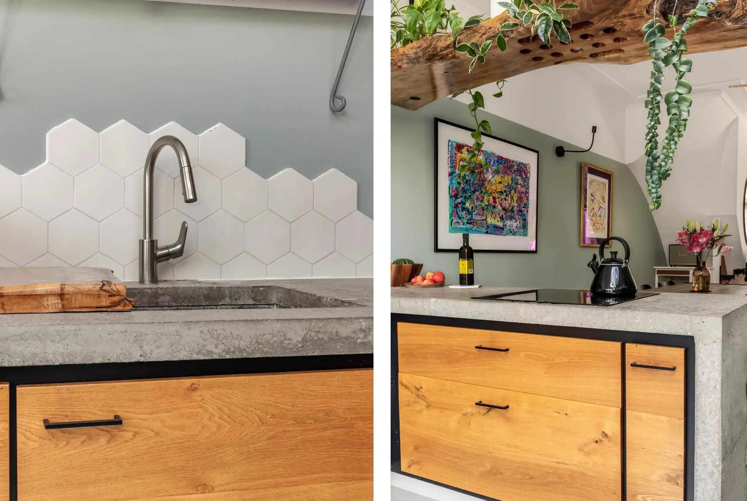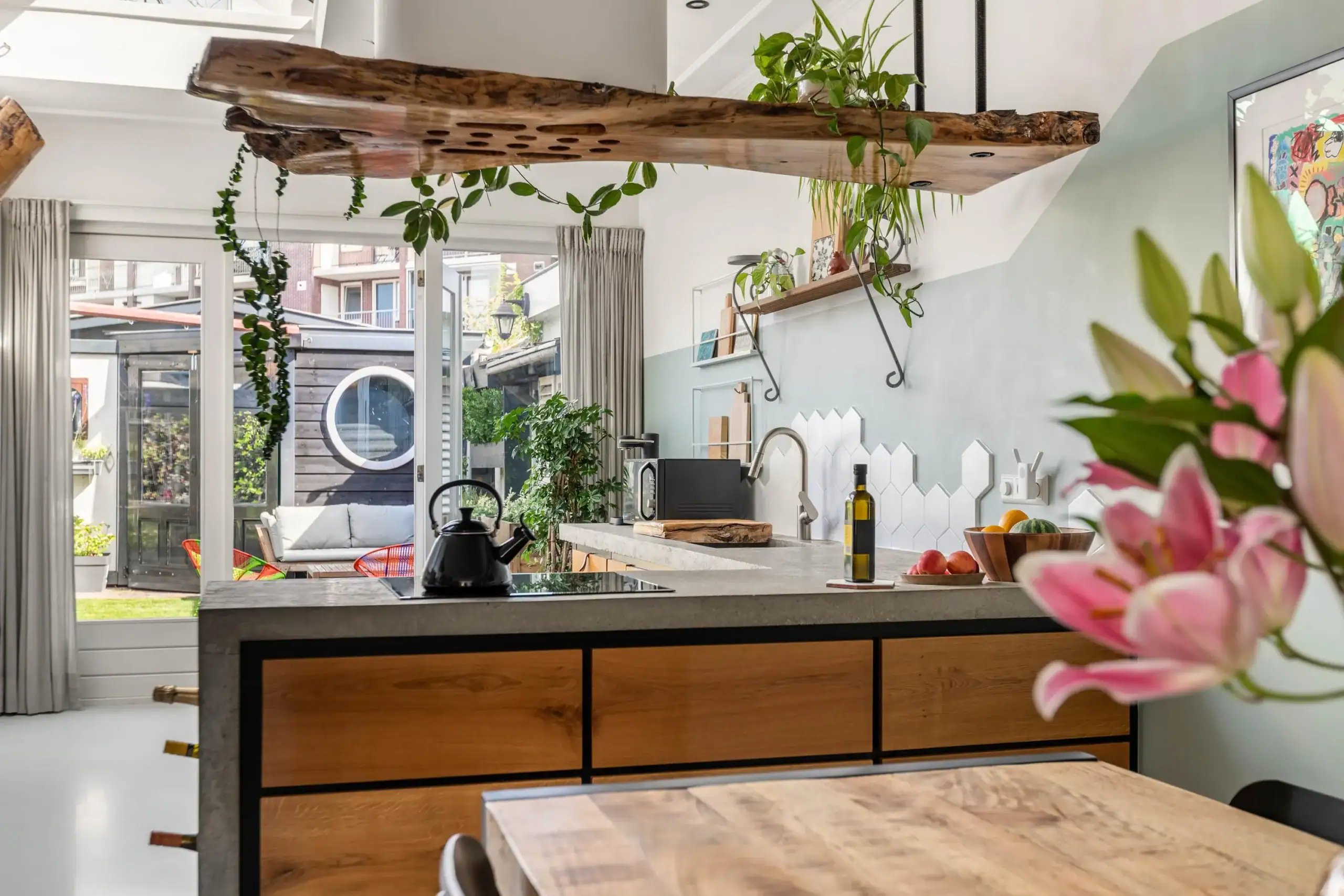 The ground floor has a concrete floor with underfloor heating. The handmade stylish kitchen has a concrete worktop and various appliances: induction hob, extractor hood, microwave/oven and dishwasher. Modern toilet at the rear with washbasin. The French doors give access to a lovely city garden with a spacious shed.