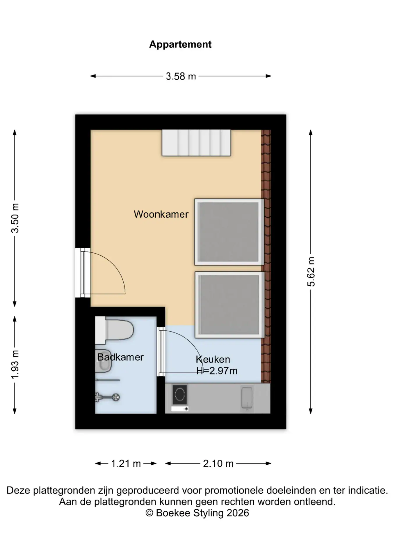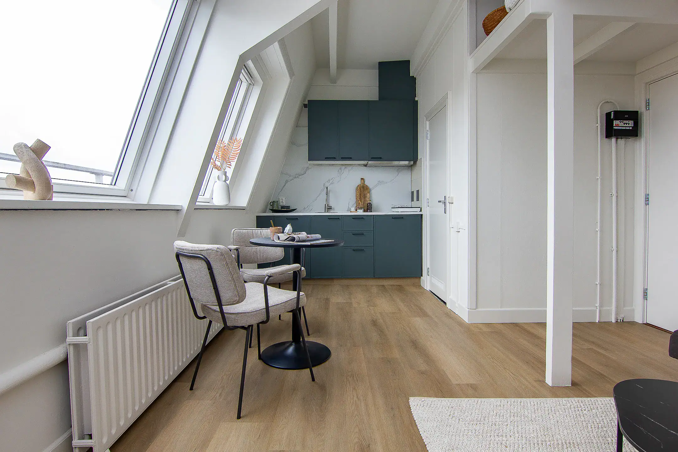 The studio features a lovely living/bedroom with a mezzanine, PVC flooring and a modern kitchen. The skylights and doors are fitted with high-performance glass, and all external walls are insulated. This, together with the interior painting, will be completed by the end of 2025.