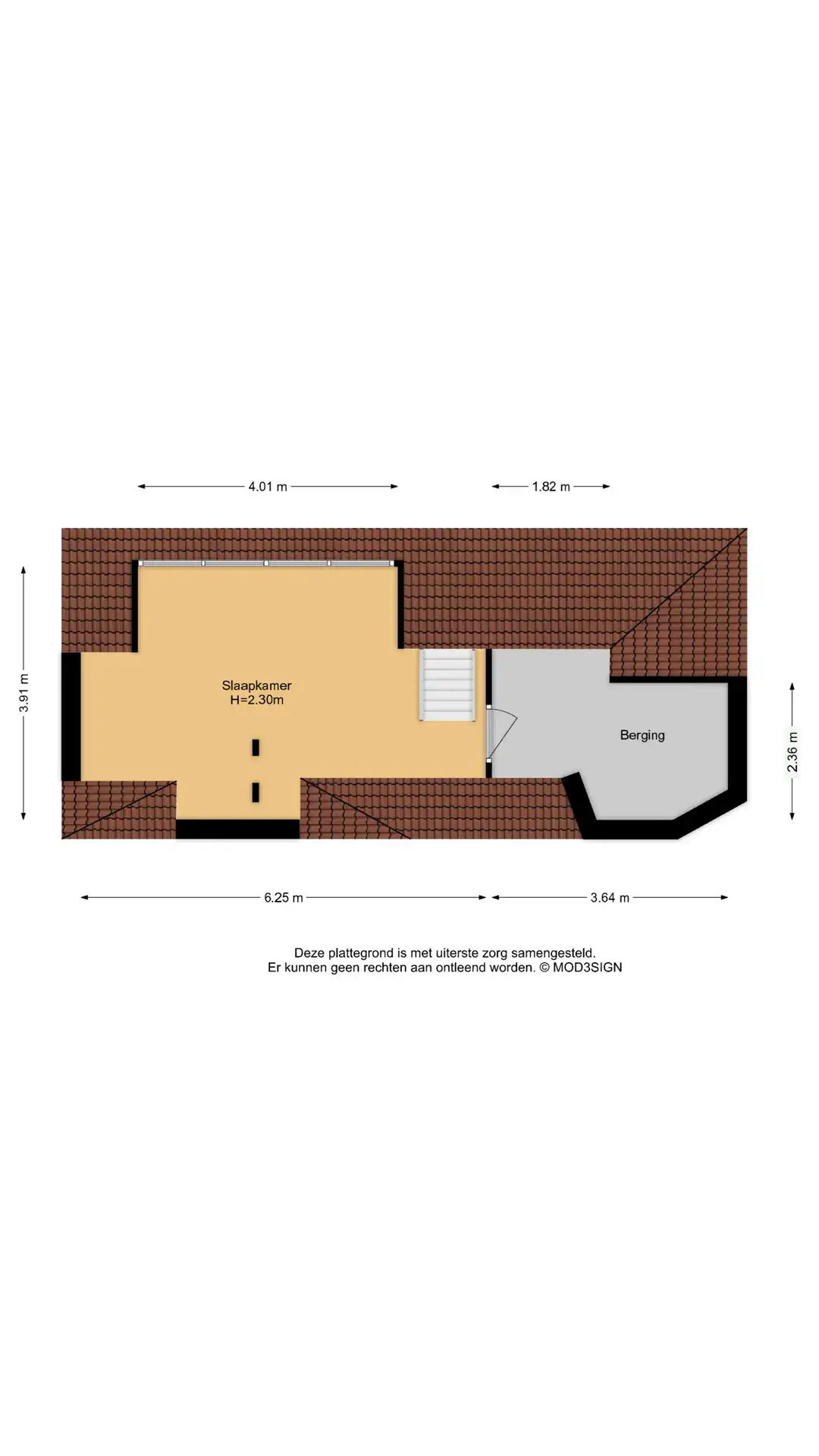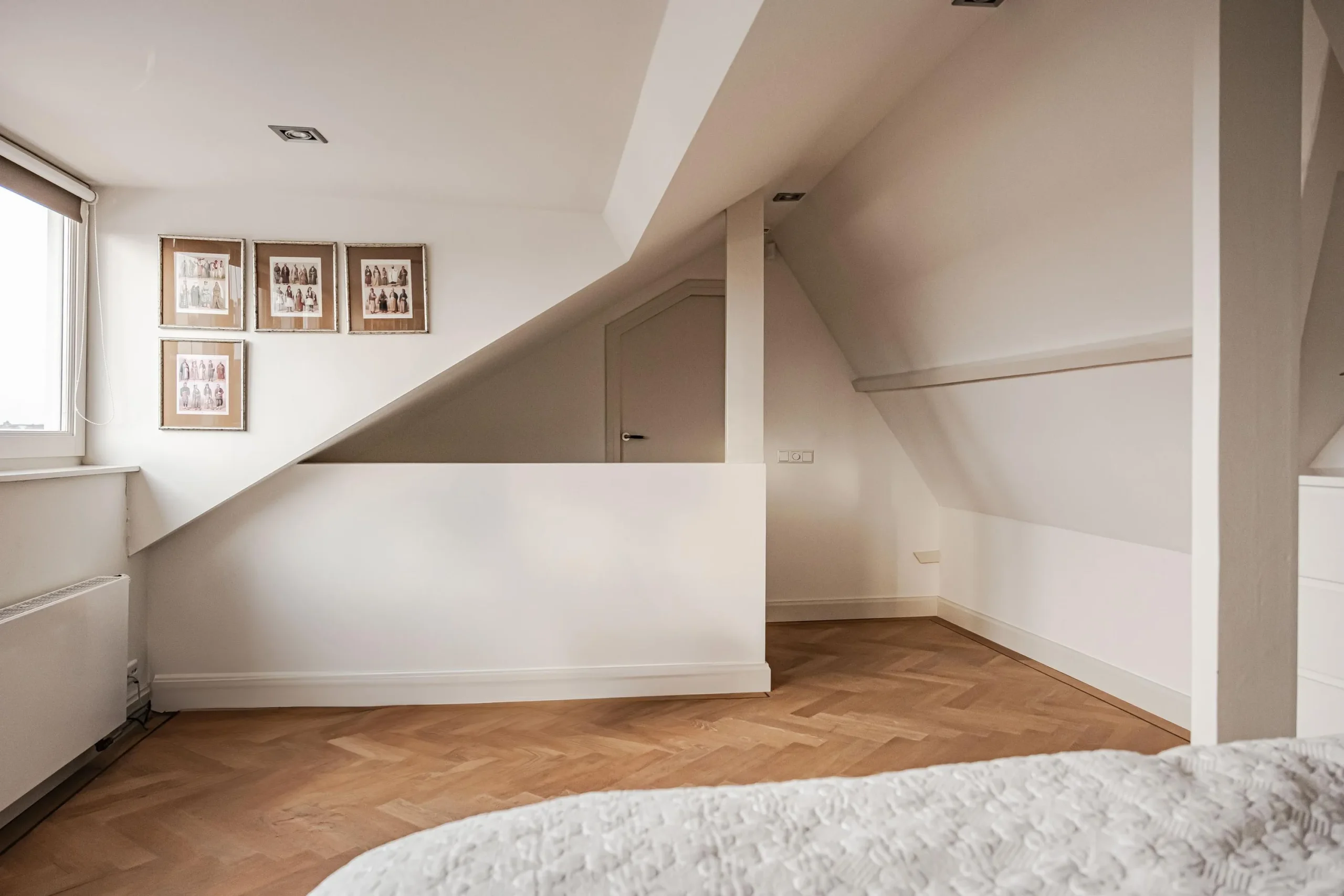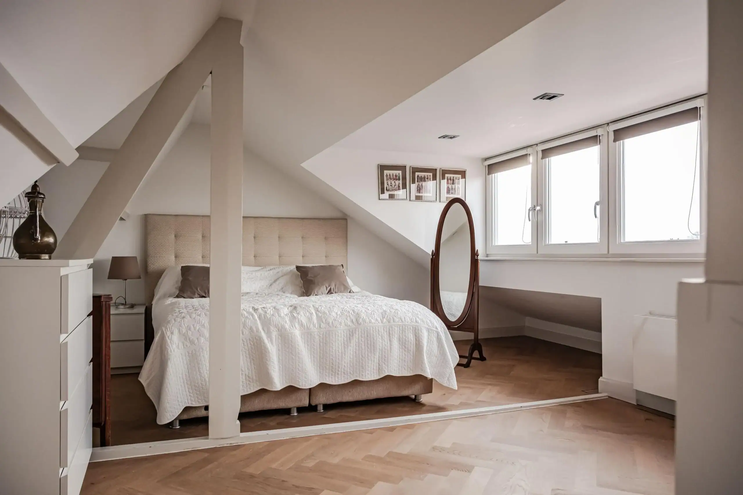 Charming attic bedroom with exposed beams, dormer window and door to the storage space.