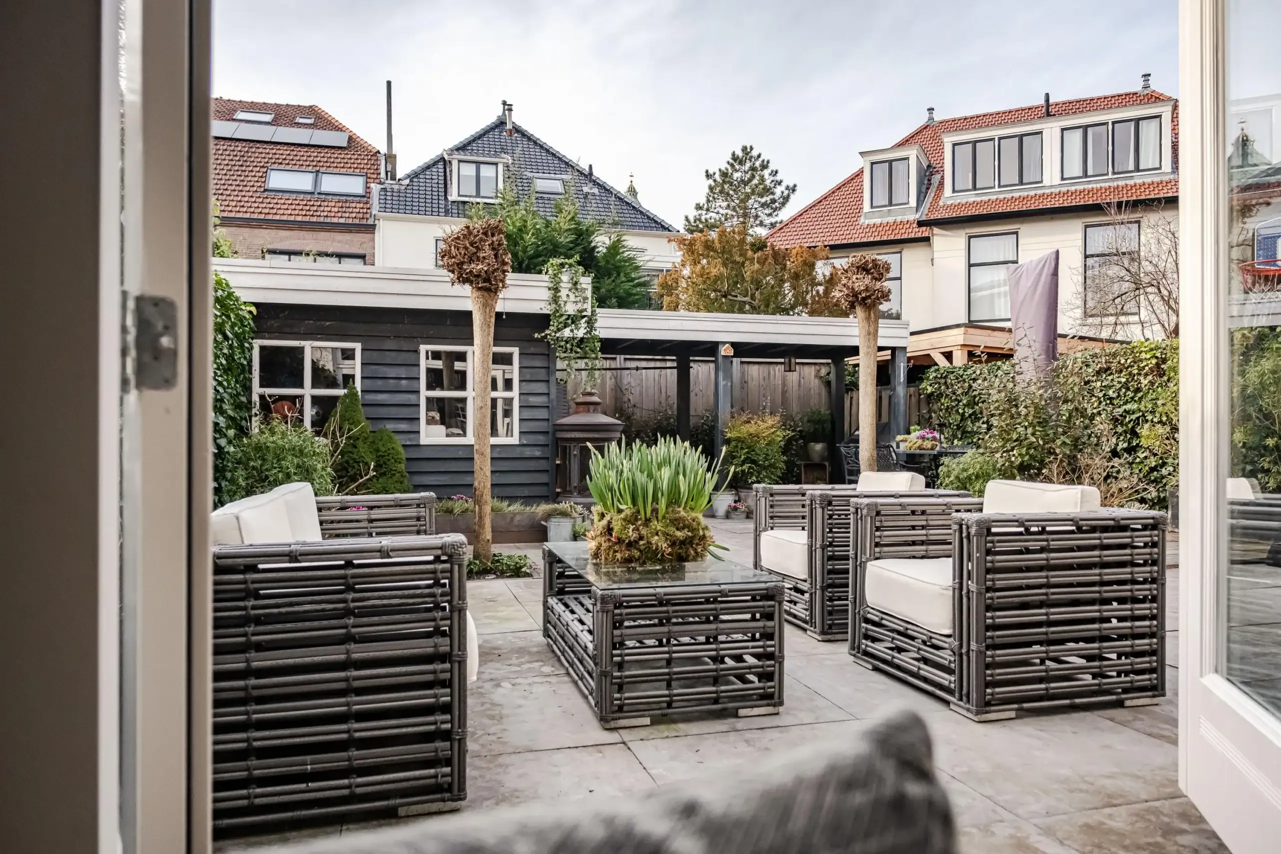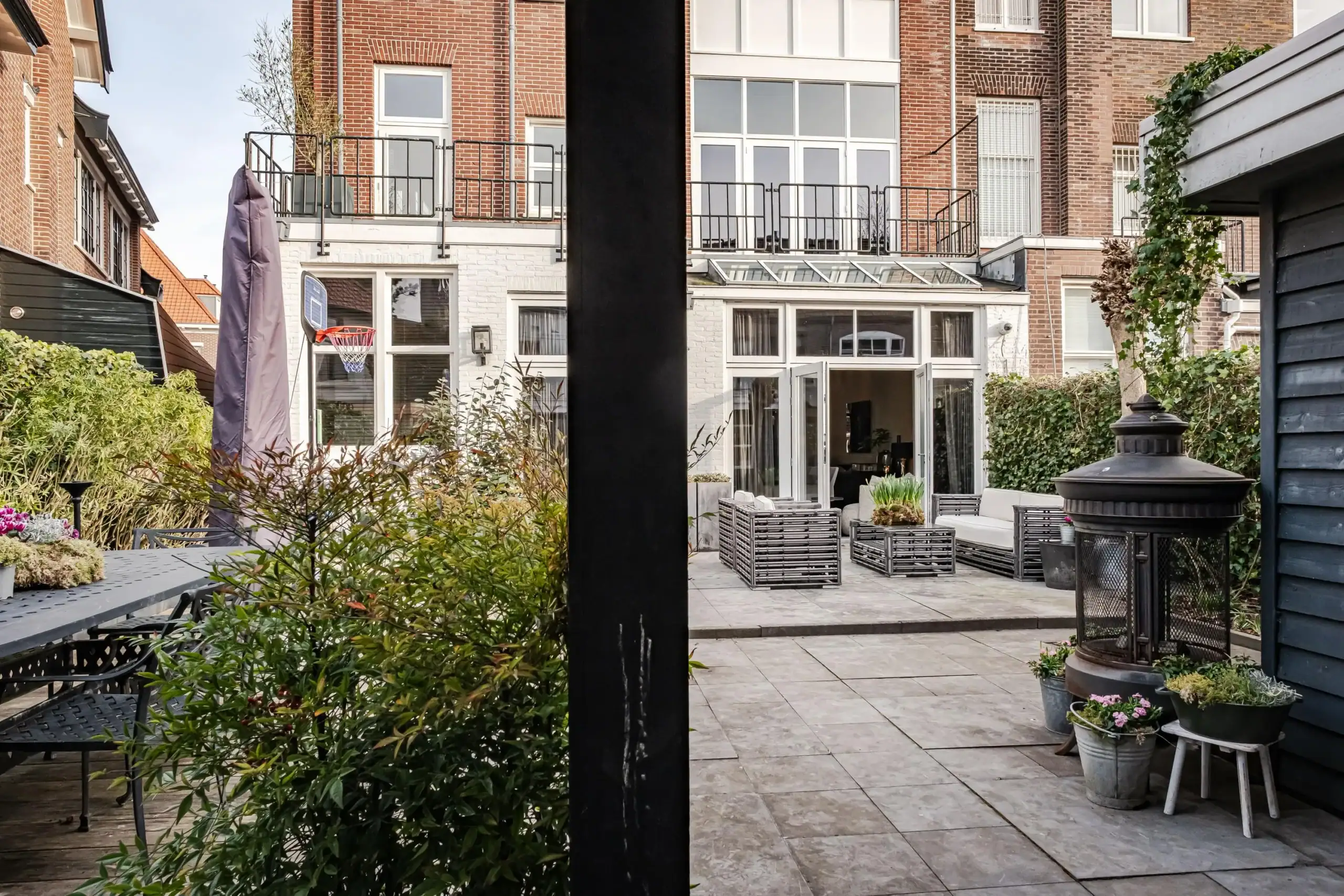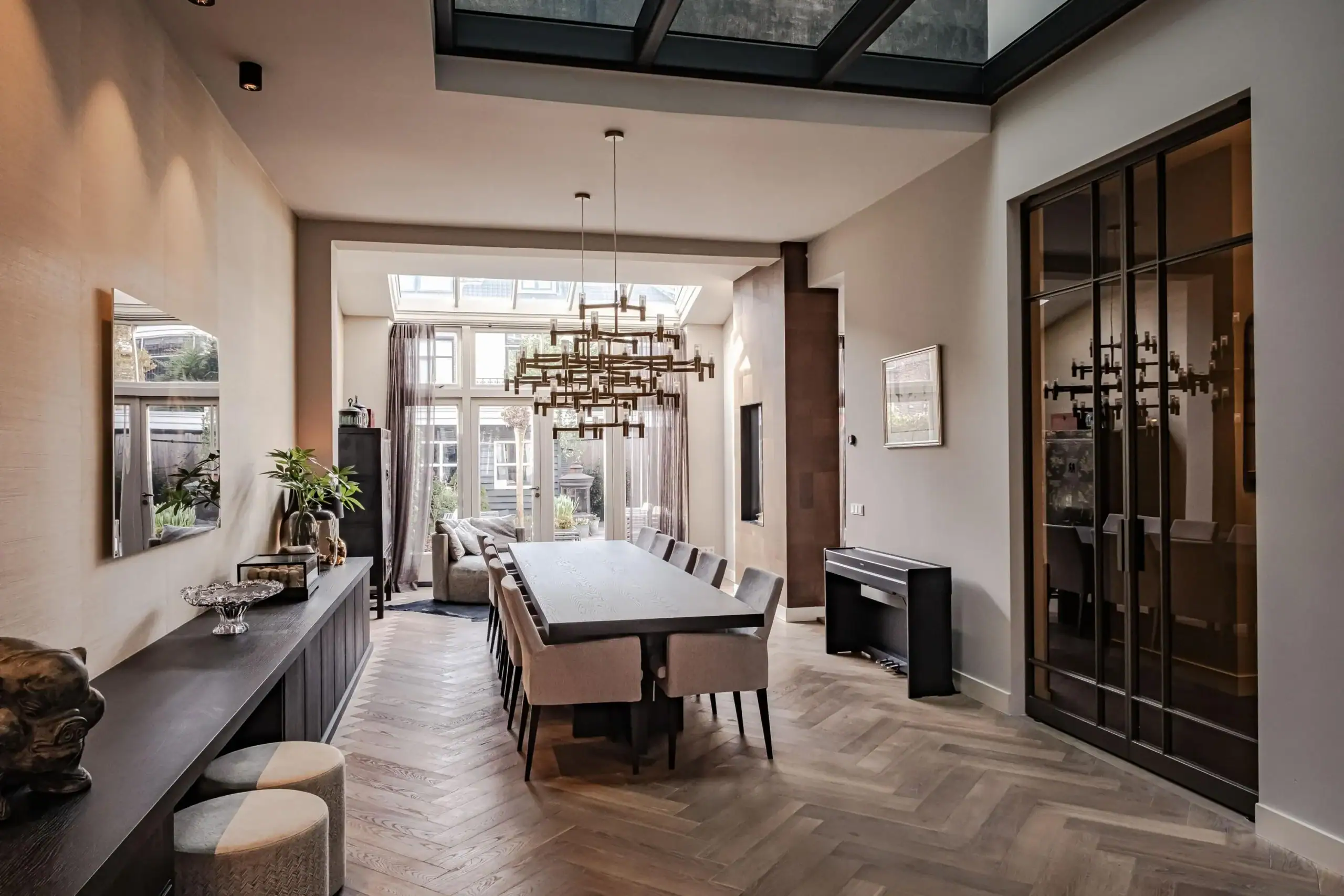 Front garden with a sunken bicycle storage area. Side entrance with a classic, wide front door. Windbreak porch with meter cupboard and access to the cellar. Pivot door leading to the central hall with storage space under the stairs, a custom-made wardrobe and staircase. Spacious toilet with washbasin unit. Double pivot doors leading to the living room. Front-facing sitting room with a bay window featuring tall windows and a custom-made room divider with a see-through fireplace leading to the second sitting room, which features a TV cabinet above the fireplace. Dining area with additional seating at the rear, skylights and French doors leading to the garden. Also a custom-made room divider with a see-through fireplace leading to the semi-open kitchen. Luxury kitchen-diner with a peninsula, featuring a sleek black worktop with a bar area, seating for at least four people, a large sink with a Quooker tap and a Miele dishwasher, a Foster 5-burner gas hob with an extra-wide oven, extractor hood, marble splashback, an extra-tall fridge and freezer (both Liebherr) and a wall unit with built-in microwave, coffee machine and wine climate cabinet.