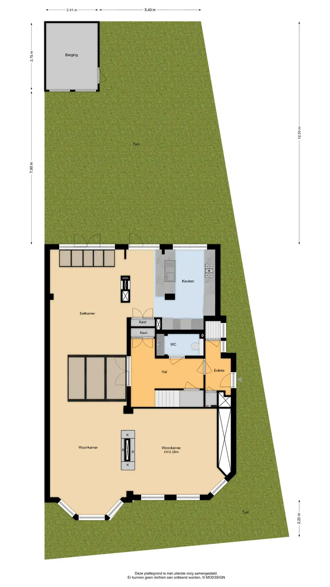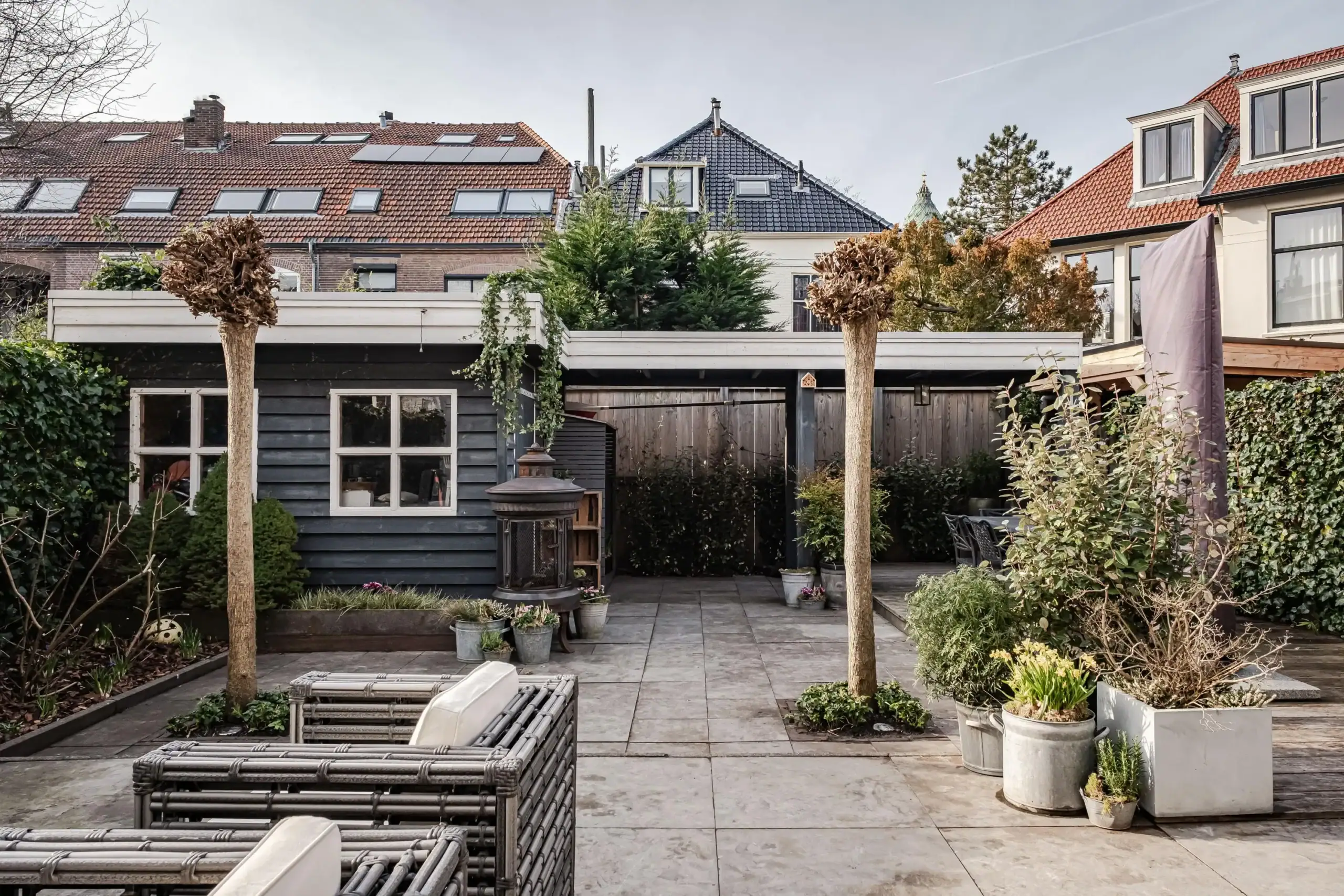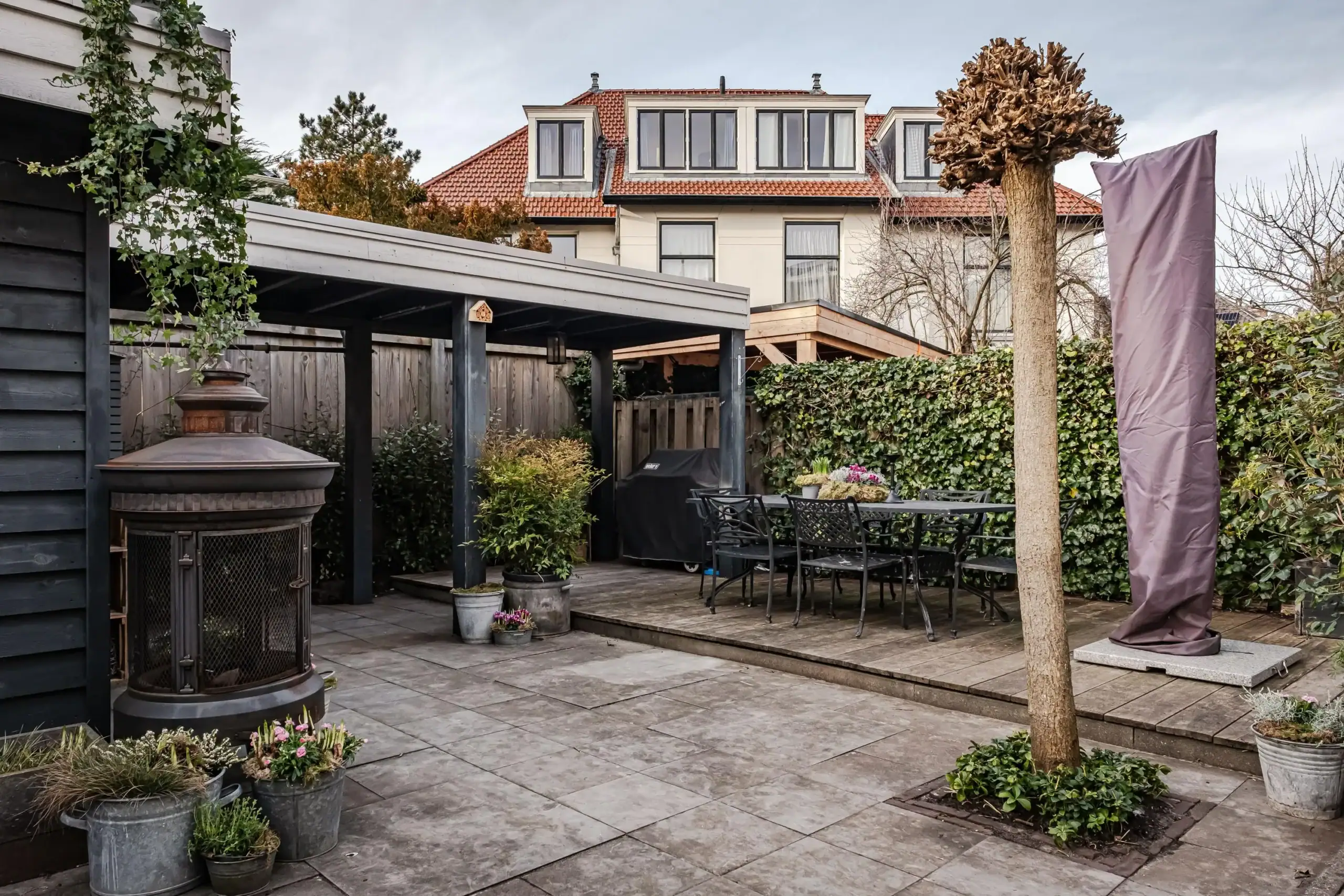 Front garden with a sunken bicycle storage area. Side entrance with a classic, wide front door. Windbreak porch with meter cupboard and access to the cellar. Pivot door leading to the central hall with storage space under the stairs, a custom-made wardrobe and staircase. Spacious toilet with washbasin unit. Double pivot doors leading to the living room. Front-facing sitting room with a bay window featuring tall windows and a custom-made room divider with a see-through fireplace leading to the second sitting room, which features a TV cabinet above the fireplace. Dining area with additional seating at the rear, skylights and French doors leading to the garden. Also a custom-made room divider with a see-through fireplace leading to the semi-open kitchen. Luxury kitchen-diner with a peninsula, featuring a sleek black worktop with a bar area, seating for at least four people, a large sink with a Quooker tap and a Miele dishwasher, a Foster 5-burner gas hob with an extra-wide oven, extractor hood, marble splashback, an extra-tall fridge and freezer (both Liebherr) and a wall unit with built-in microwave, coffee machine and wine climate cabinet.