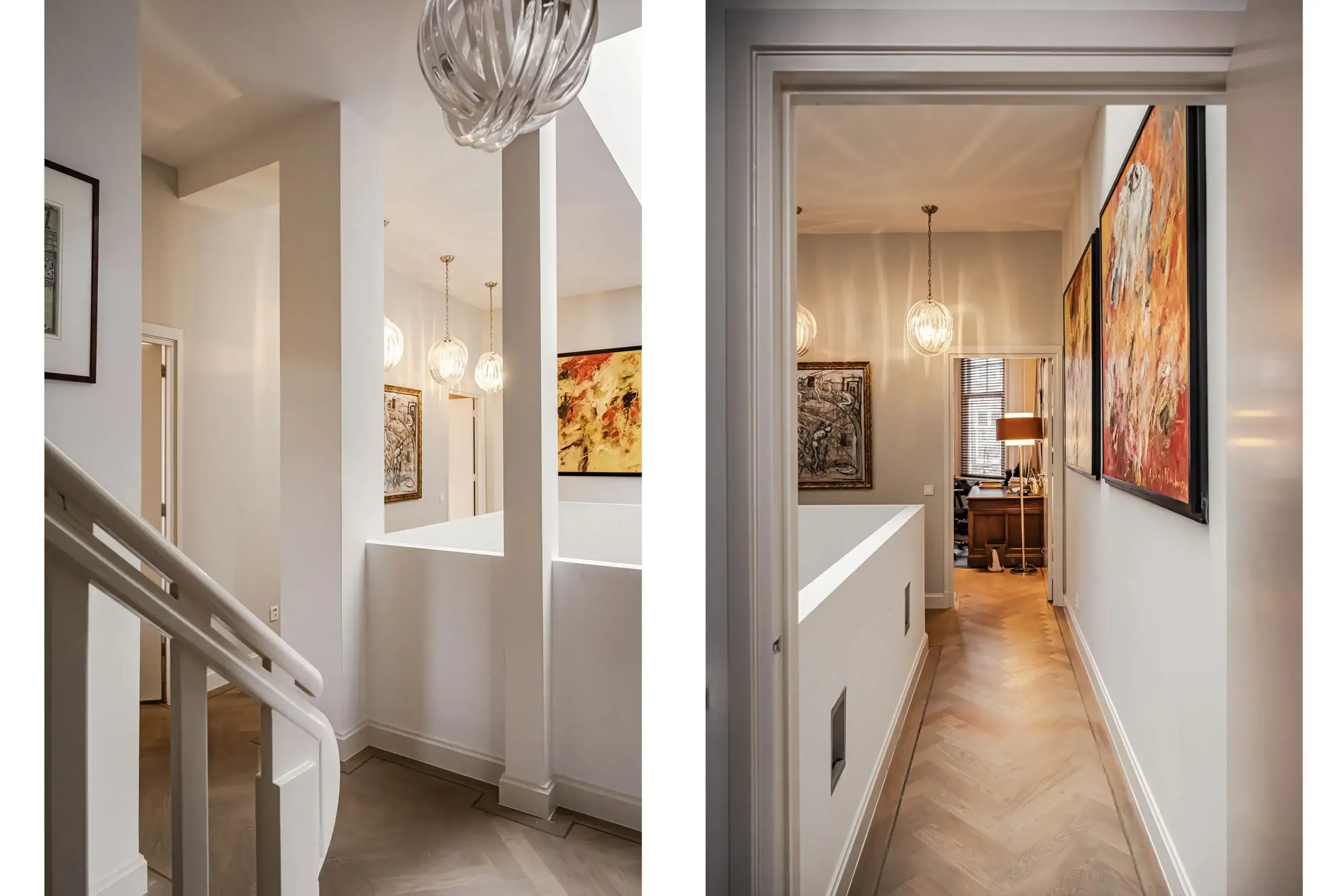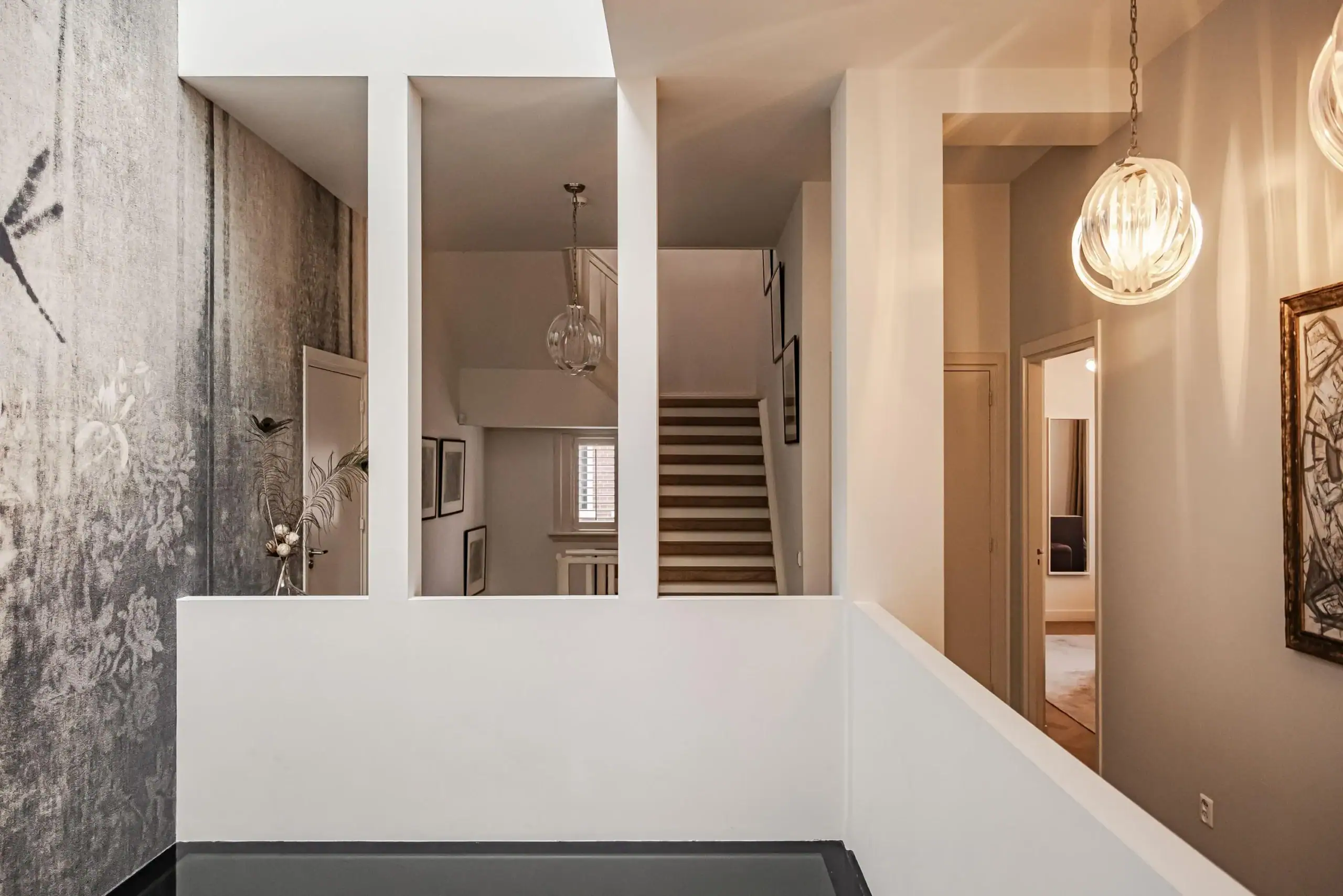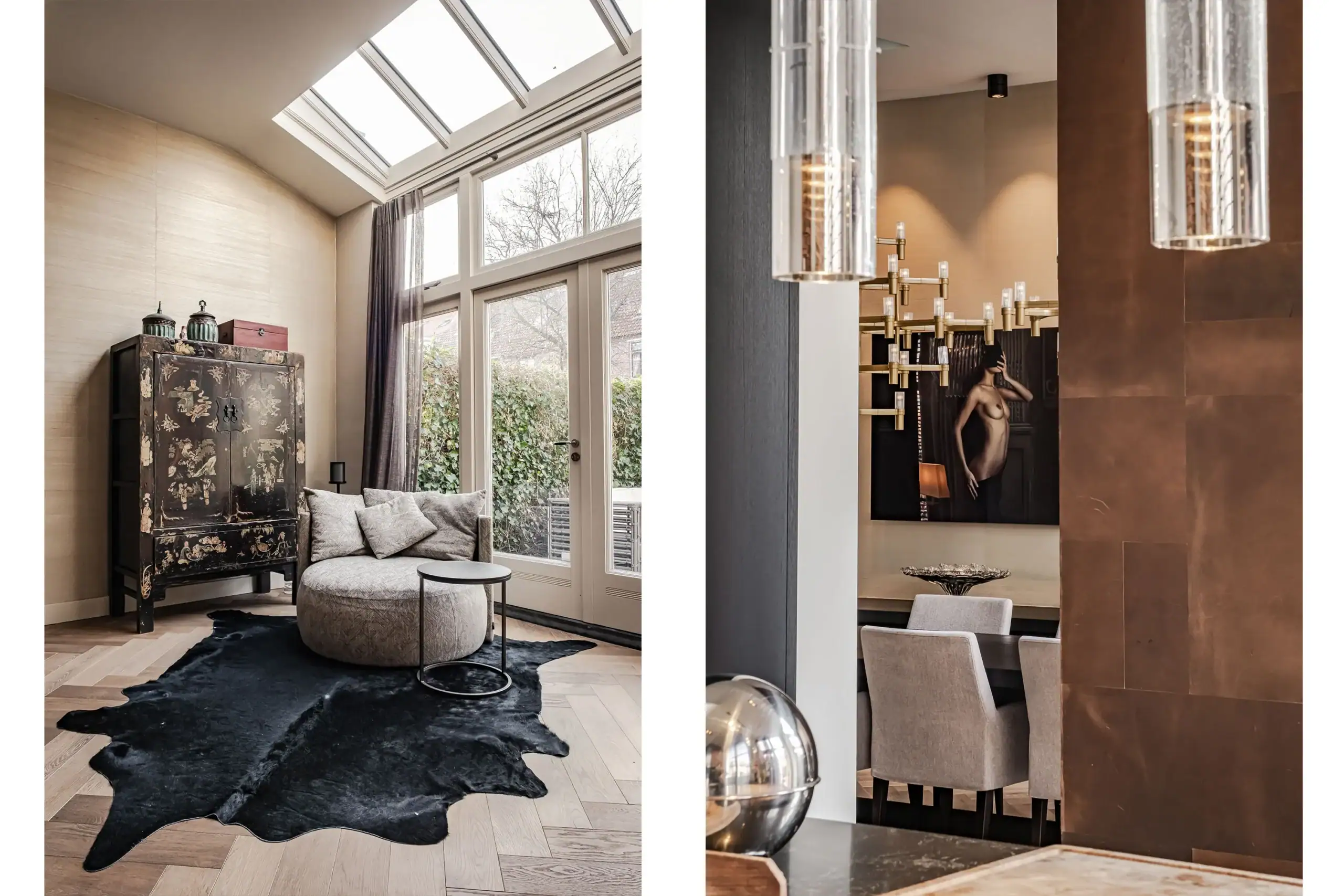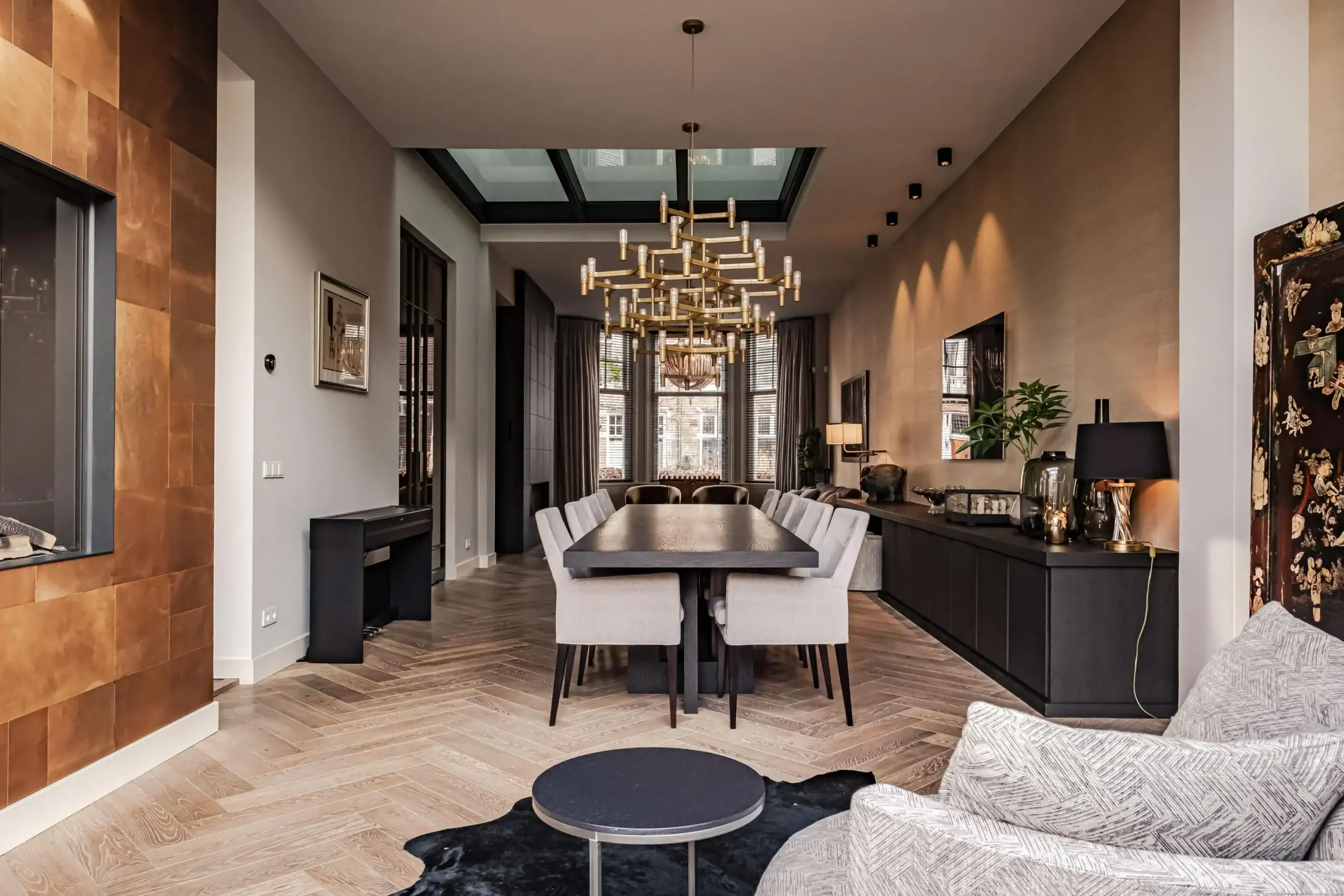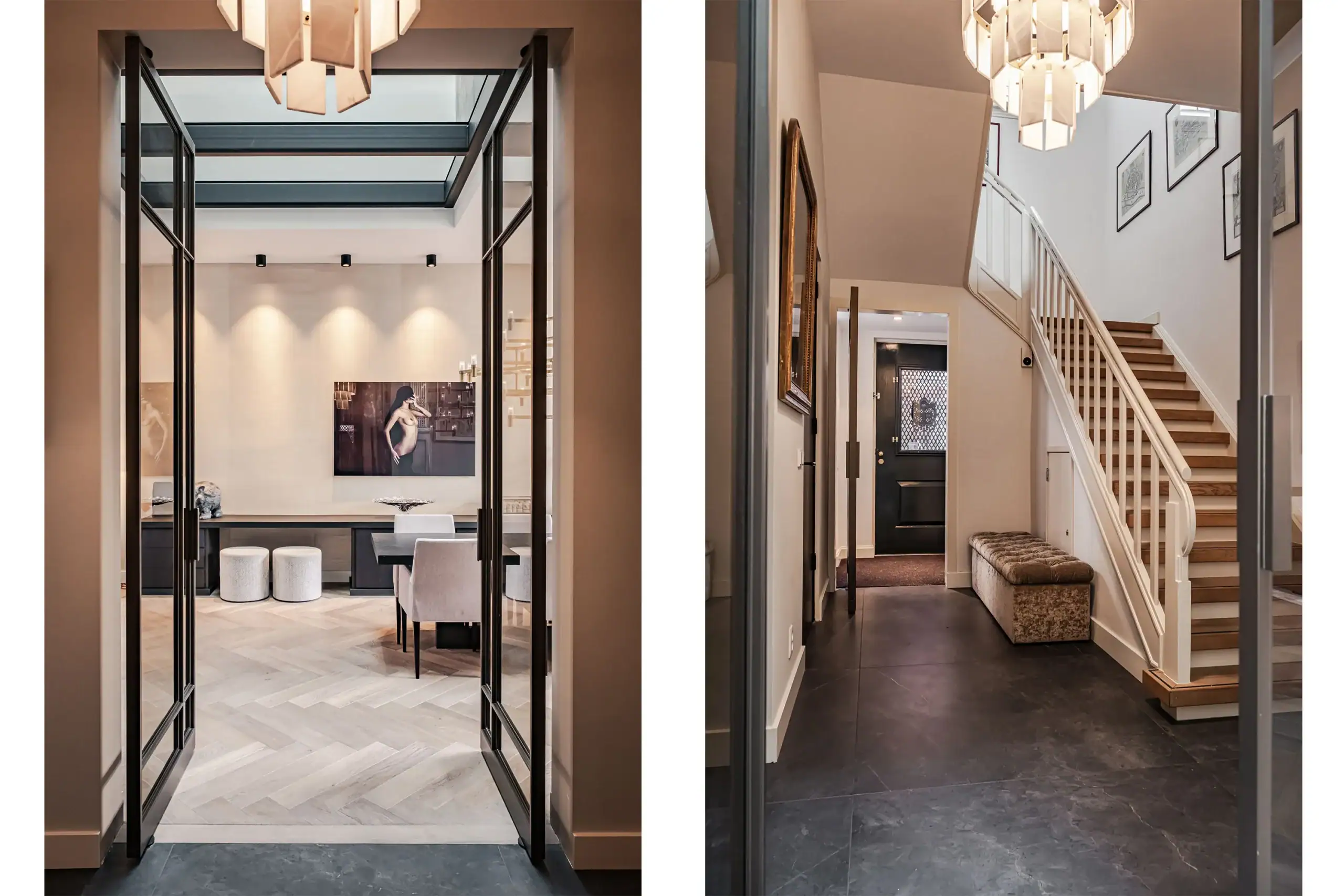 The wow factor is evident throughout the house, though there are a few elements that really stand out. First of all, the impressive atrium with its modern glass structure at the heart of the house. This allows fantastic natural light to flood onto every floor and, together with the high ceilings, creates an overwhelming sense of space and freedom. Then there are the imposing pivot doors and the room dividers with gas fireplaces on the ground floor; the interior is custom-made and uses natural materials such as wood and leather. The large open-plan kitchen features a sleek black worktop, a bar area and luxury built-in appliances. It is the perfect spot for drinks with friends or a (large) family and is directly connected to the dining room. Last but not least: the beautiful staircase; the landing staircase and the balustrade with wood carvings are a wonderful tribute to the property’s historic character. The home exudes not only space, luxury and character, but above all cosiness and home comfort.