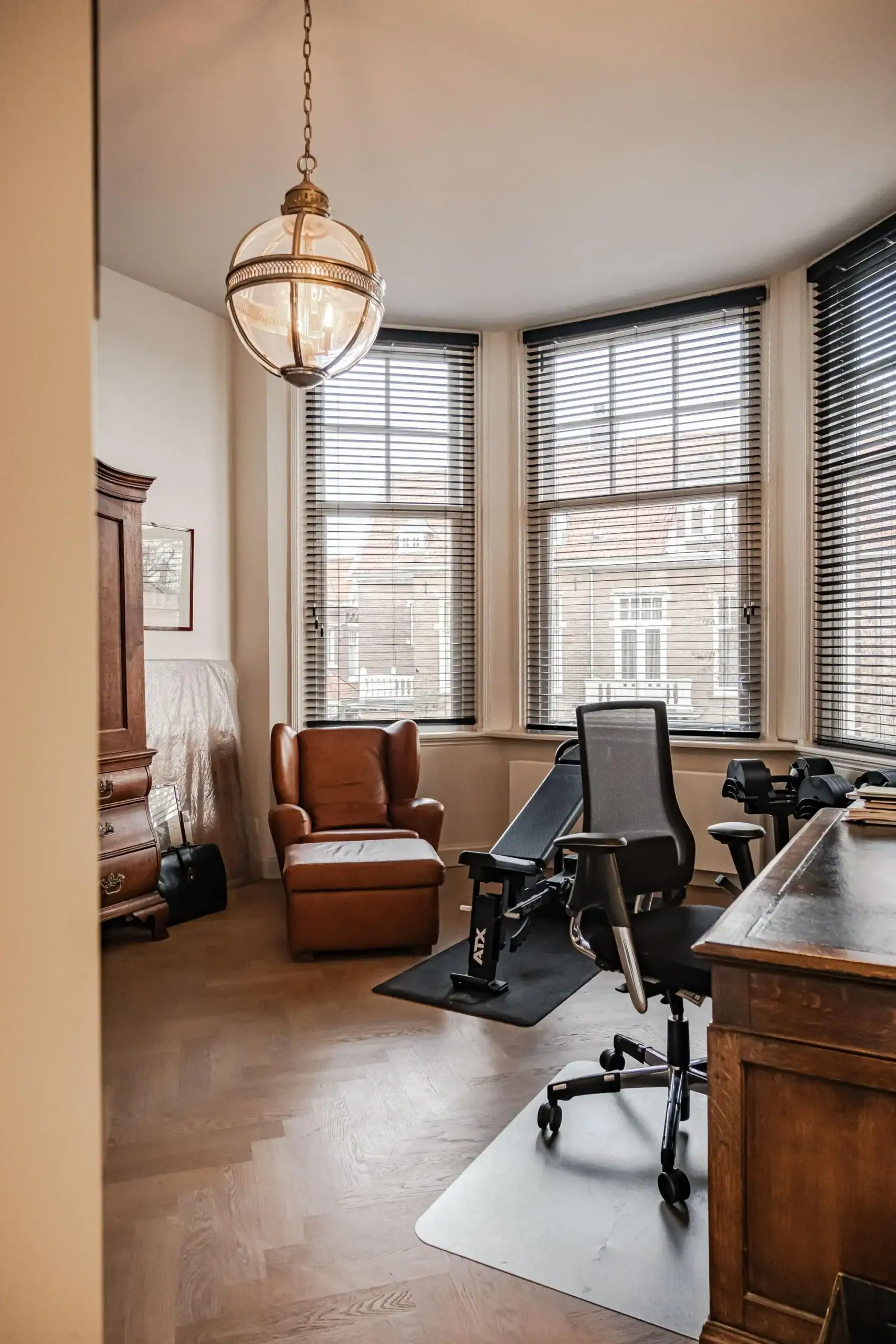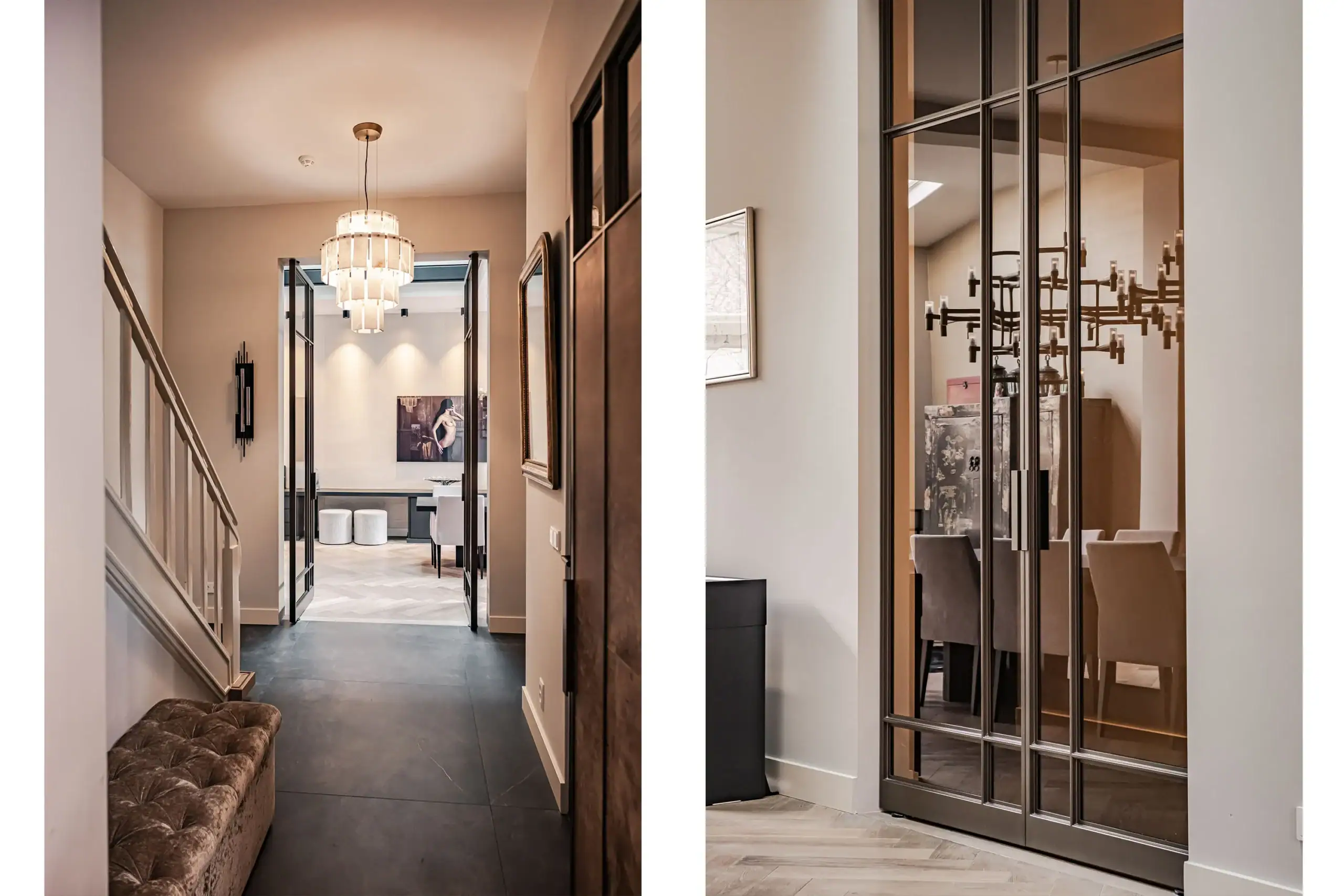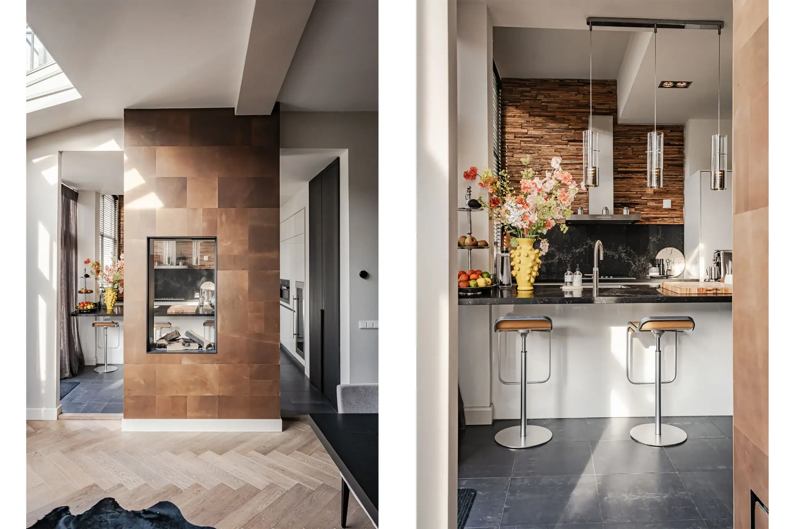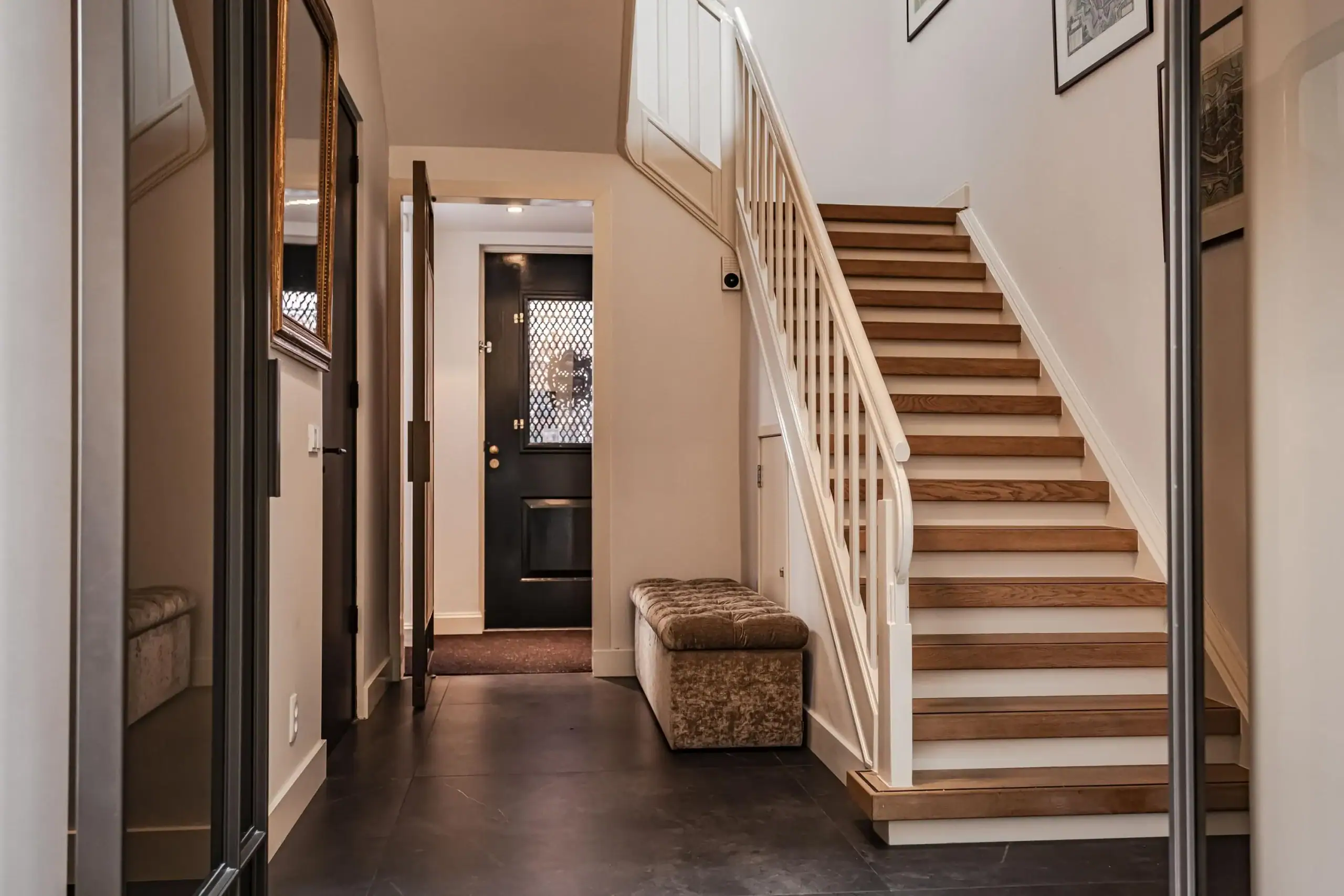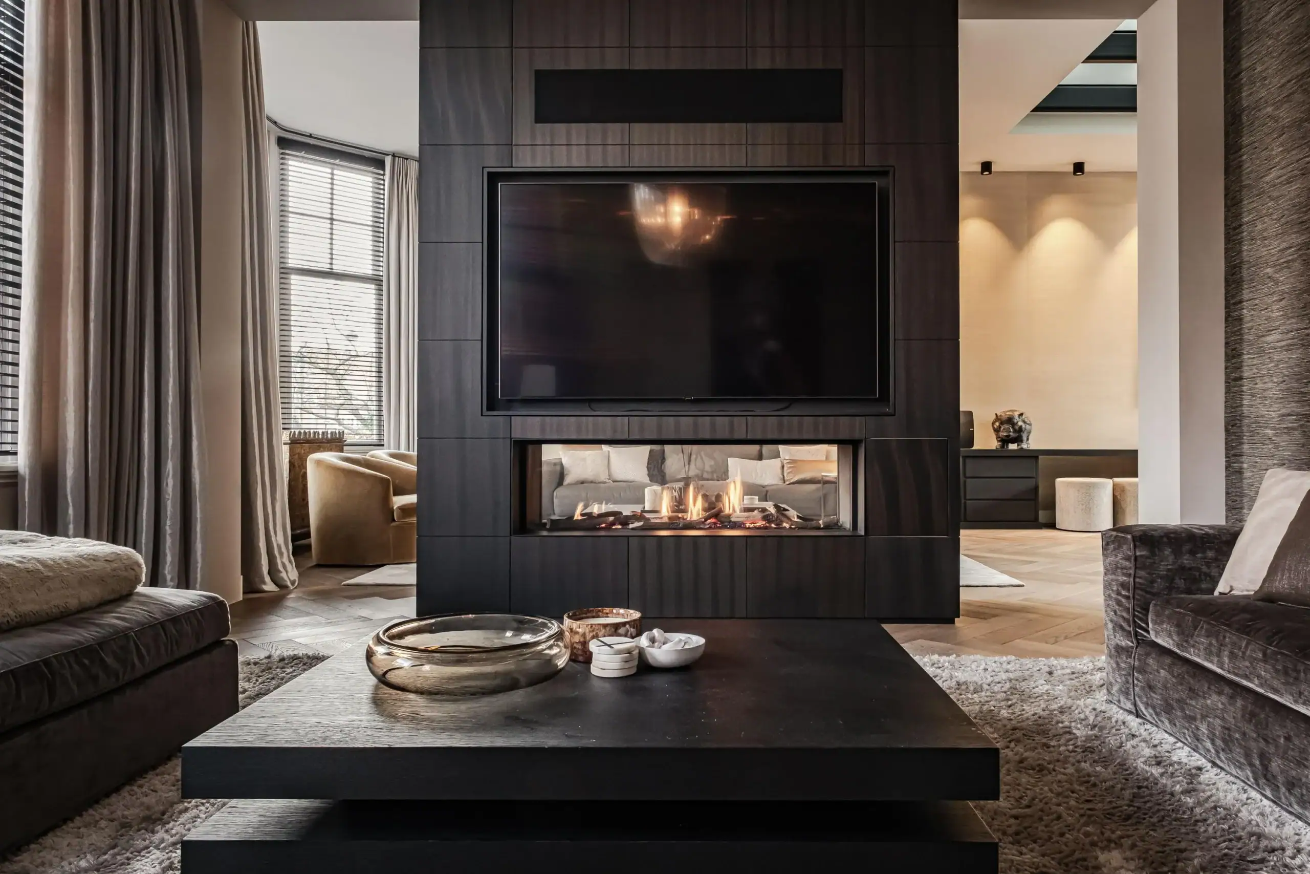 The wow factor is evident throughout the house, though there are a few elements that really stand out. First of all, the impressive atrium with its modern glass structure at the heart of the house. This allows fantastic natural light to flood onto every floor and, together with the high ceilings, creates an overwhelming sense of space and freedom. Then there are the imposing pivot doors and the room dividers with gas fireplaces on the ground floor; the interior is custom-made and uses natural materials such as wood and leather. The large open-plan kitchen features a sleek black worktop, a bar area and luxury built-in appliances. It is the perfect spot for drinks with friends or a (large) family and is directly connected to the dining room. Last but not least: the beautiful staircase; the landing staircase and the balustrade with wood carvings are a wonderful tribute to the property’s historic character. The home exudes not only space, luxury and character, but above all cosiness and home comfort.