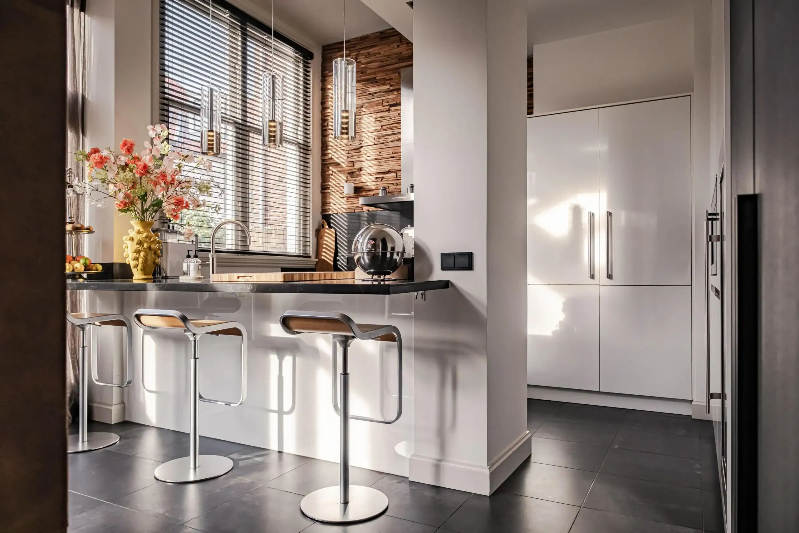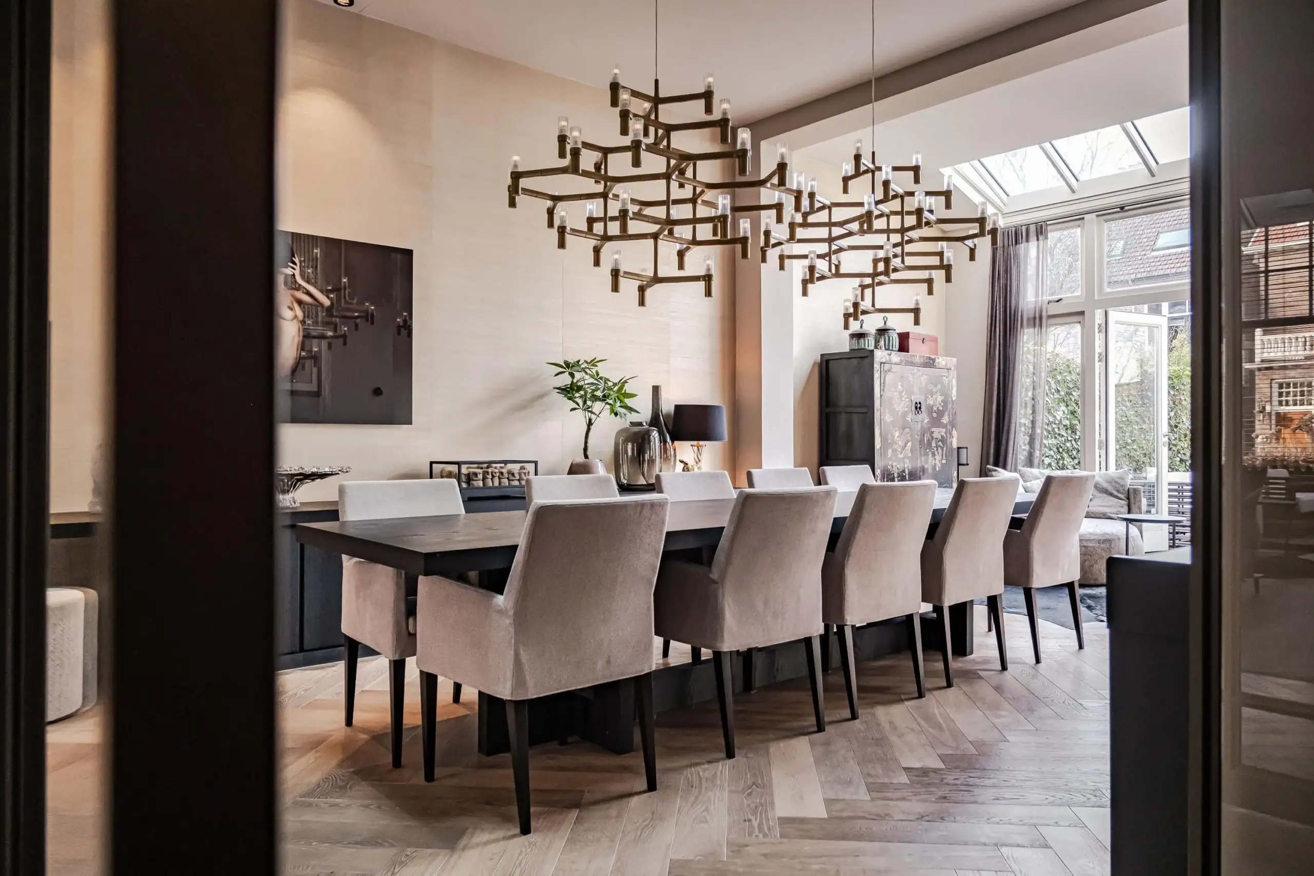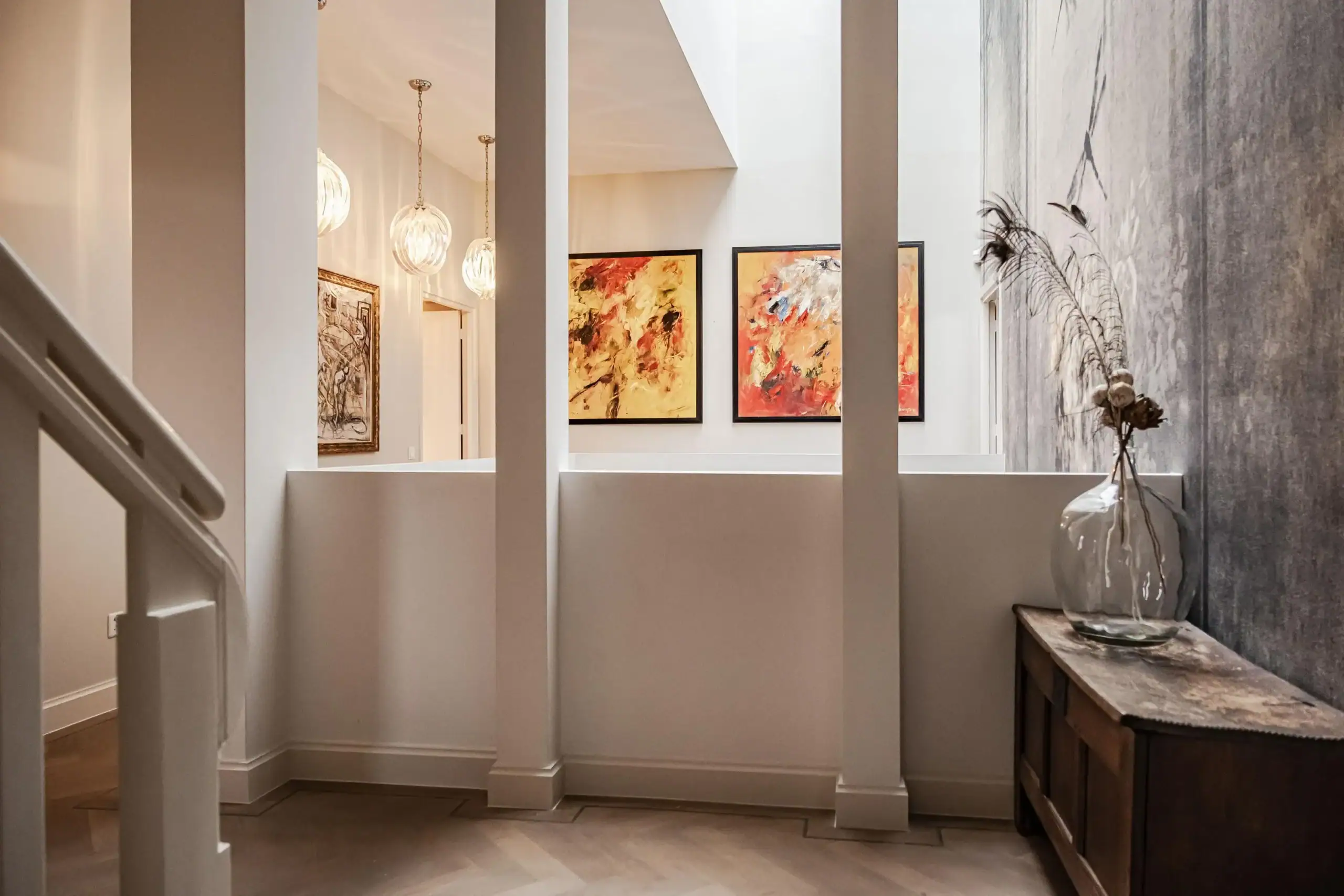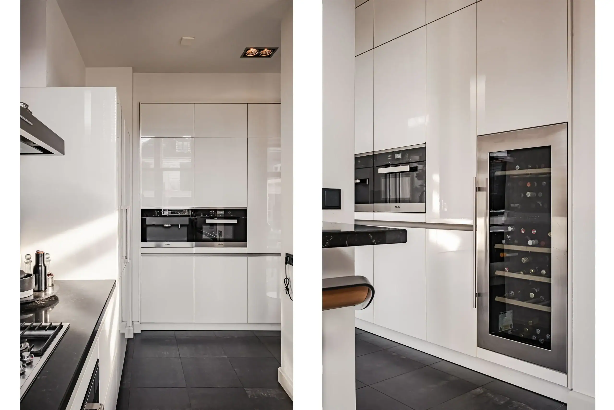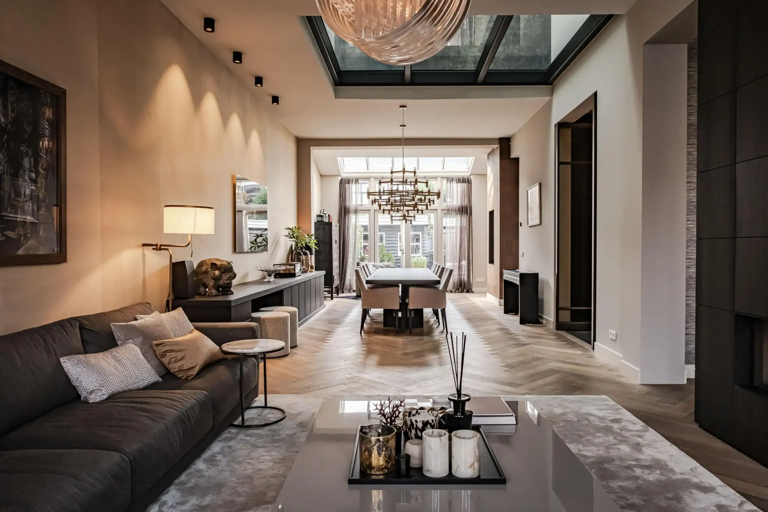 The wow factor is evident throughout the house, though there are a few elements that really stand out. First of all, the impressive atrium with its modern glass structure at the heart of the house. This allows fantastic natural light to flood onto every floor and, together with the high ceilings, creates an overwhelming sense of space and freedom. Then there are the imposing pivot doors and the room dividers with gas fireplaces on the ground floor; the interior is custom-made and uses natural materials such as wood and leather. The large open-plan kitchen features a sleek black worktop, a bar area and luxury built-in appliances. It is the perfect spot for drinks with friends or a (large) family and is directly connected to the dining room. Last but not least: the beautiful staircase; the landing staircase and the balustrade with wood carvings are a wonderful tribute to the property’s historic character. The home exudes not only space, luxury and character, but above all cosiness and home comfort.