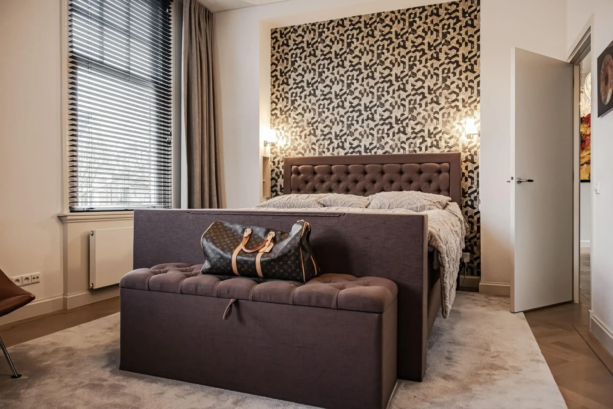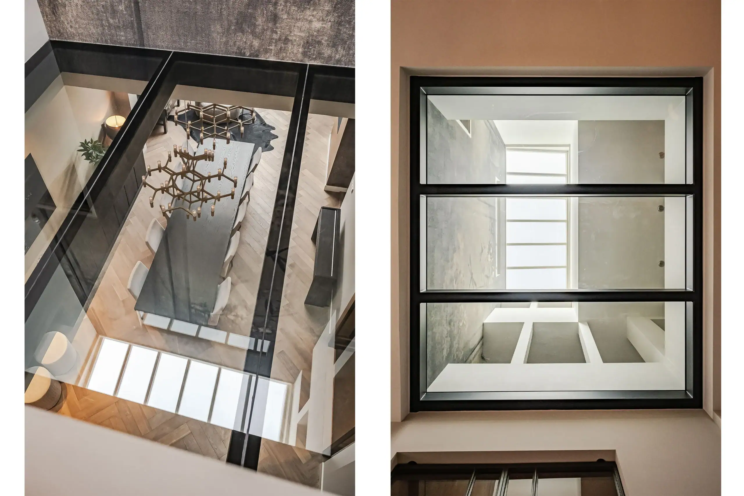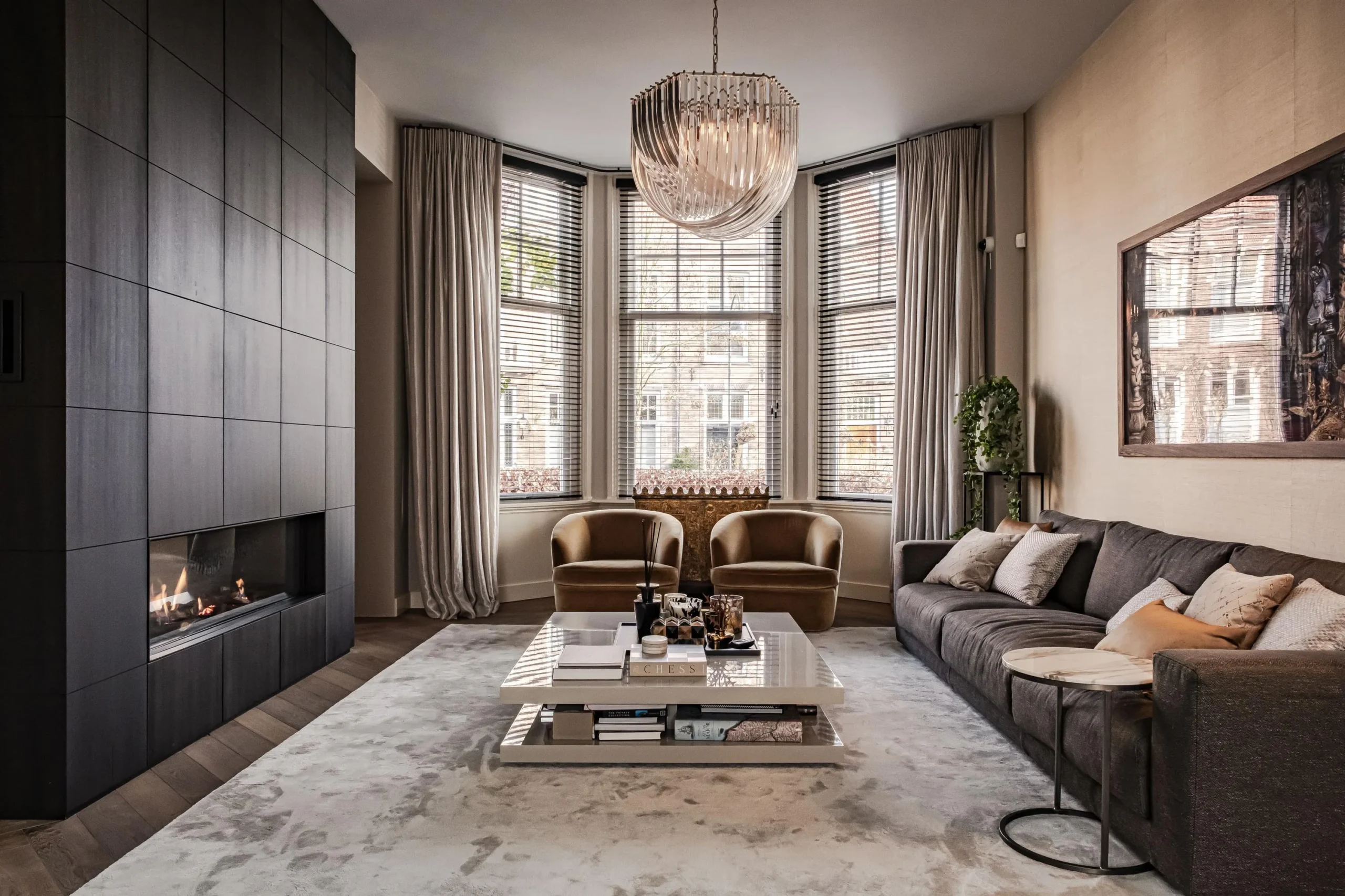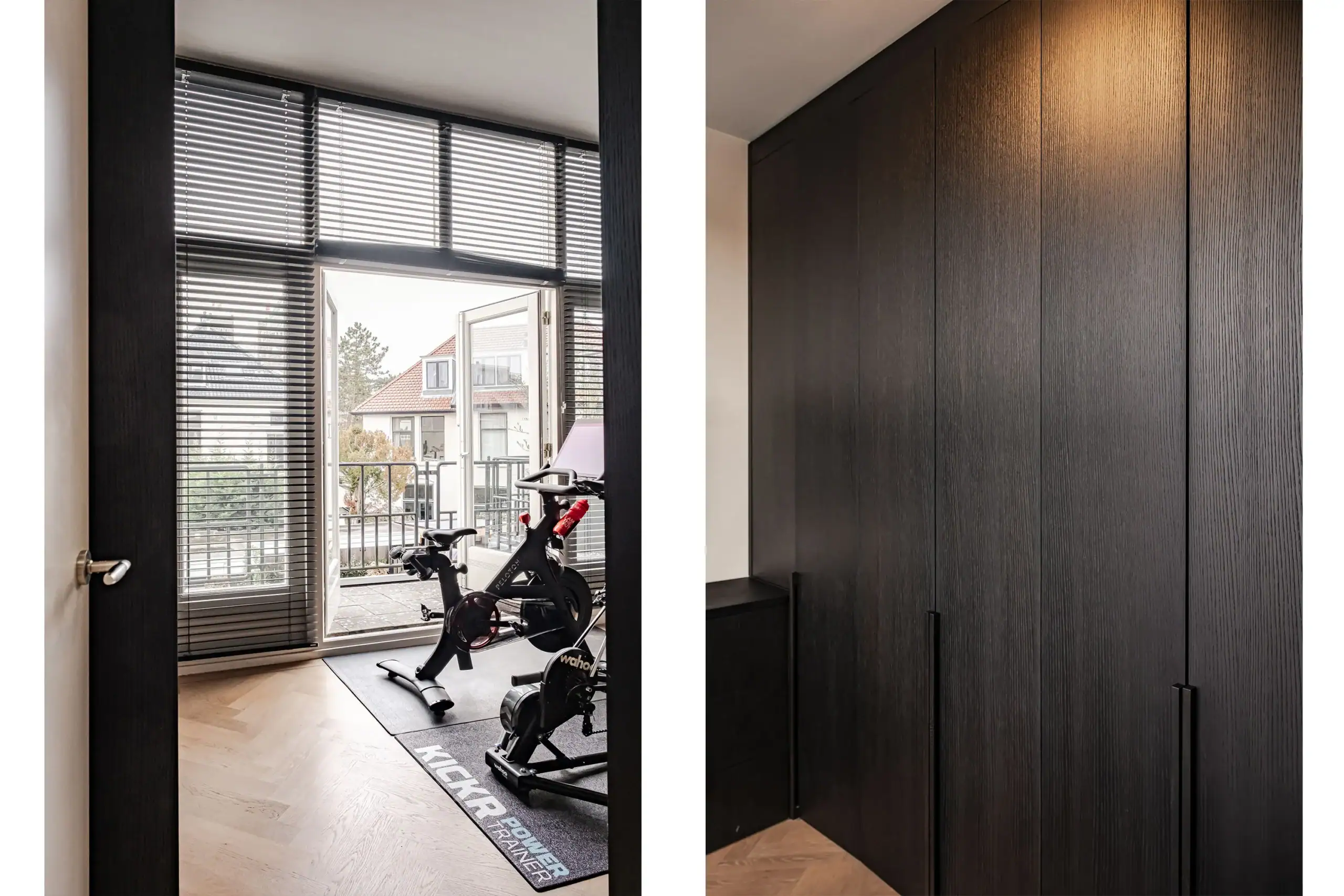 The wow factor is evident throughout the house, though there are a few elements that really stand out. First of all, the impressive atrium with its modern glass structure at the heart of the house. This allows fantastic natural light to flood onto every floor and, together with the high ceilings, creates an overwhelming sense of space and freedom. Then there are the imposing pivot doors and the room dividers with gas fireplaces on the ground floor; the interior is custom-made and uses natural materials such as wood and leather. The large open-plan kitchen features a sleek black worktop, a bar area and luxury built-in appliances. It is the perfect spot for drinks with friends or a (large) family and is directly connected to the dining room. Last but not least: the beautiful staircase; the landing staircase and the balustrade with wood carvings are a wonderful tribute to the property’s historic character. The home exudes not only space, luxury and character, but above all cosiness and home comfort.