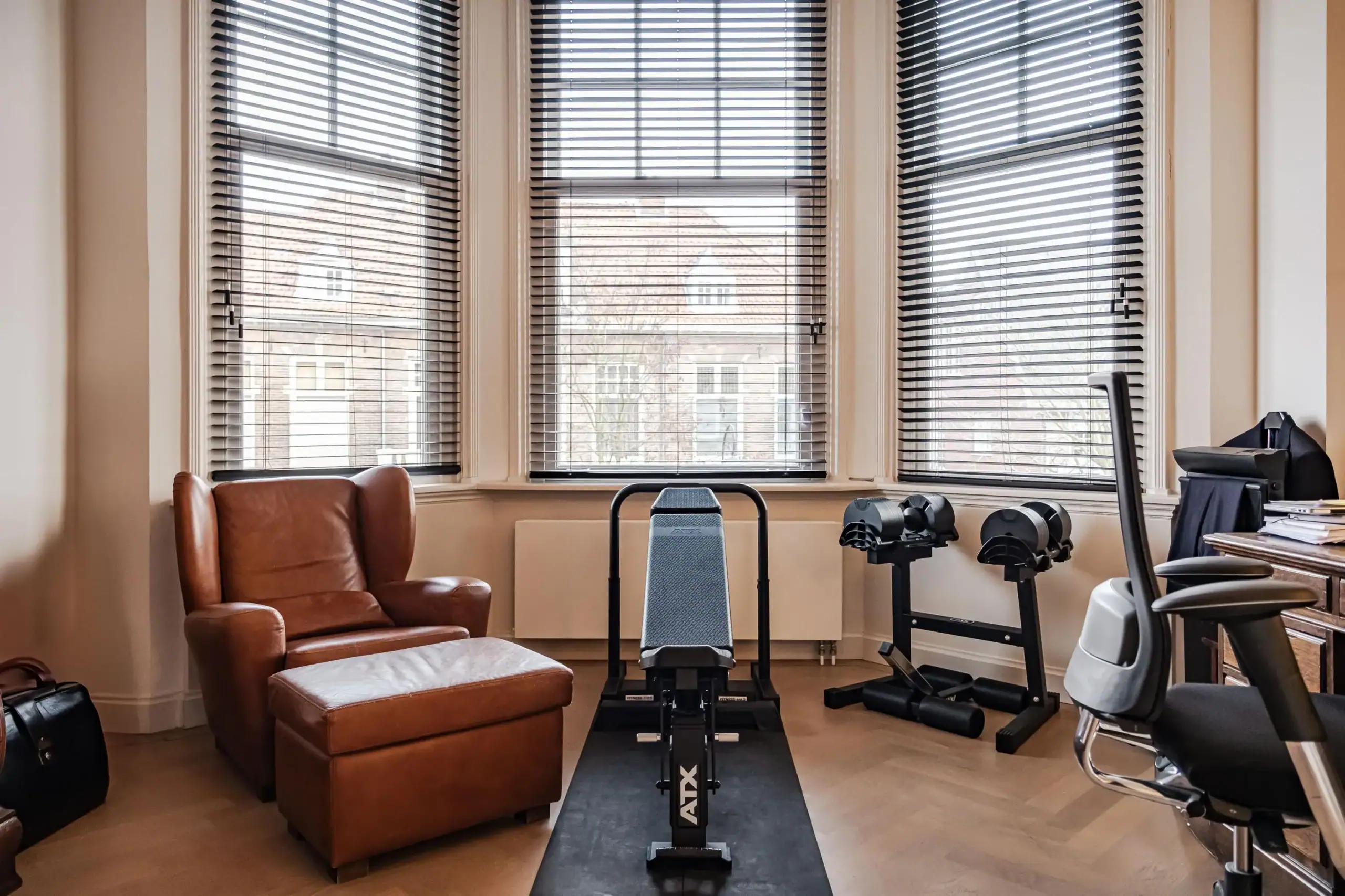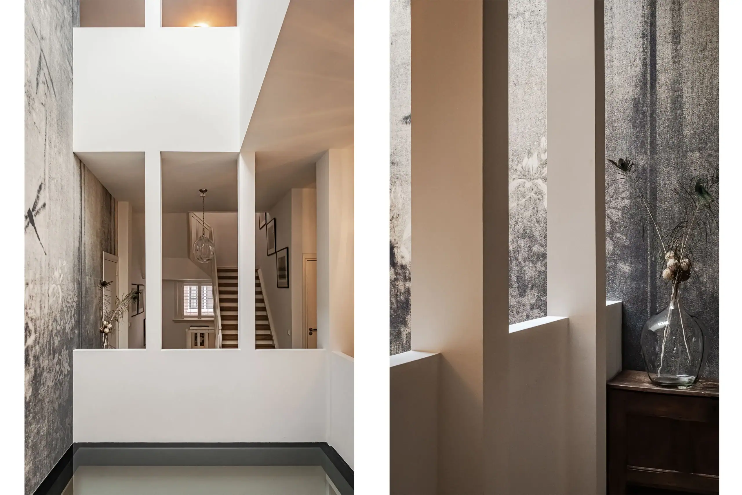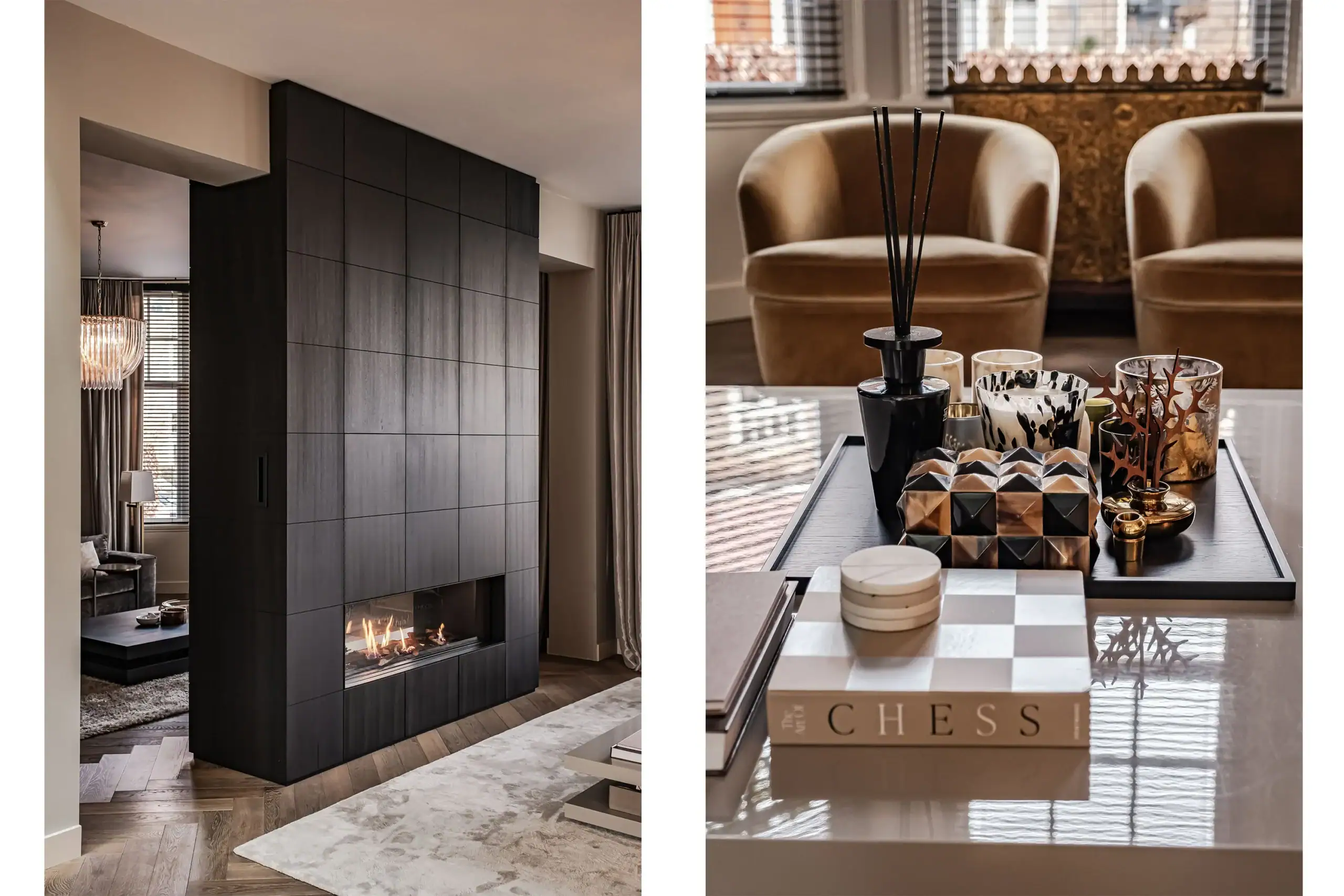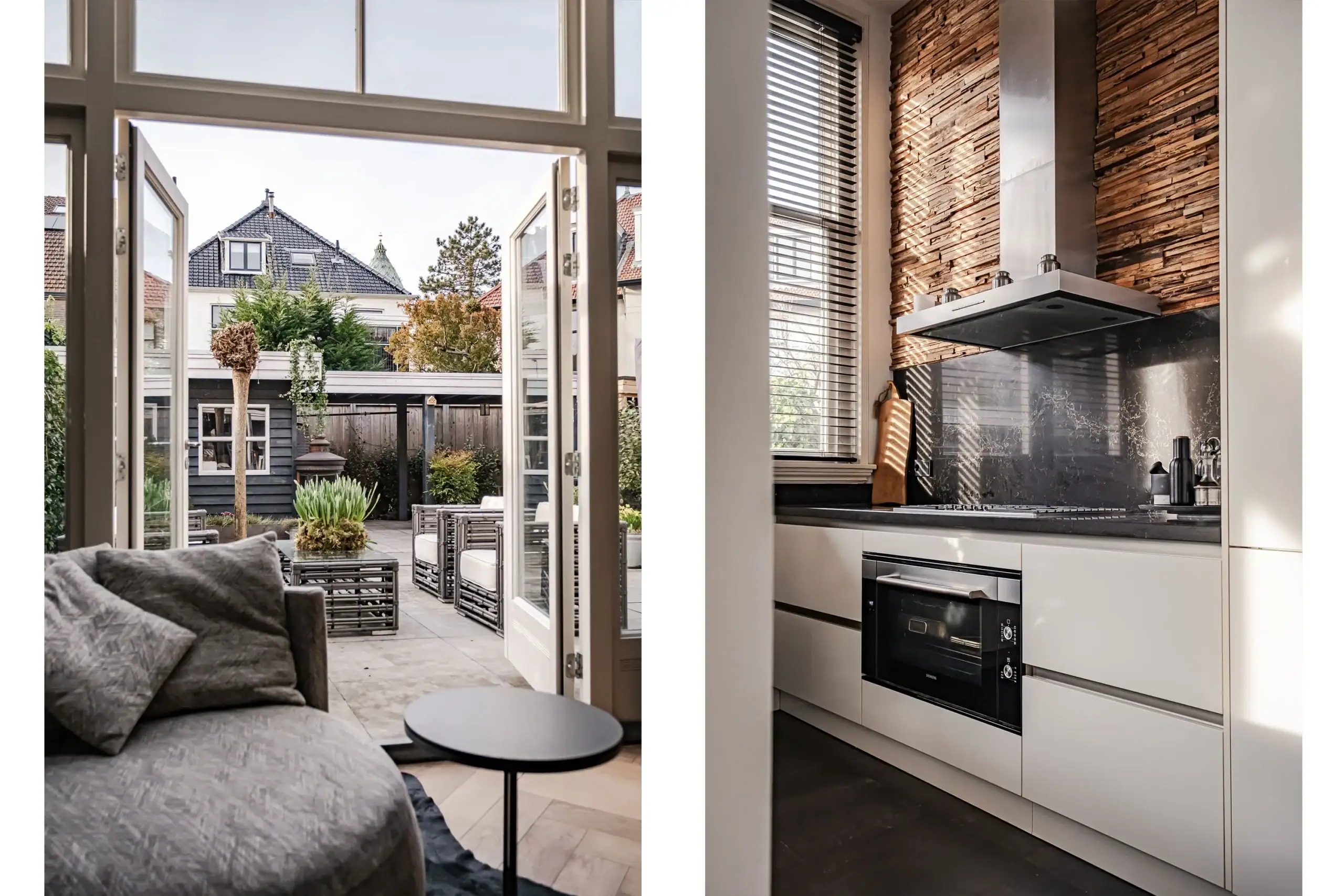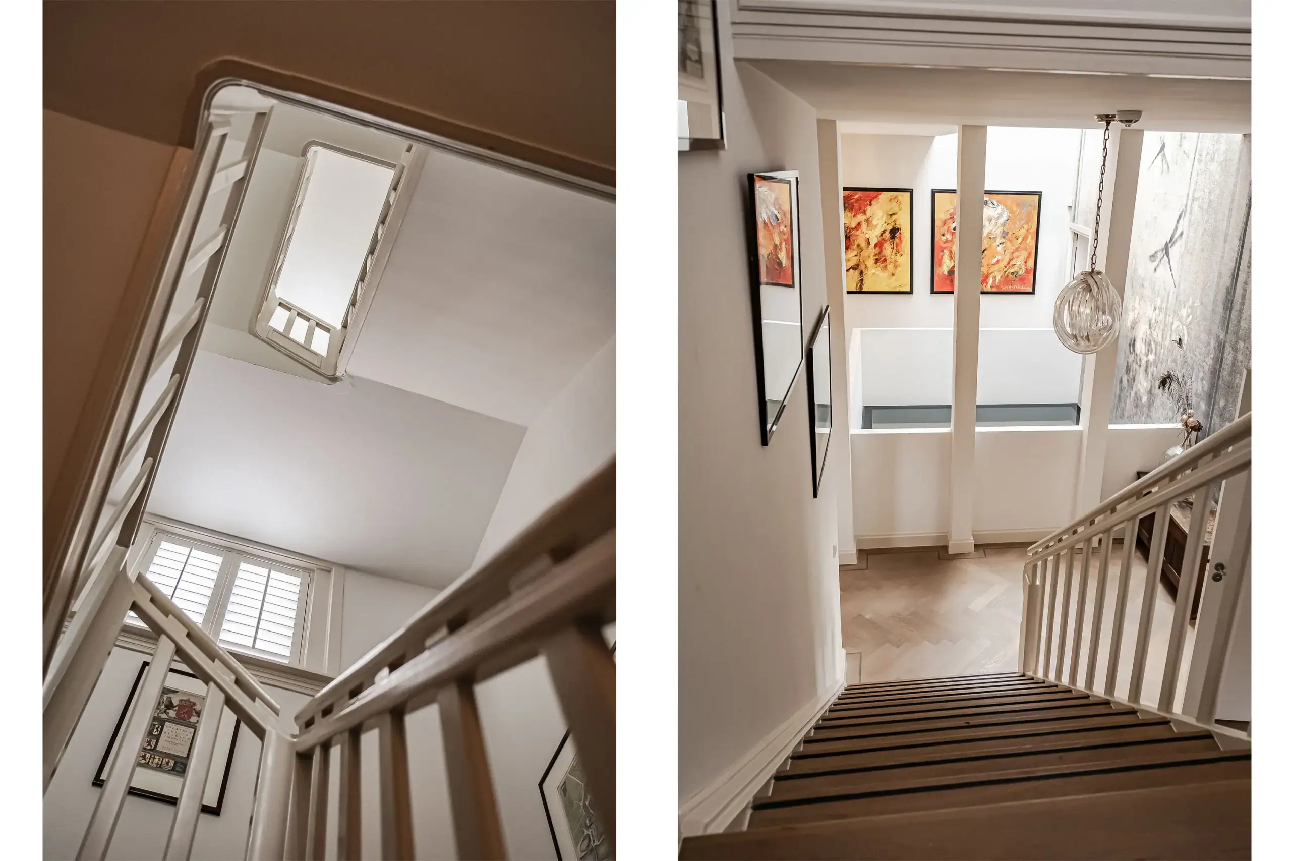 The wow factor is evident throughout the house, though there are a few elements that really stand out. First of all, the impressive atrium with its modern glass structure at the heart of the house. This allows fantastic natural light to flood onto every floor and, together with the high ceilings, creates an overwhelming sense of space and freedom. Then there are the imposing pivot doors and the room dividers with gas fireplaces on the ground floor; the interior is custom-made and uses natural materials such as wood and leather. The large open-plan kitchen features a sleek black worktop, a bar area and luxury built-in appliances. It is the perfect spot for drinks with friends or a (large) family and is directly connected to the dining room. Last but not least: the beautiful staircase; the landing staircase and the balustrade with wood carvings are a wonderful tribute to the property’s historic character. The home exudes not only space, luxury and character, but above all cosiness and home comfort.
