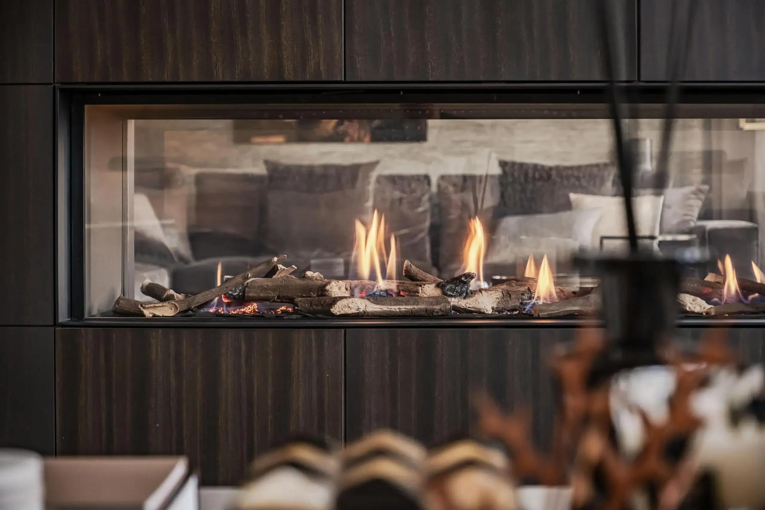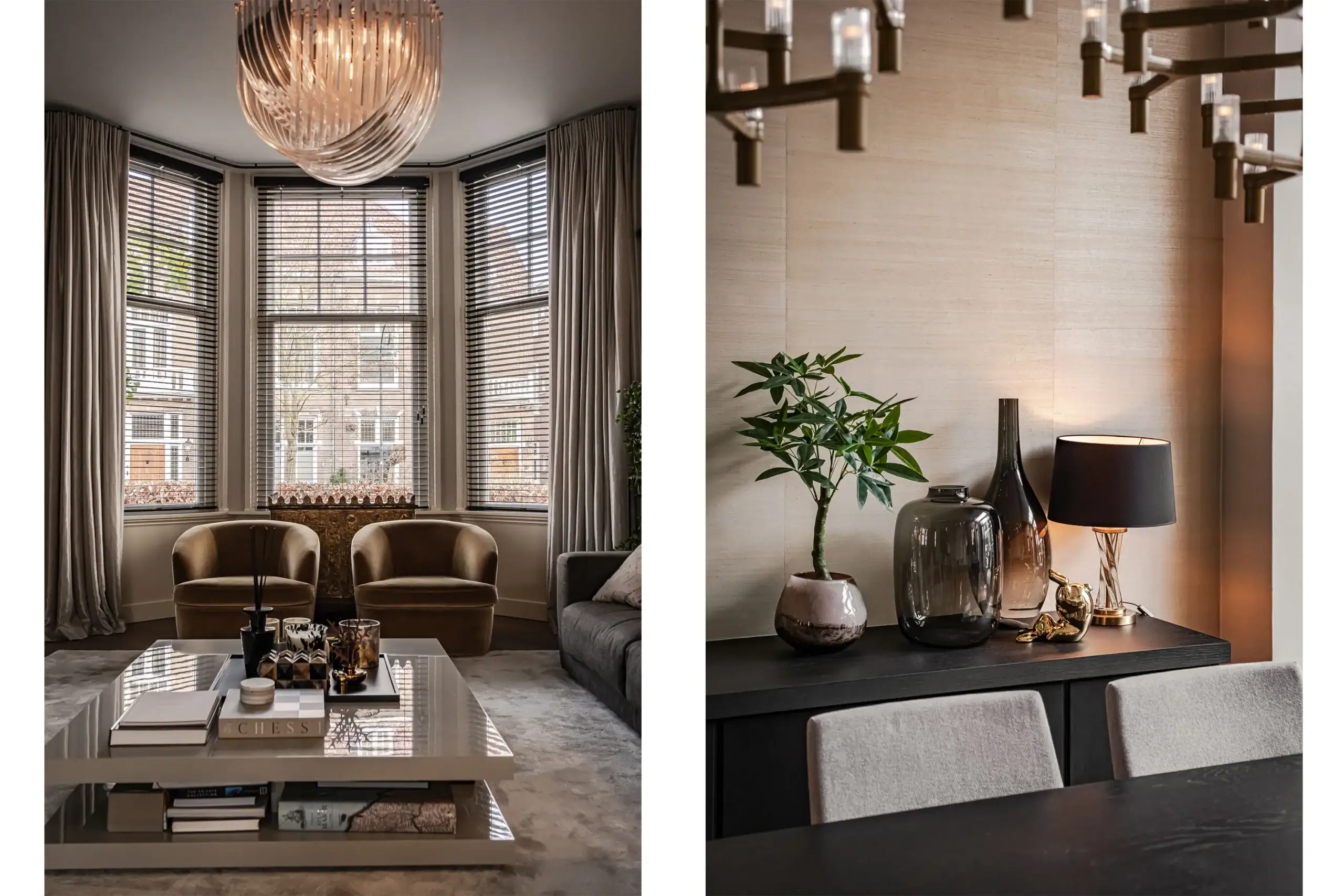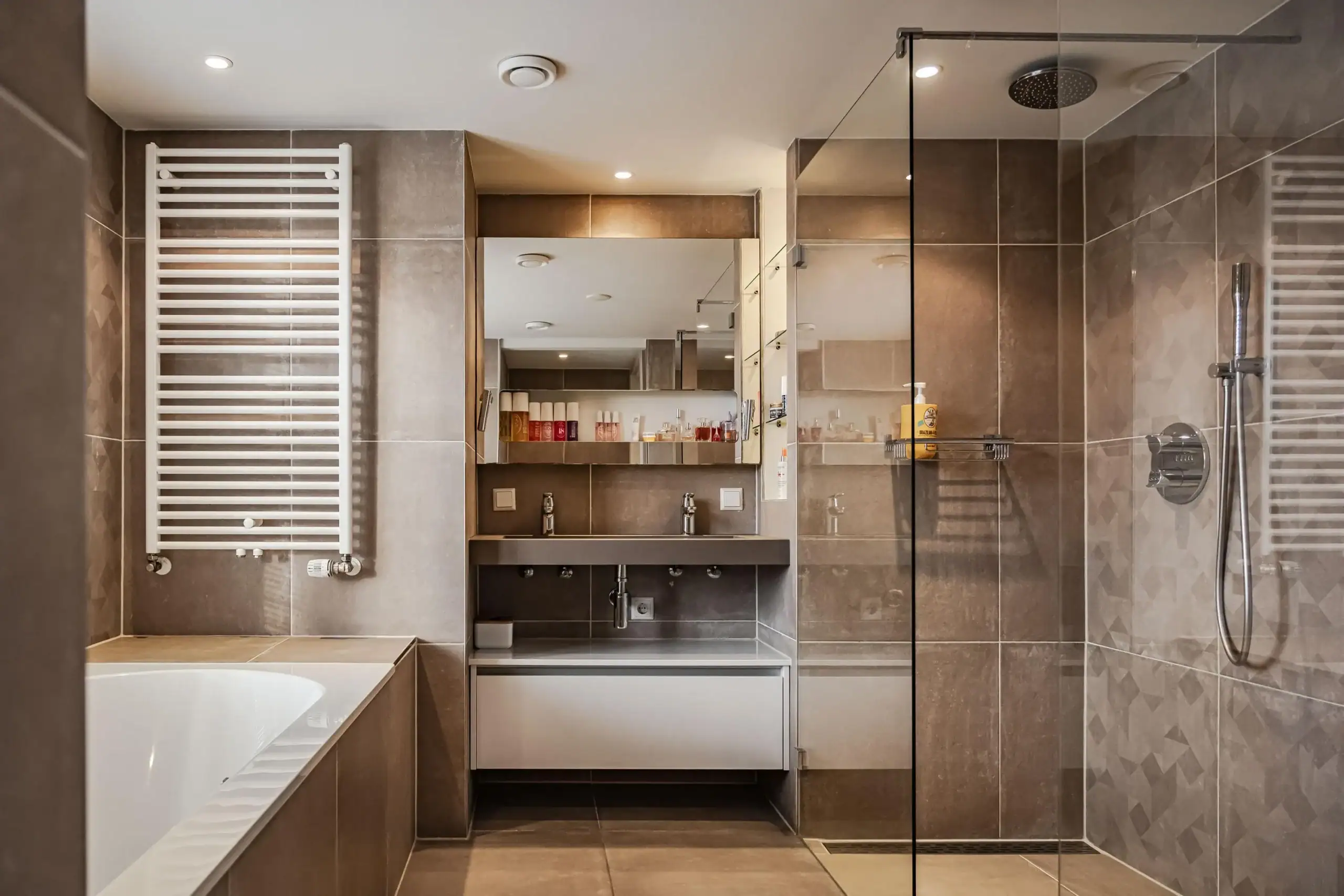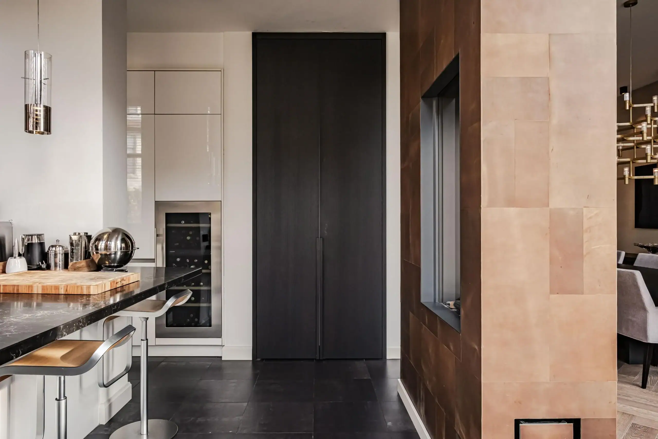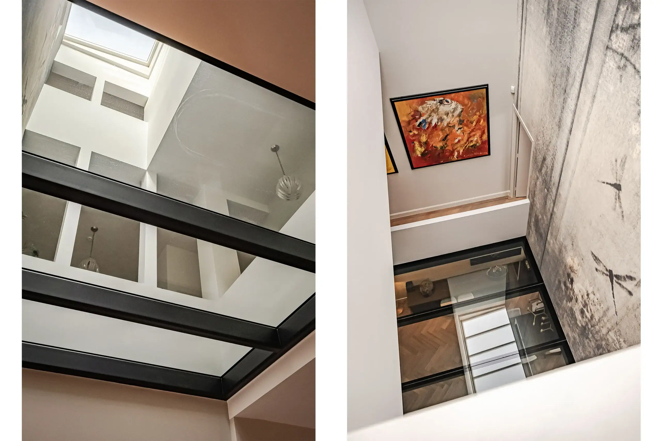 The wow factor is evident throughout the house, though there are a few elements that really stand out. First of all, the impressive atrium with its modern glass structure at the heart of the house. This allows fantastic natural light to flood onto every floor and, together with the high ceilings, creates an overwhelming sense of space and freedom. Then there are the imposing pivot doors and the room dividers with gas fireplaces on the ground floor; the interior is custom-made and uses natural materials such as wood and leather. The large open-plan kitchen features a sleek black worktop, a bar area and luxury built-in appliances. It is the perfect spot for drinks with friends or a (large) family and is directly connected to the dining room. Last but not least: the beautiful staircase; the landing staircase and the balustrade with wood carvings are a wonderful tribute to the property’s historic character. The home exudes not only space, luxury and character, but above all cosiness and home comfort.