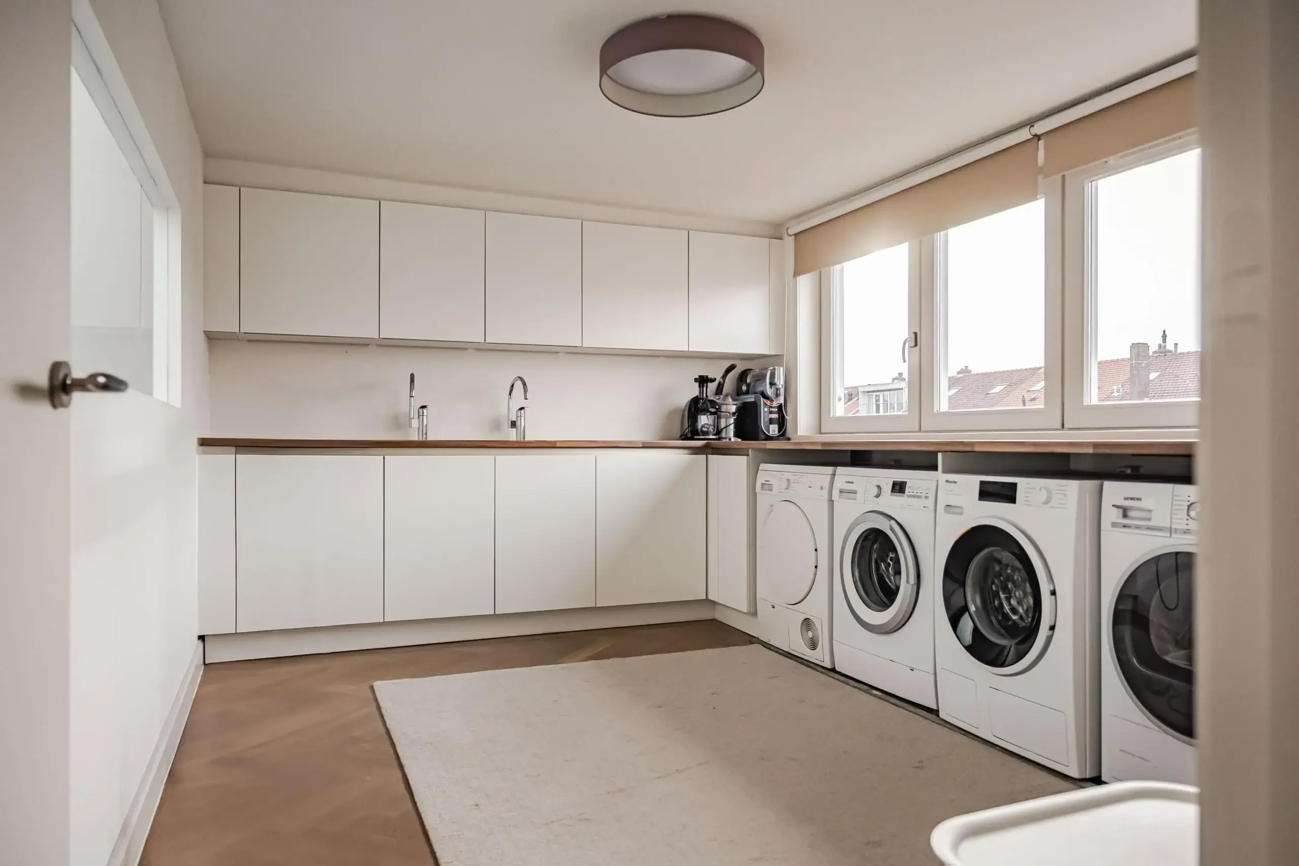 Large landing with access to all rooms. Bathroom with double walk-in shower featuring a rain shower, built-in taps and a hand shower, vanity unit with double washbasins, bath, mechanical ventilation and underfloor heating. Separate toilet with washbasin and mechanical ventilation. Laundry room with three washing machine connections and a tumble dryer connection, large worktop, ample cupboard space and two sinks. Utility cupboard containing a second central heating boiler, a mechanical ventilation system and an inverter for the solar panels. Front-facing bedroom with fitted wardrobe and large windows. A second front-facing bedroom, also with large windows.