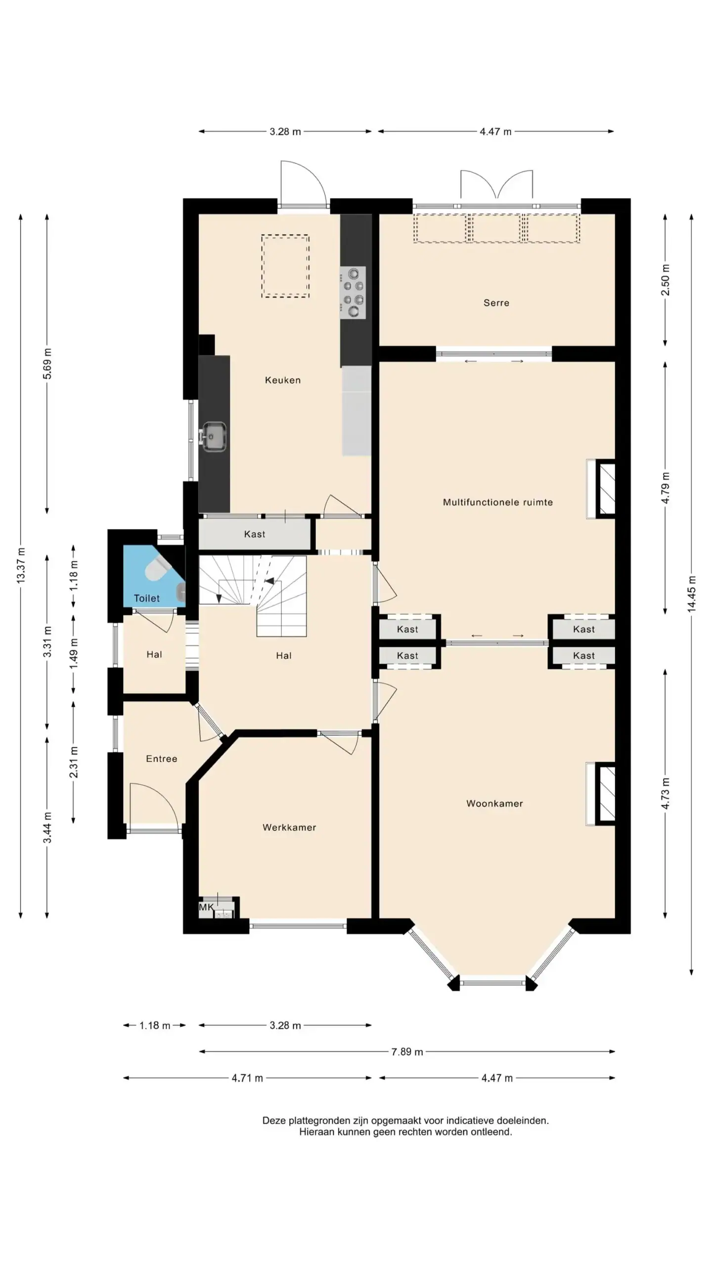 Front porch with vestibule, stained glass windows, small skylight and marble tiles. Through glass door you go to the hall. Large hall with wardrobe and separate toilet with fountain. From the hall access to several rooms. Living room with ensuite doors, two fireplaces and a conservatory. Opening doors to the garden. The wide garden is east facing and equipped with wooden shed with back and solar panels. Kitchen equipped with 5-burner stove Atag, wide oven by Atag, extractor Bosch, dishwasher Bosch, Quooker, large fridge and large freezer by Bosch, laminate tiles and also a door to the garden. Work room at the front with solid wood floor, chimney and meter cupboard.