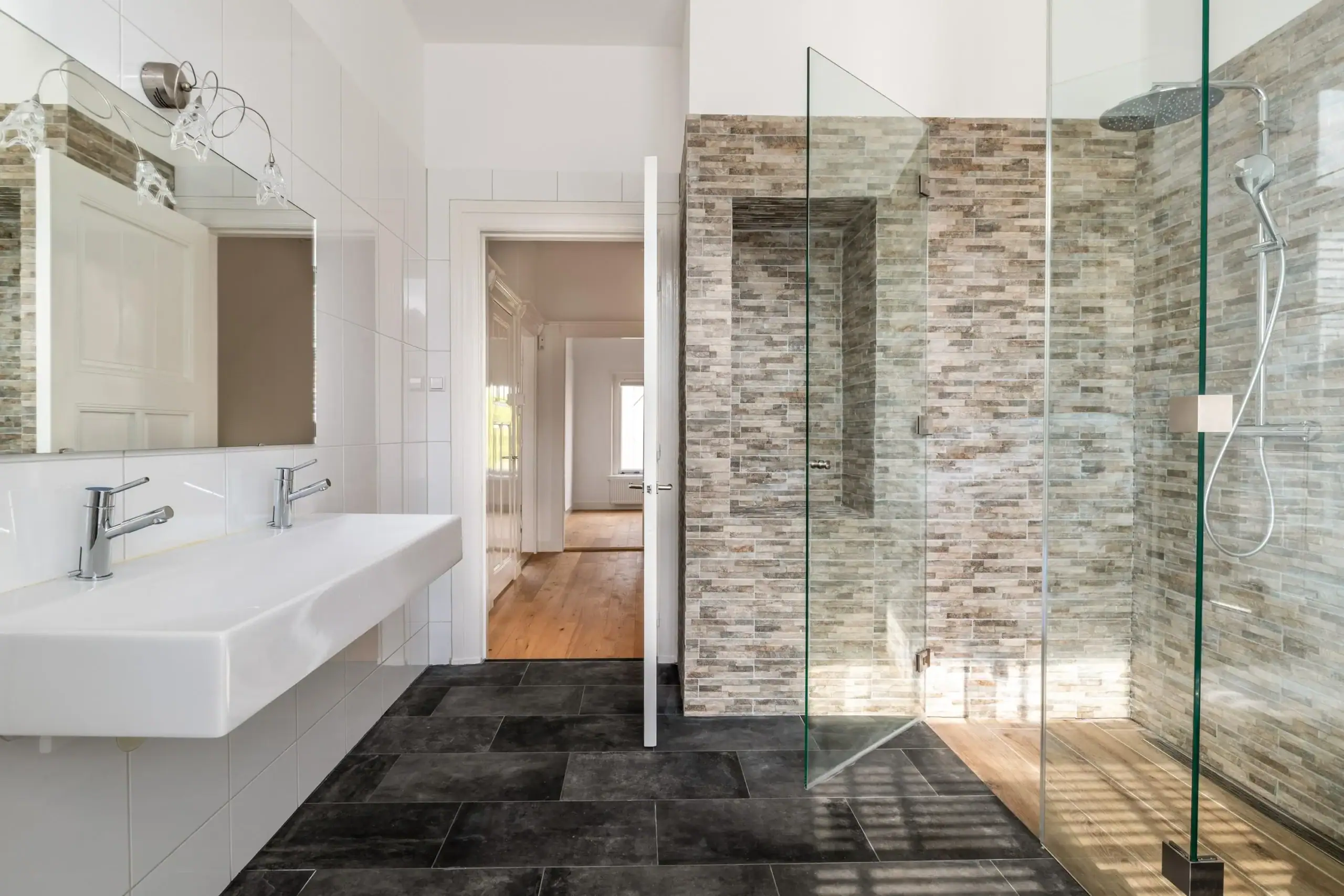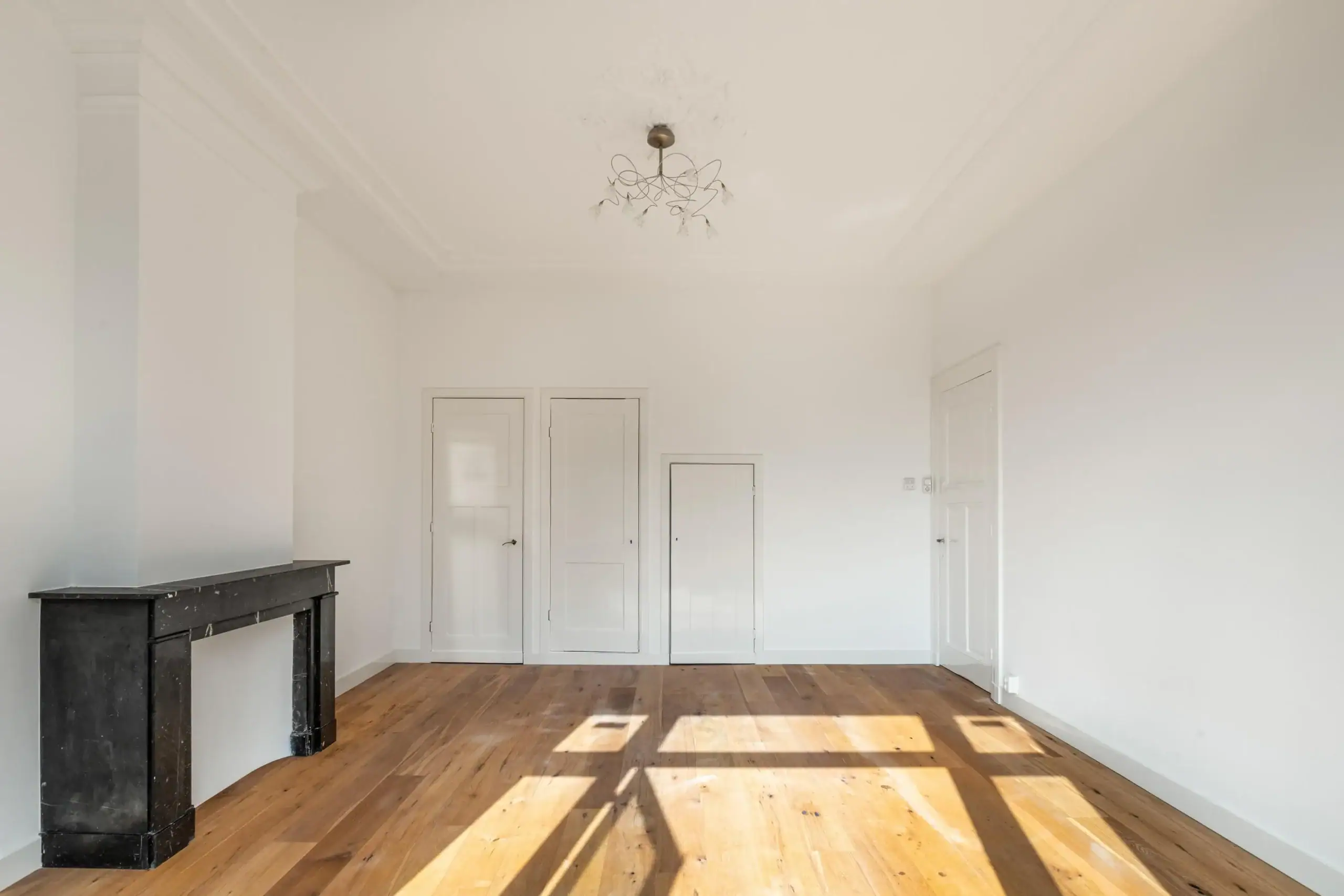 Front bedroom with fireplace with chimney. Second bedroom front with patio doors to north facing balcony, built-in closet, marble fireplace and rod division. Through walk-in closet passage to third bedroom. Third bedroom (master bedroom) with built-in closet, French doors to balcony facing east. Ensuite bathroom with giant shower equipped with rainfall shower and hand shower, large niche, toilet, bathtub and double sink.