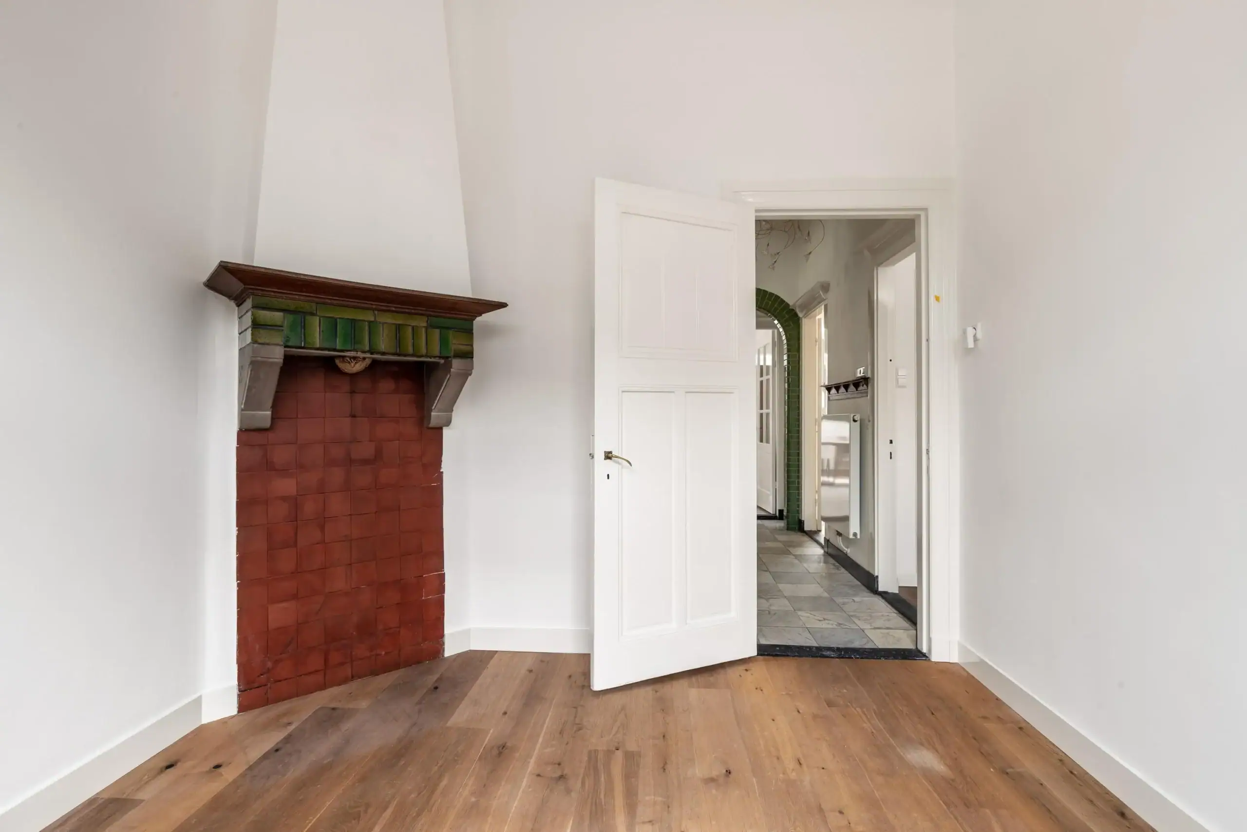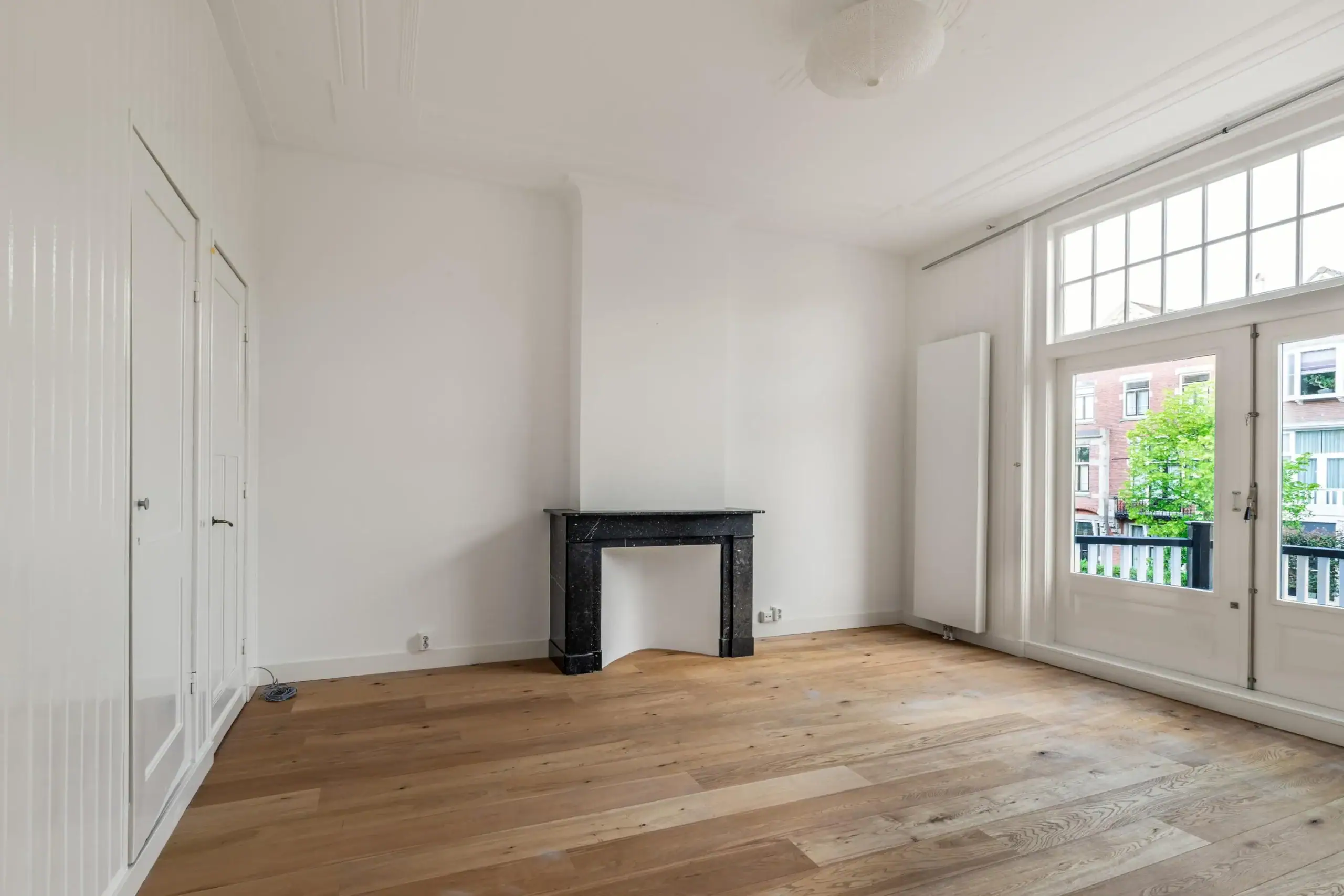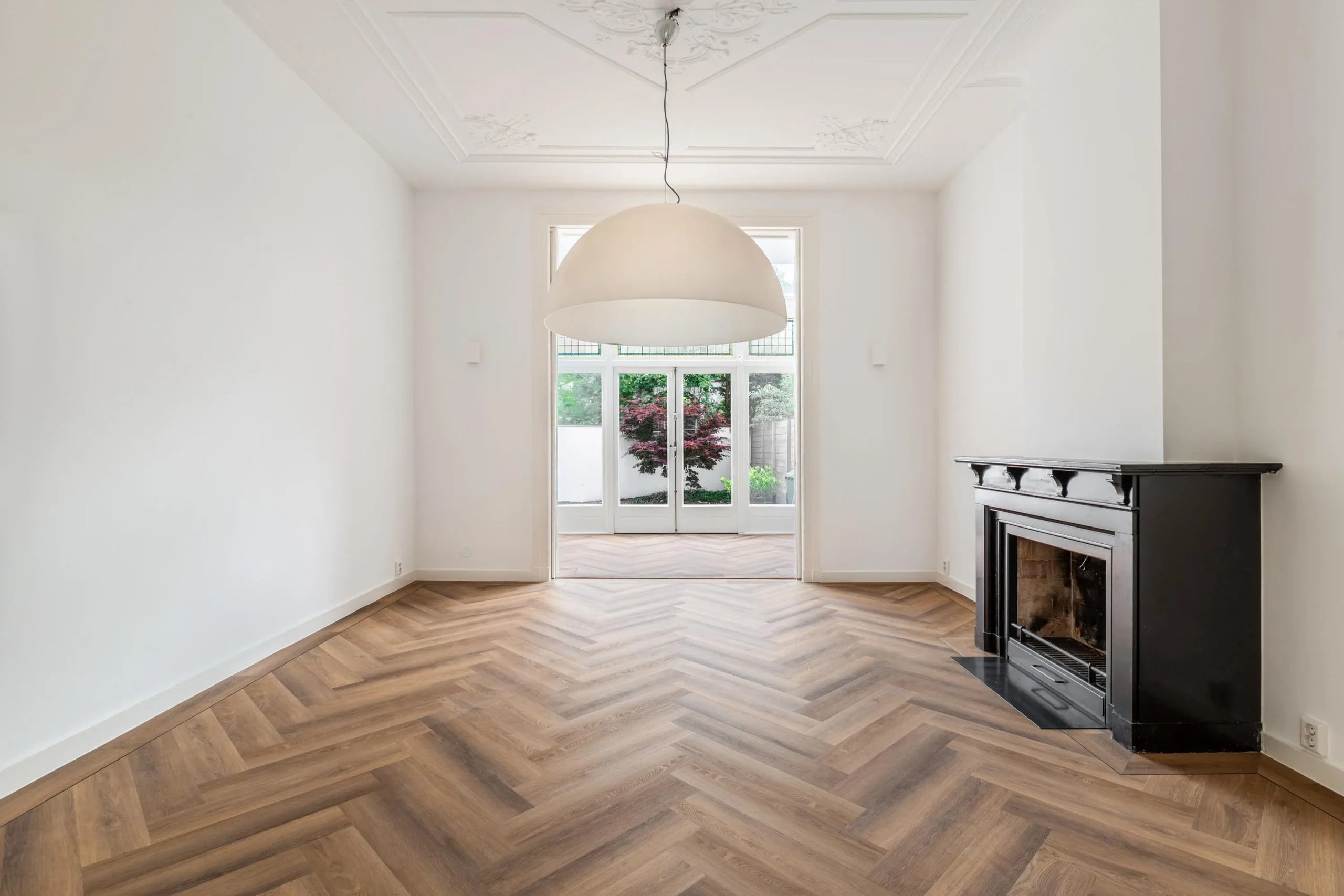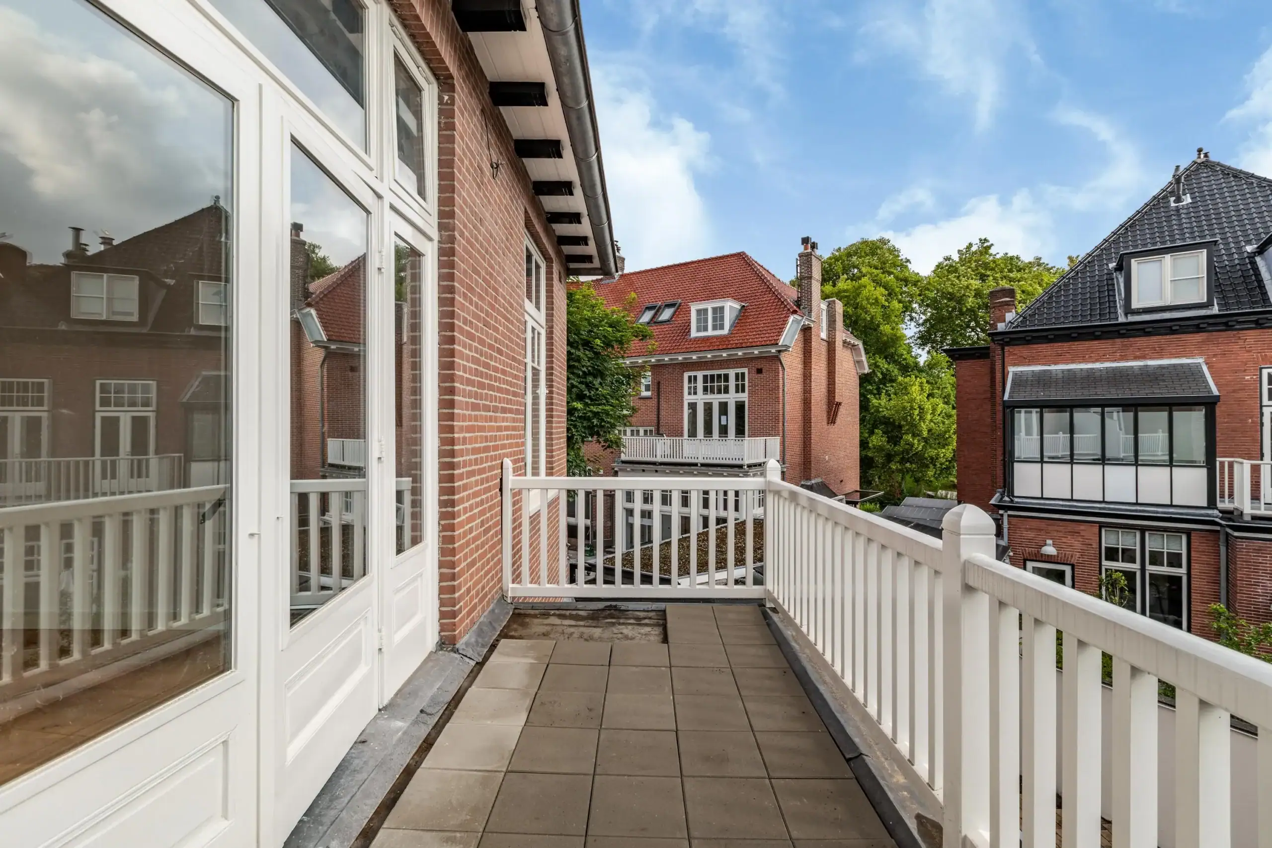 The entrance is majestic! There is a spacious front porch with a large, wide hallway beyond with stately staircase. The living kitchen is spacious with the authentic details and modern kitchen blending seamlessly. The perfect place to have drinks and dinner with friends or a (large) family. The living room en suite exudes tranquility and character with the classic but sturdy suite doors, high ceilings and two cozy fireplaces in the front and back room. There is also a study at the front. Through the French doors in the living room you enter the circa 12 meters wide backyard on the east and is because of the open space on the south side sunny all day. Divided over the two floors there are 5 spacious bedrooms and 2 bathrooms. Perfect for a large family!