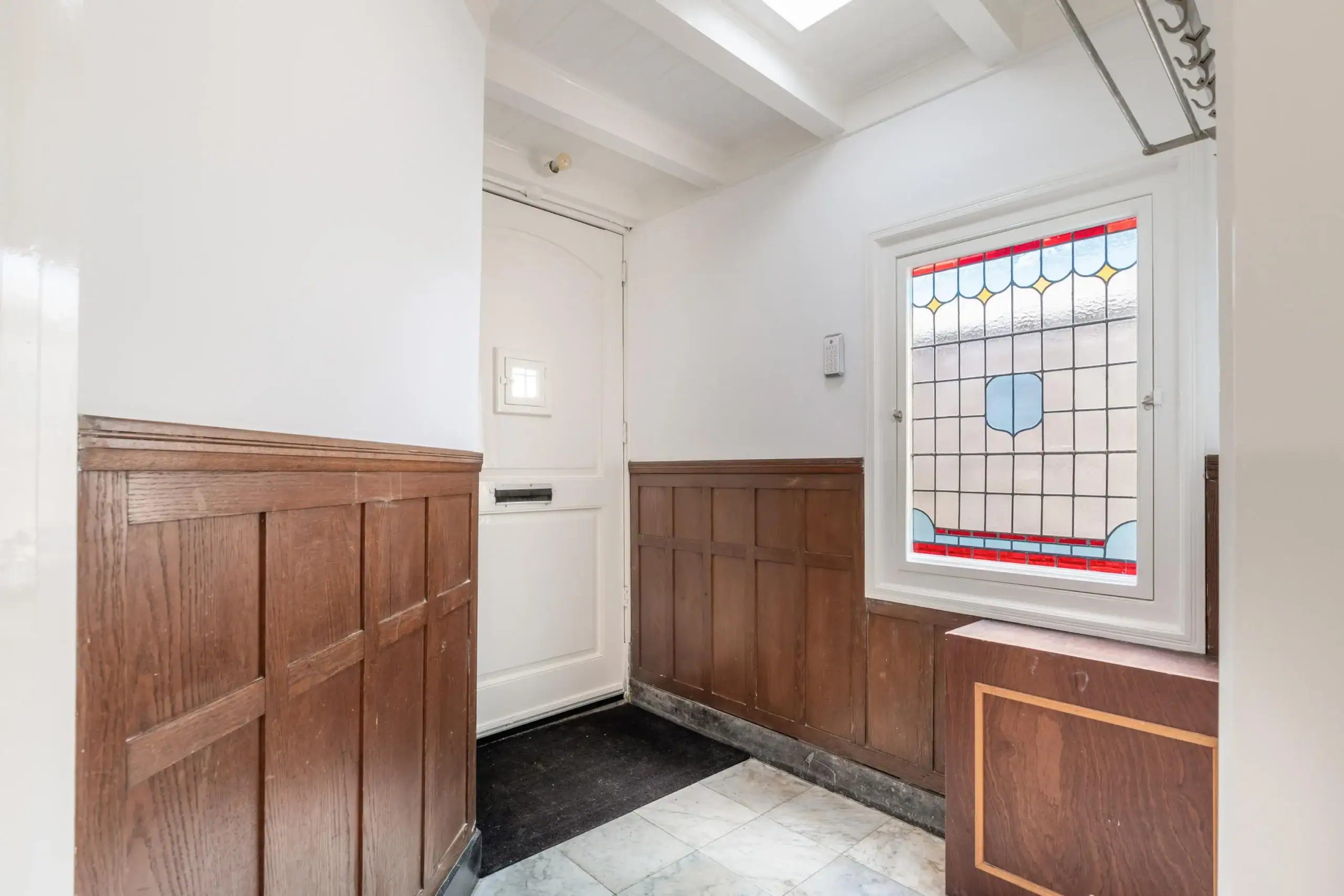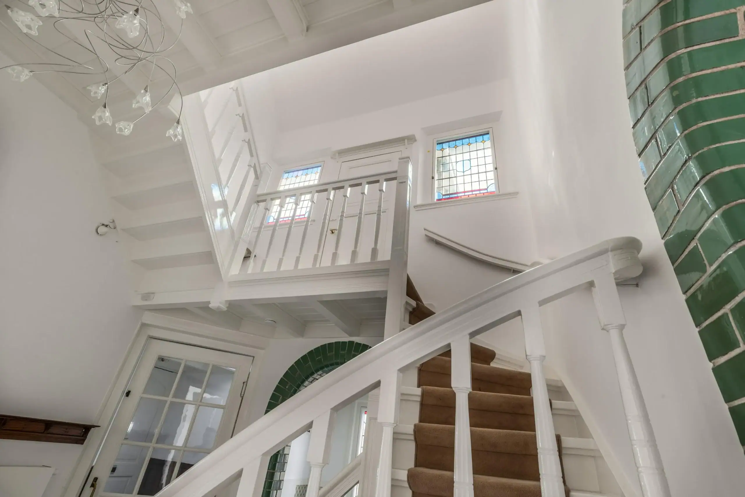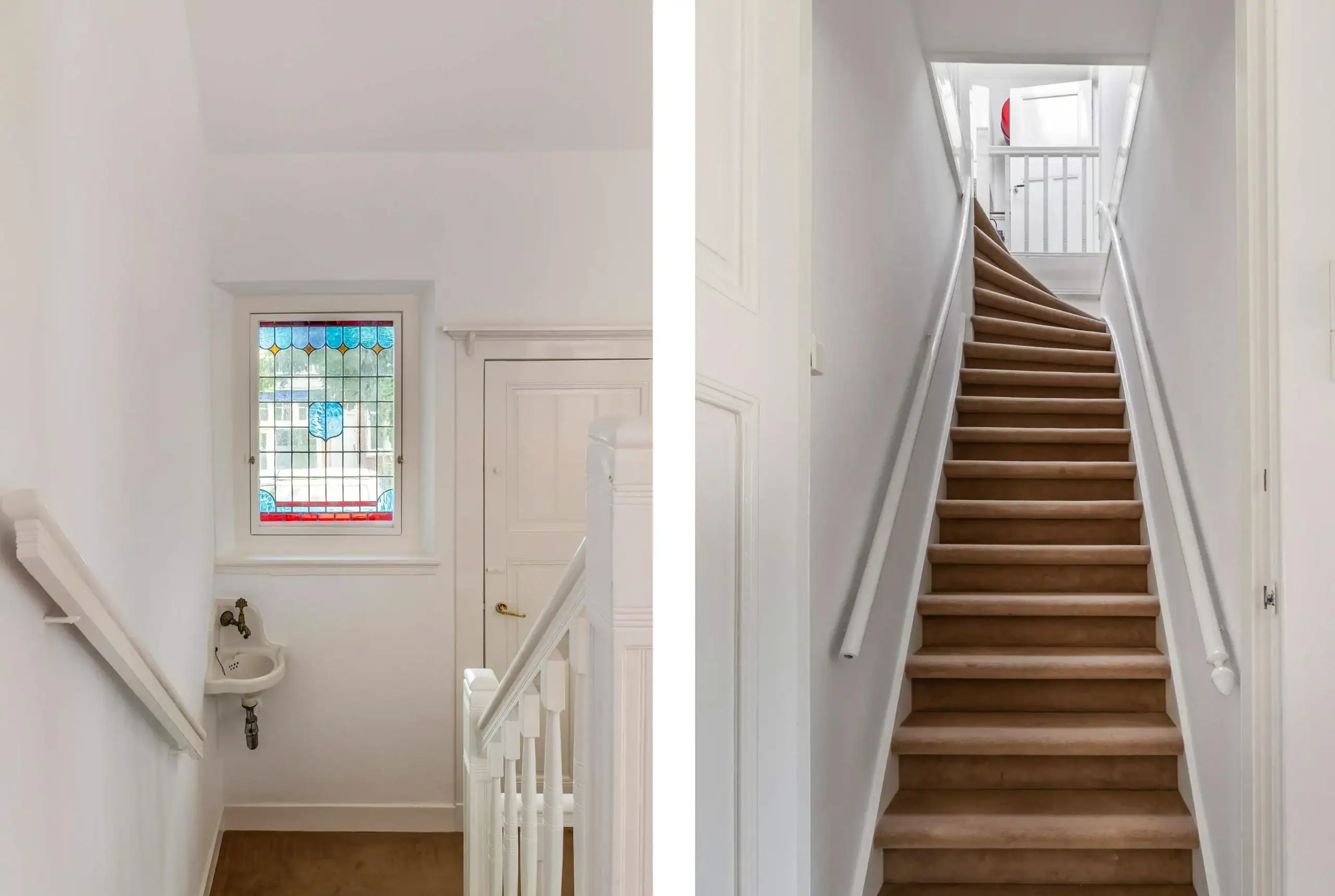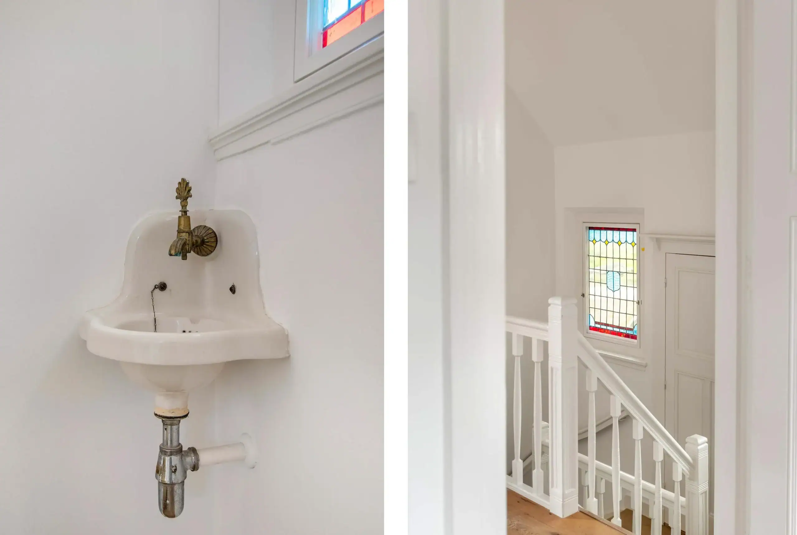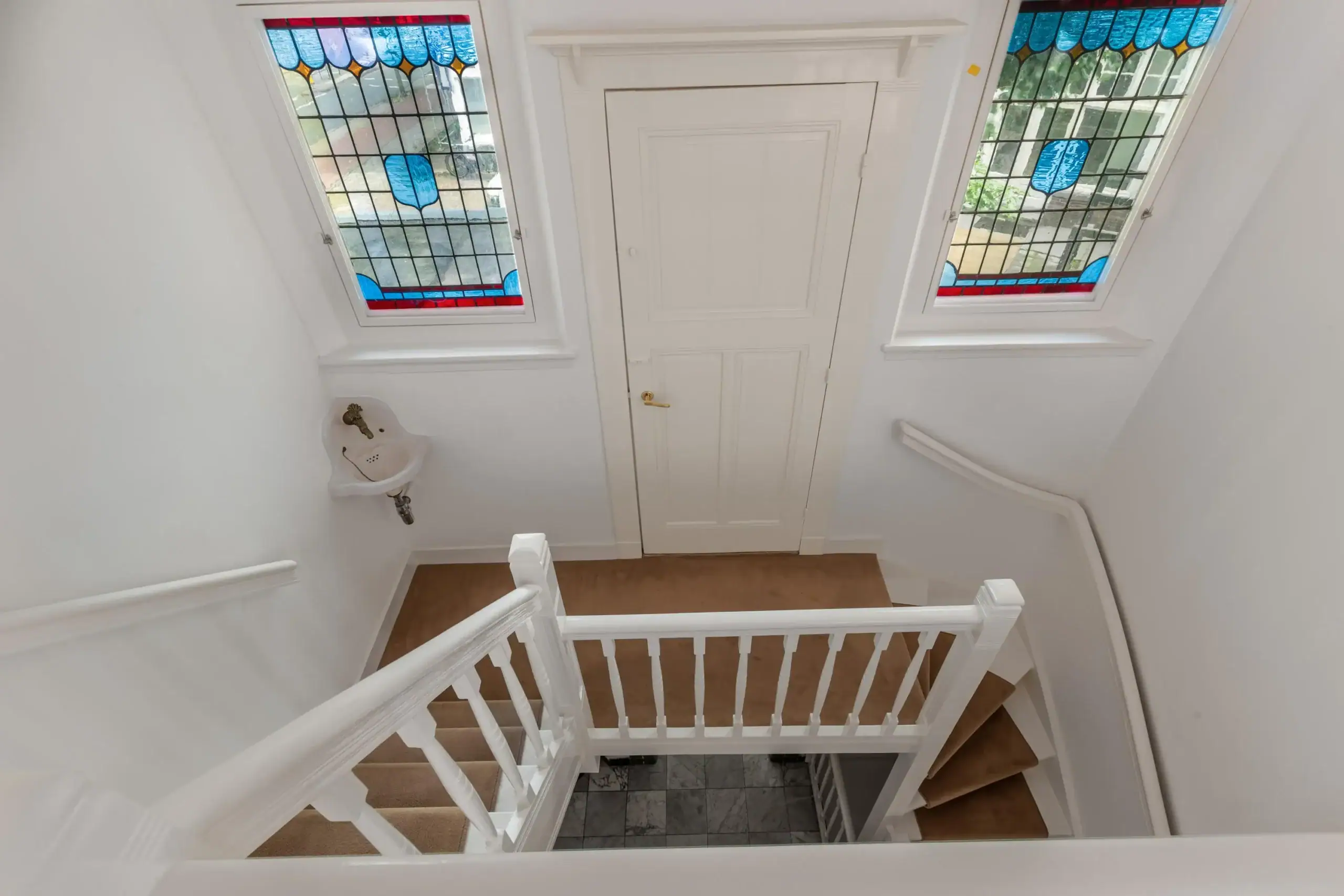 Landing between floors equipped with authentic sink, stained glass windows with a laundry room with washer-dryer connection.