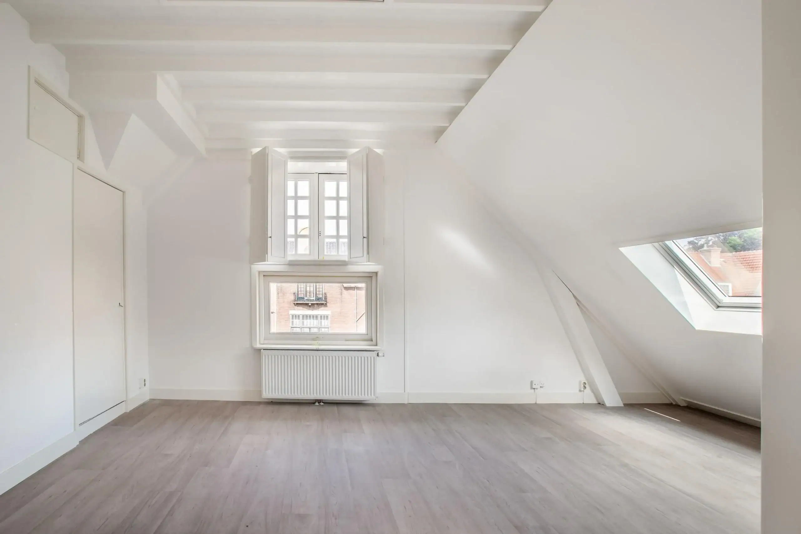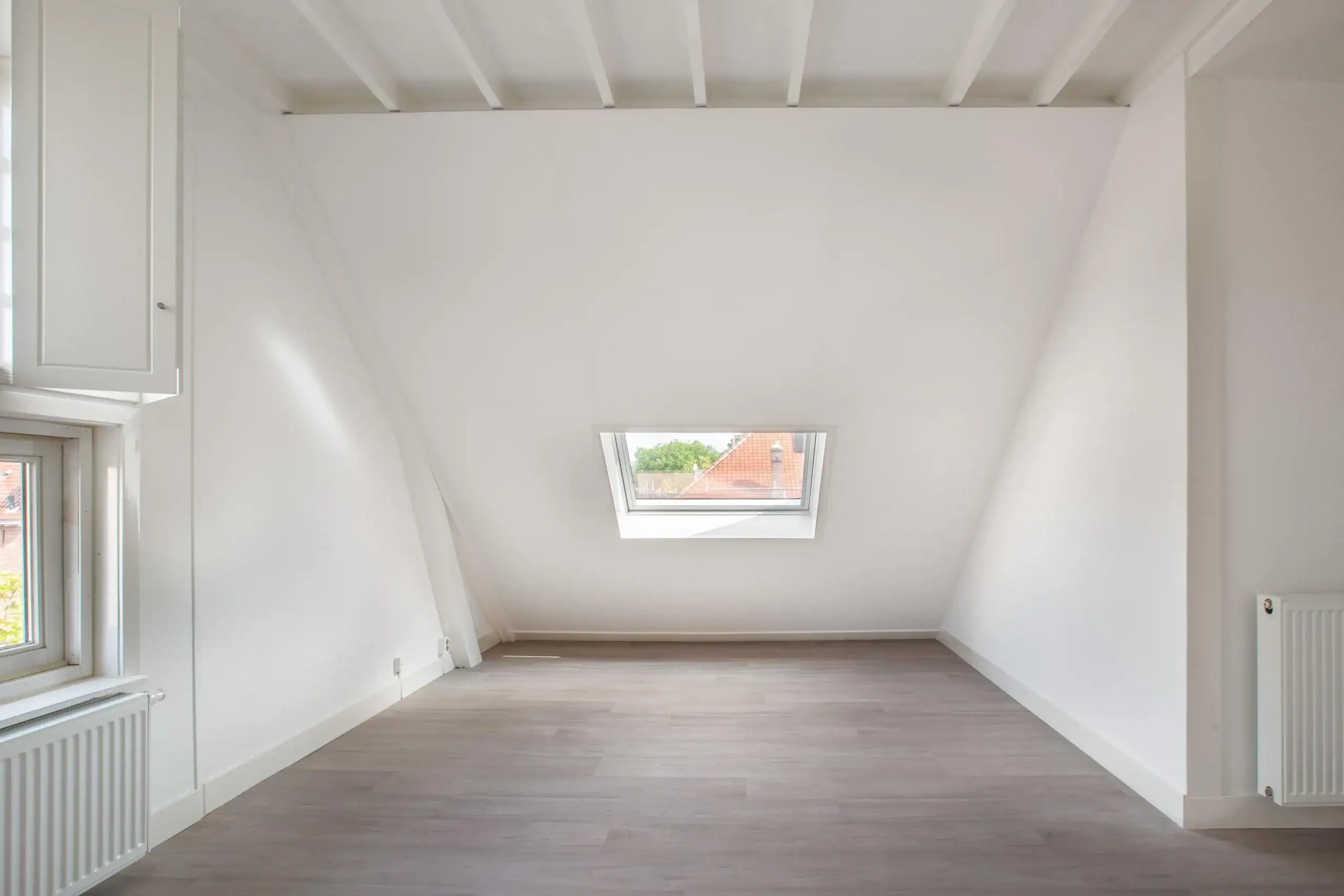 Landing with technical room equipped with inverter, central heating boiler, laminate and skylight. Front bedroom with Velux skylight, wooden beams, interior shutters, two closets and radiator. Through this bedroom you enter the attic. Rear bedroom with wooden beams, Velux skylight and fitted wardrobes. Second bathroom with walk-in shower, toilet and washbasin.