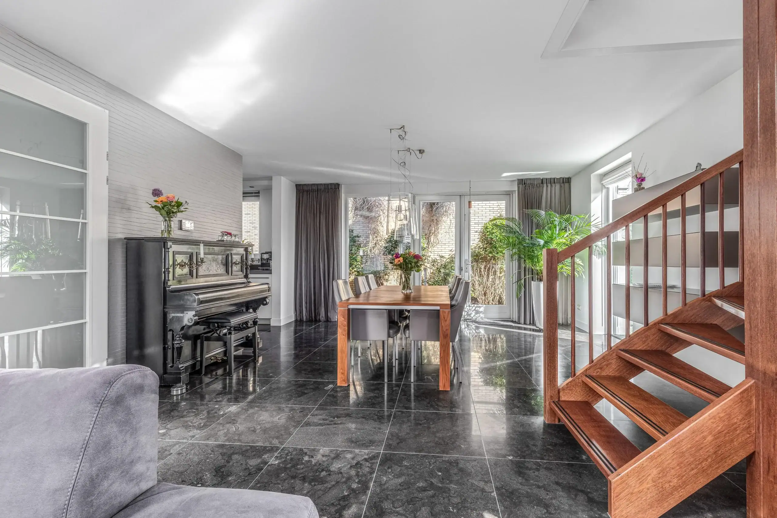 The bright living room, located on the right side, has a cozy open fireplace and French doors to the back garden. The high ceiling and large windows create a feeling of space. On the left side of the house is the dining room, which also provides access to the garden and leads to the kitchen. The kitchen has a pleasant layout with the 5-burner induction hob and sink with a Quooker to the right. On the left, you’ll find the dishwasher, combi-microwave, oven, and plate warmer.
