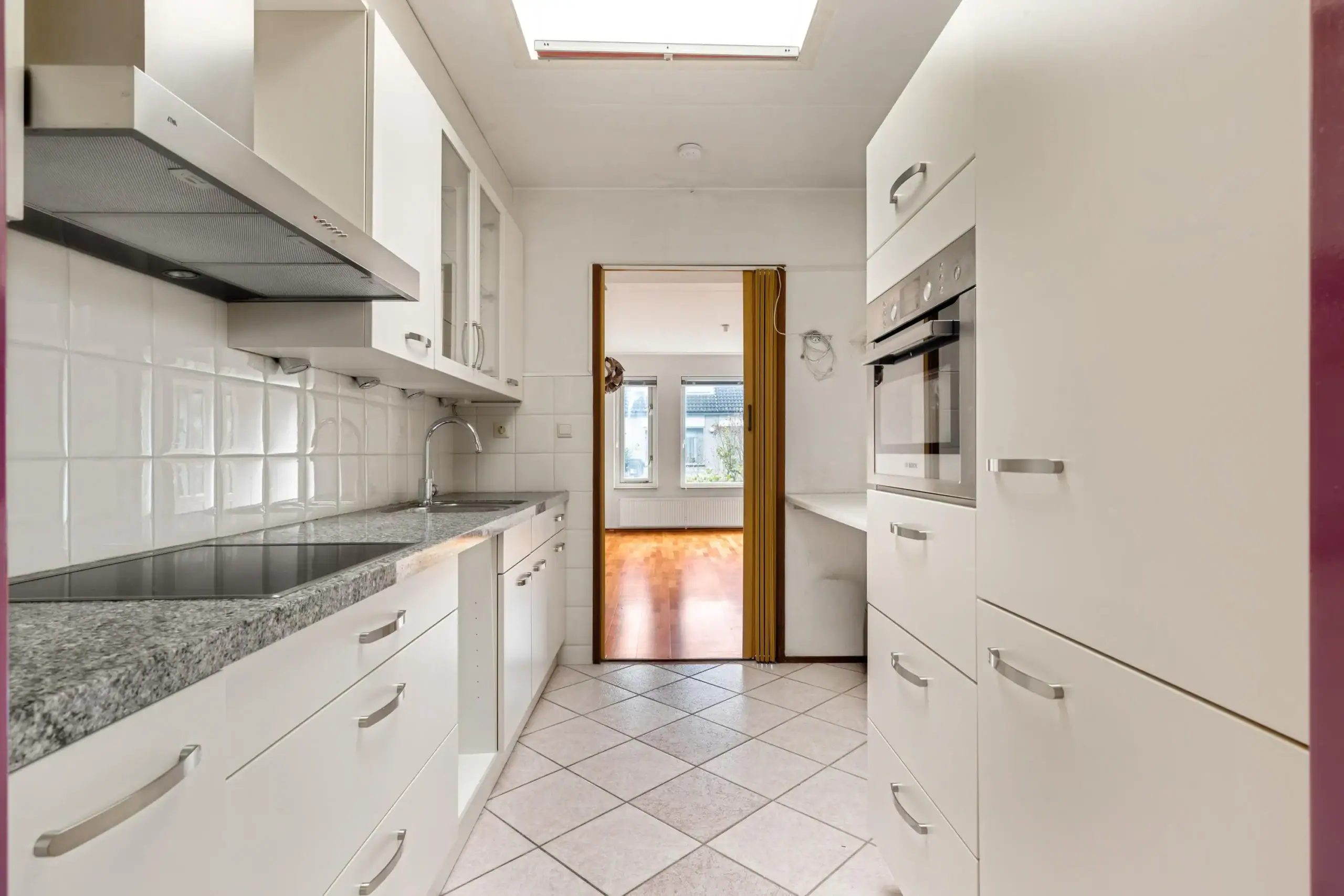 Entrance to the property with a spacious hallway, featuring a meter cupboard and sufficient space for a wardrobe. The living room is pleasantly bright thanks to the large window at the front. At the rear, there is a spacious bedroom with a door to the garden and an en-suite bathroom. This modern bathroom is well maintained and equipped with a walk-in shower, vanity unit, and toilet. The semi-open kitchen includes various built-in appliances and a skylight that provides additional daylight. The backyard can be accessed via the utility room.