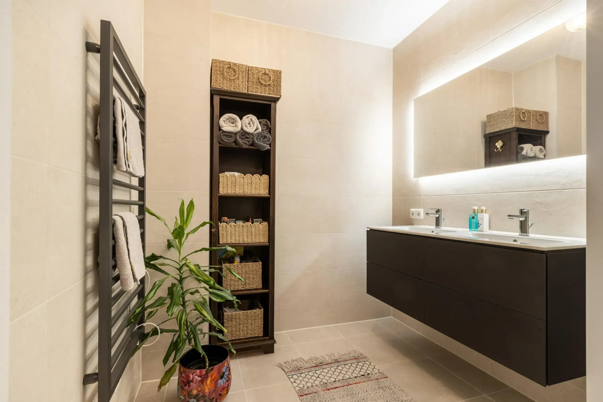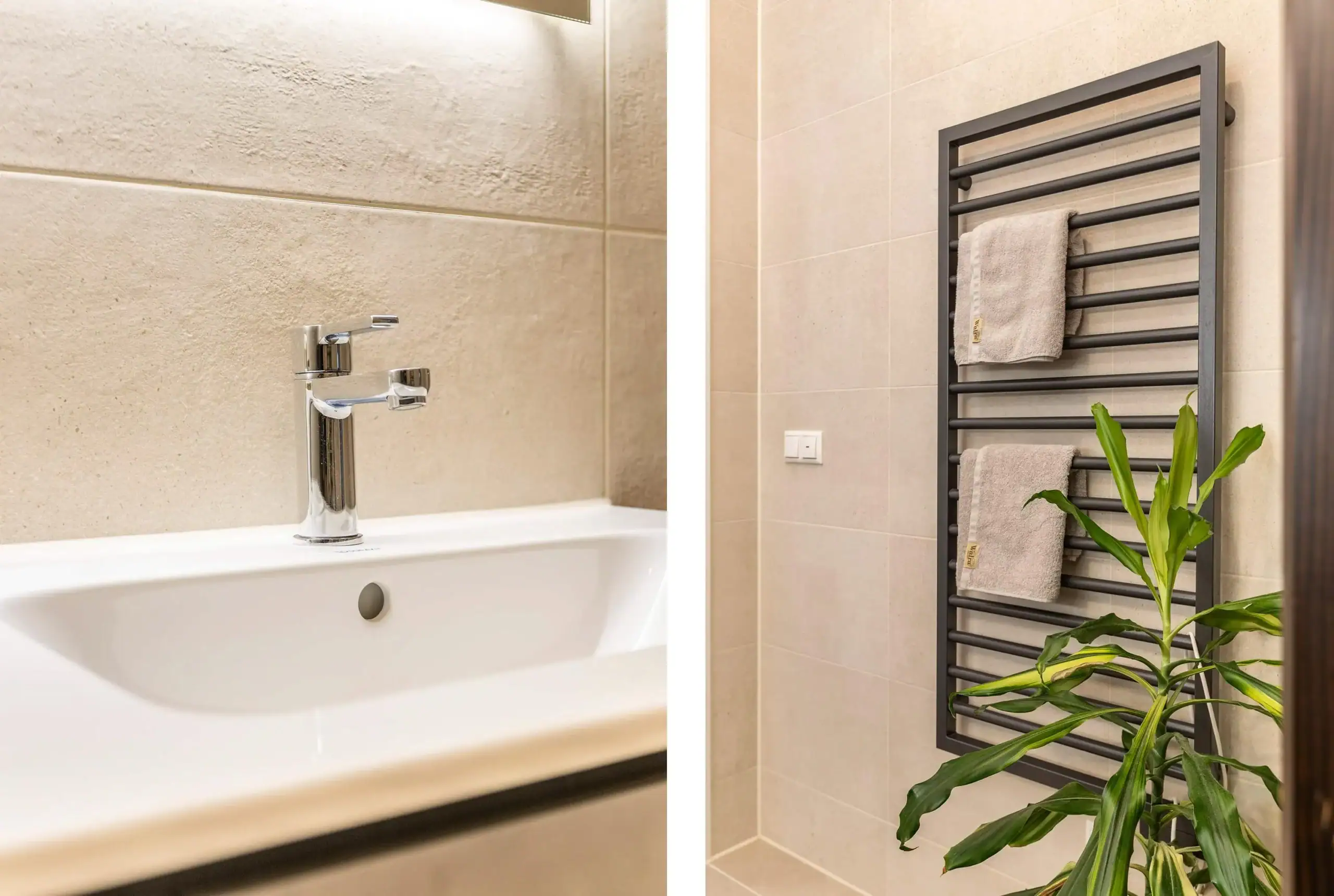 Adjacent to the living room, you’ll find the sunny southeast-facing balcony overlooking the beautifully landscaped courtyard – a private oasis where you can enjoy the morning and afternoon sun in peace. The bathroom exudes tranquility and elegance with spacious beige floor and wall tiles, a double sink with ample storage, and a large walk-in shower with dual showerheads. The separate toilet, with its own sink, is finished in the same stylish design.