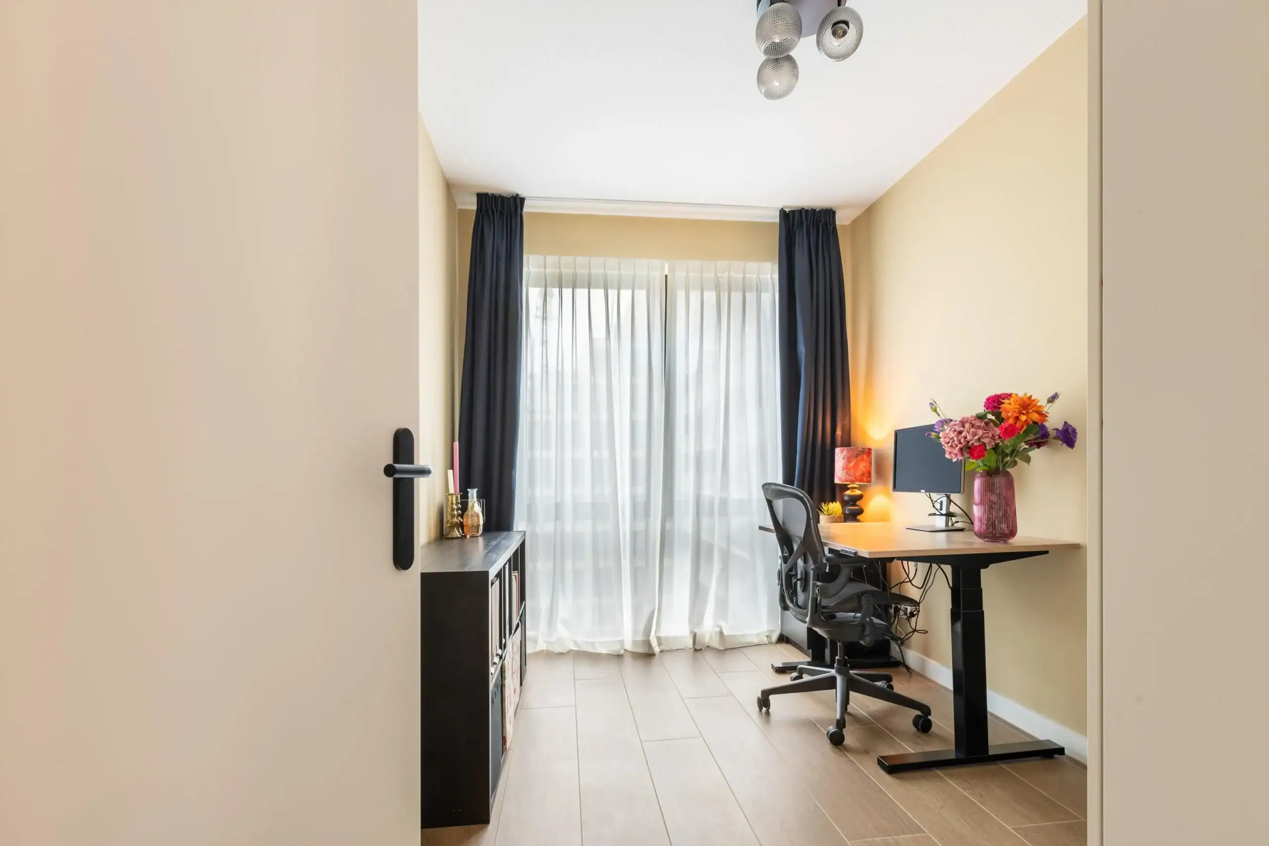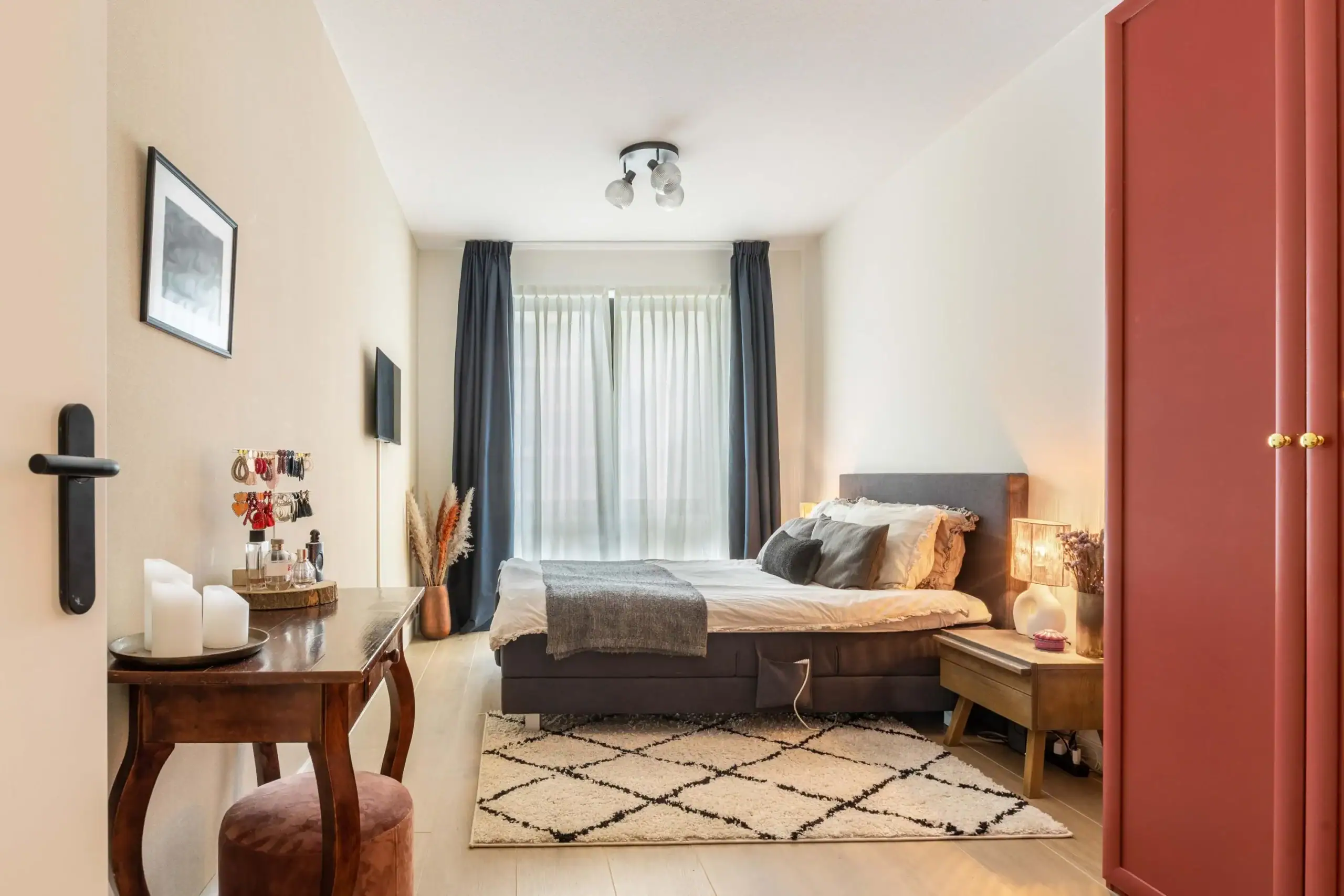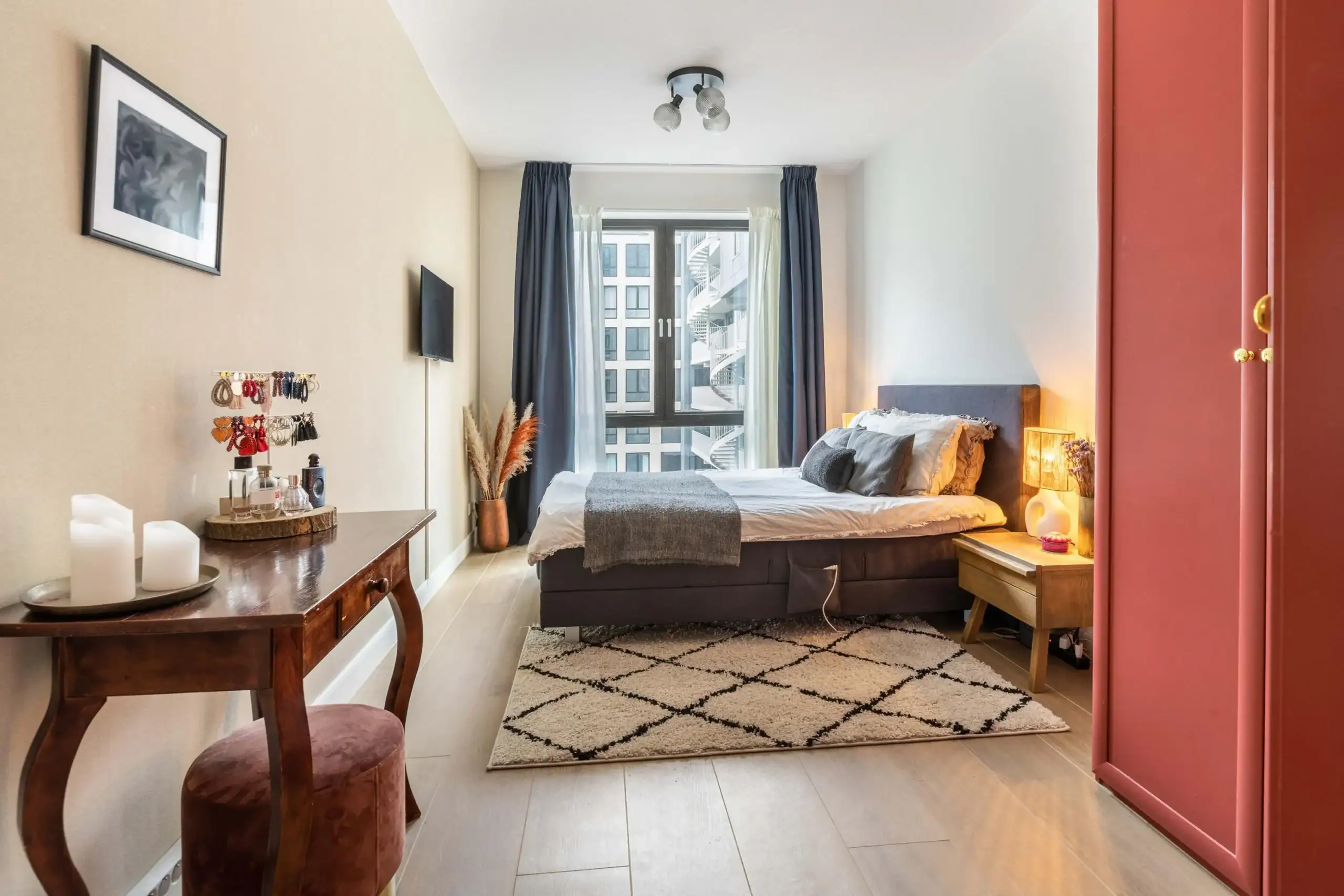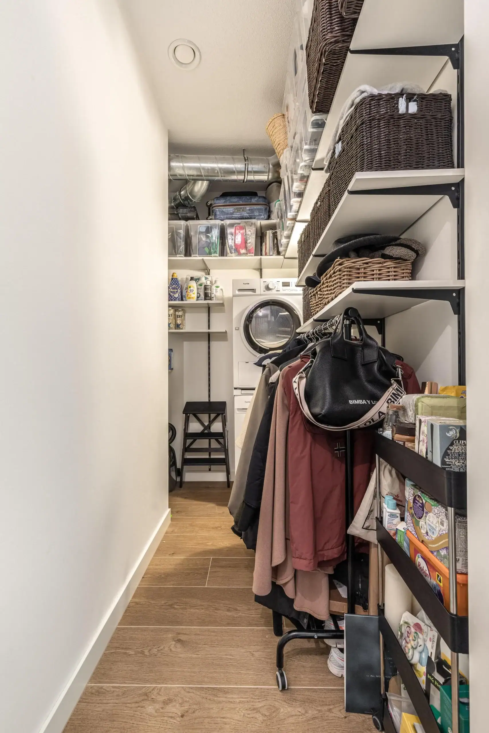 The apartment features two generously sized bedrooms, one of which is currently set up as a home office. The spacious master bedroom accommodates a large bed and wardrobe, with double curtains creating a luxurious “hotel-like” atmosphere. The storage space is surprisingly efficient, with a neatly designated area for the washer and dryer, surrounded by a custom-built shelving system extending to the ceiling – clever, practical, and stylish.