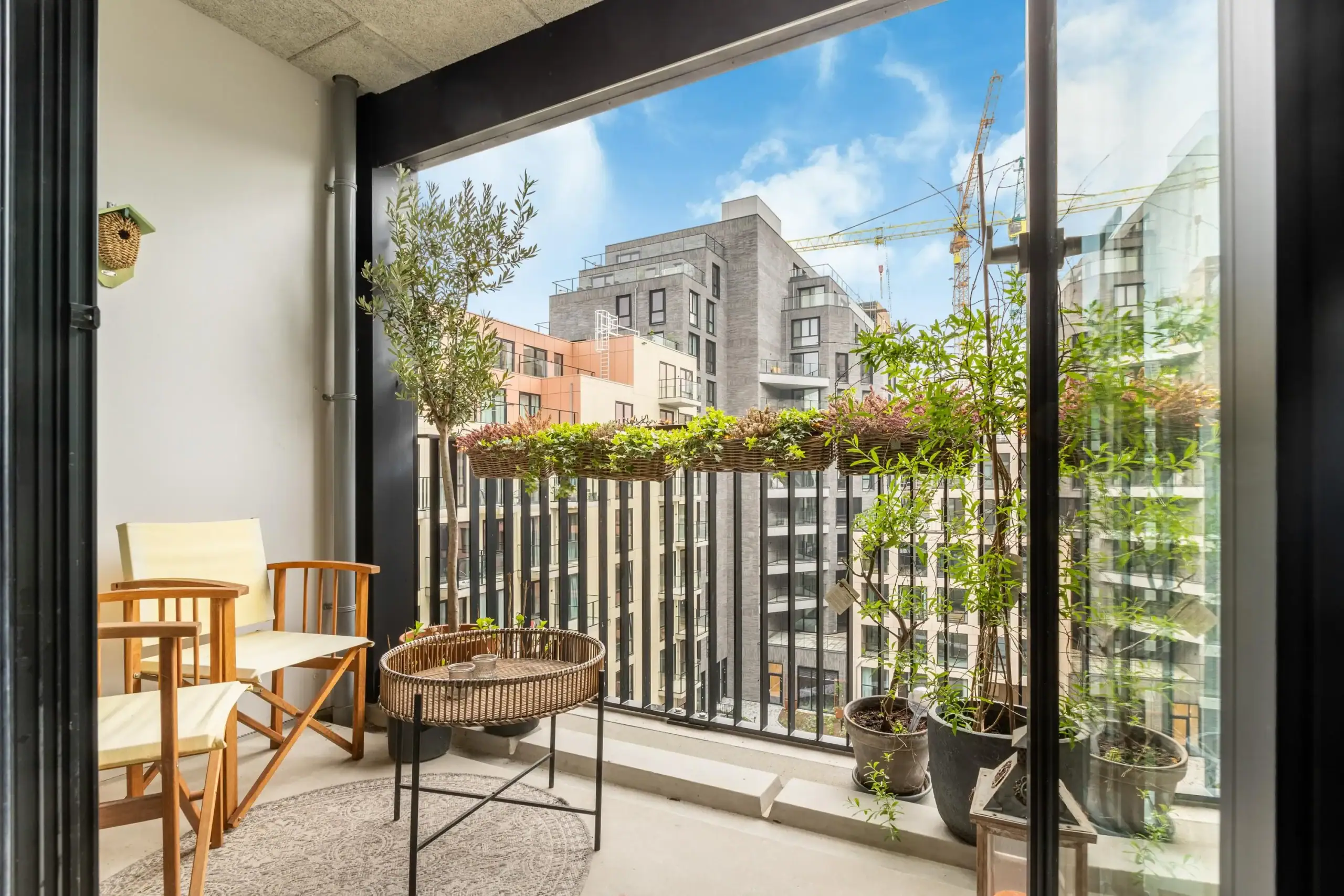 * Sunny southeast-facing balcony with a view of the courtyard garden