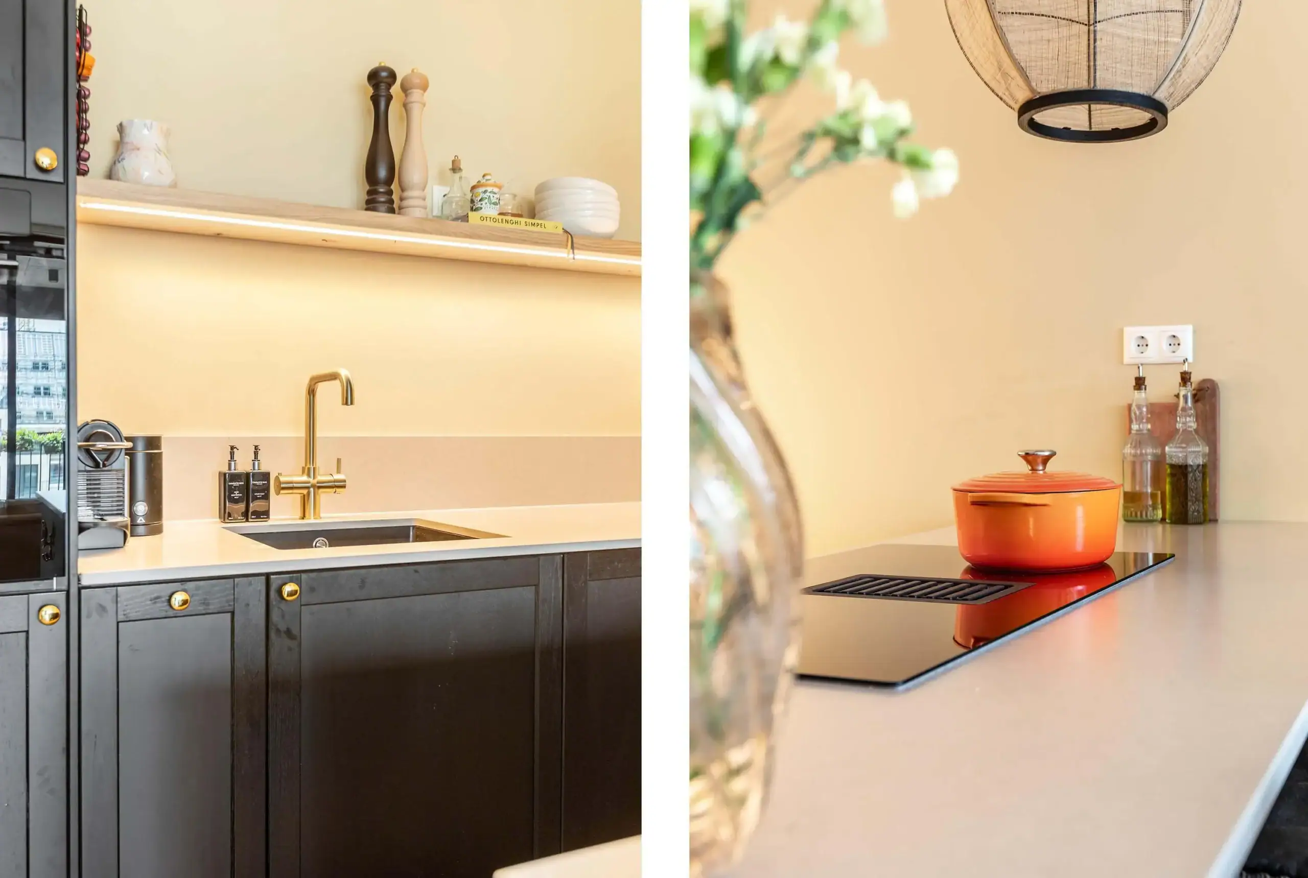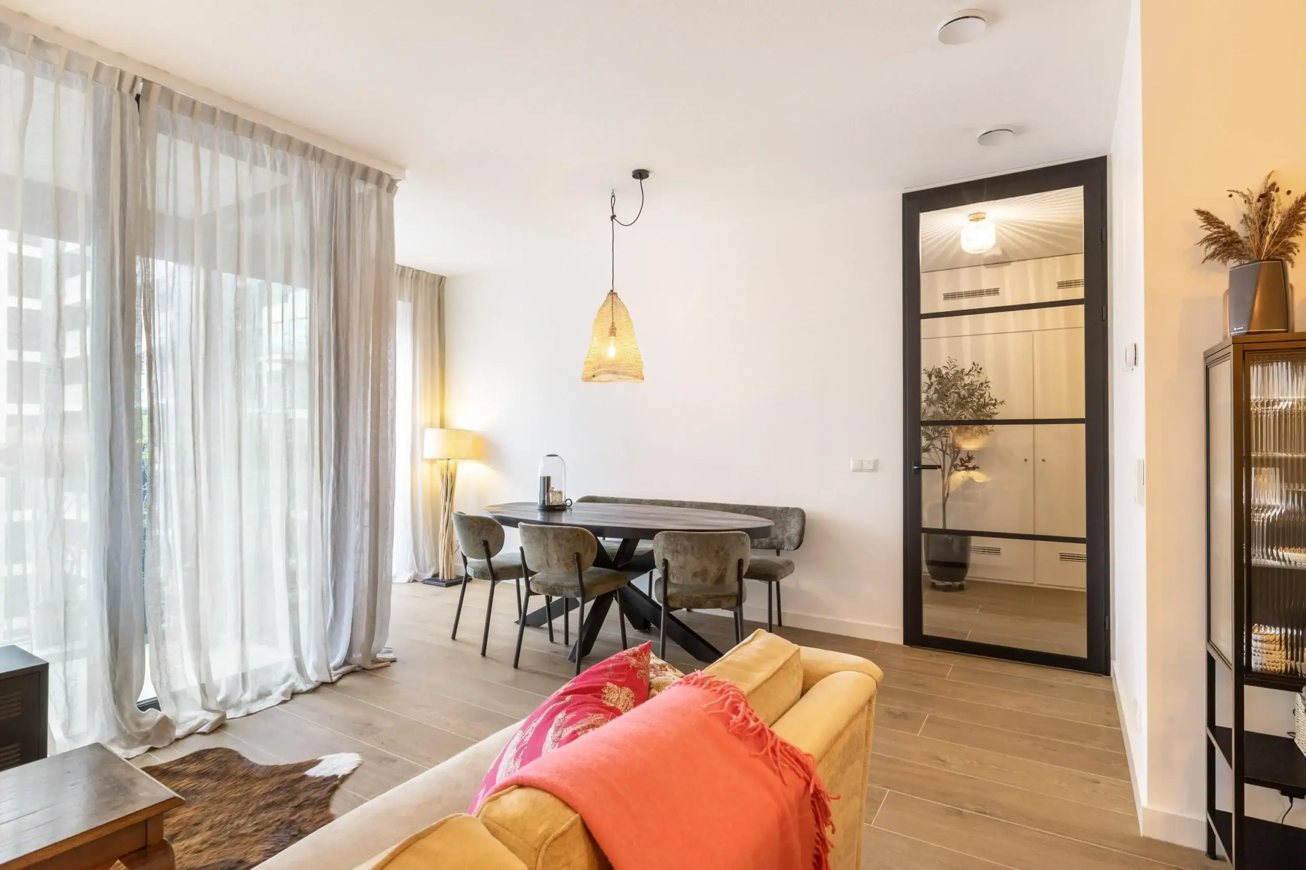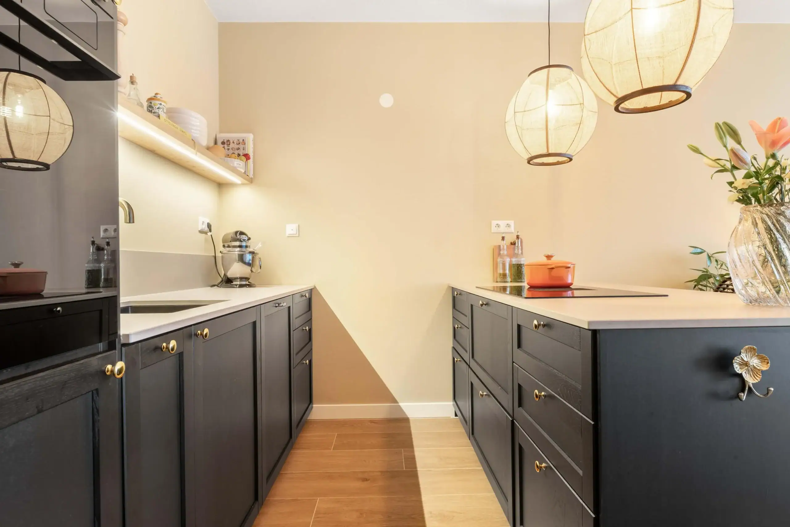Through the elegant glass door, with black detailing, you enter the living room, which includes a cozy seating area, a dining table, and an open kitchen. The living room’s linen curtains contribute to the warm ambiance while offering privacy. The open kitchen is an absolute eye-catcher: designed in rich, dark tones with elegant gold accents and fully equipped with high-quality built-in appliances, including an extra-wide induction cooktop with integrated extraction, a boiling water tap, oven, dishwasher, refrigerator, and freezer. Extra-tall cabinets, nearly reaching the ceiling, illuminated soft-close drawers, and a sleek kitchen island ensure both design and functionality, providing an impressive amount of storage space.