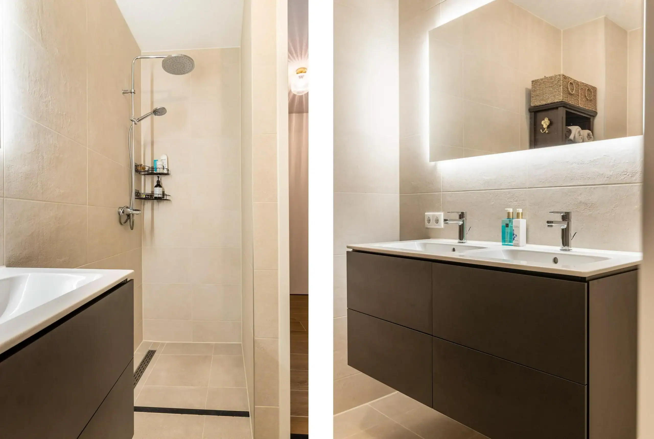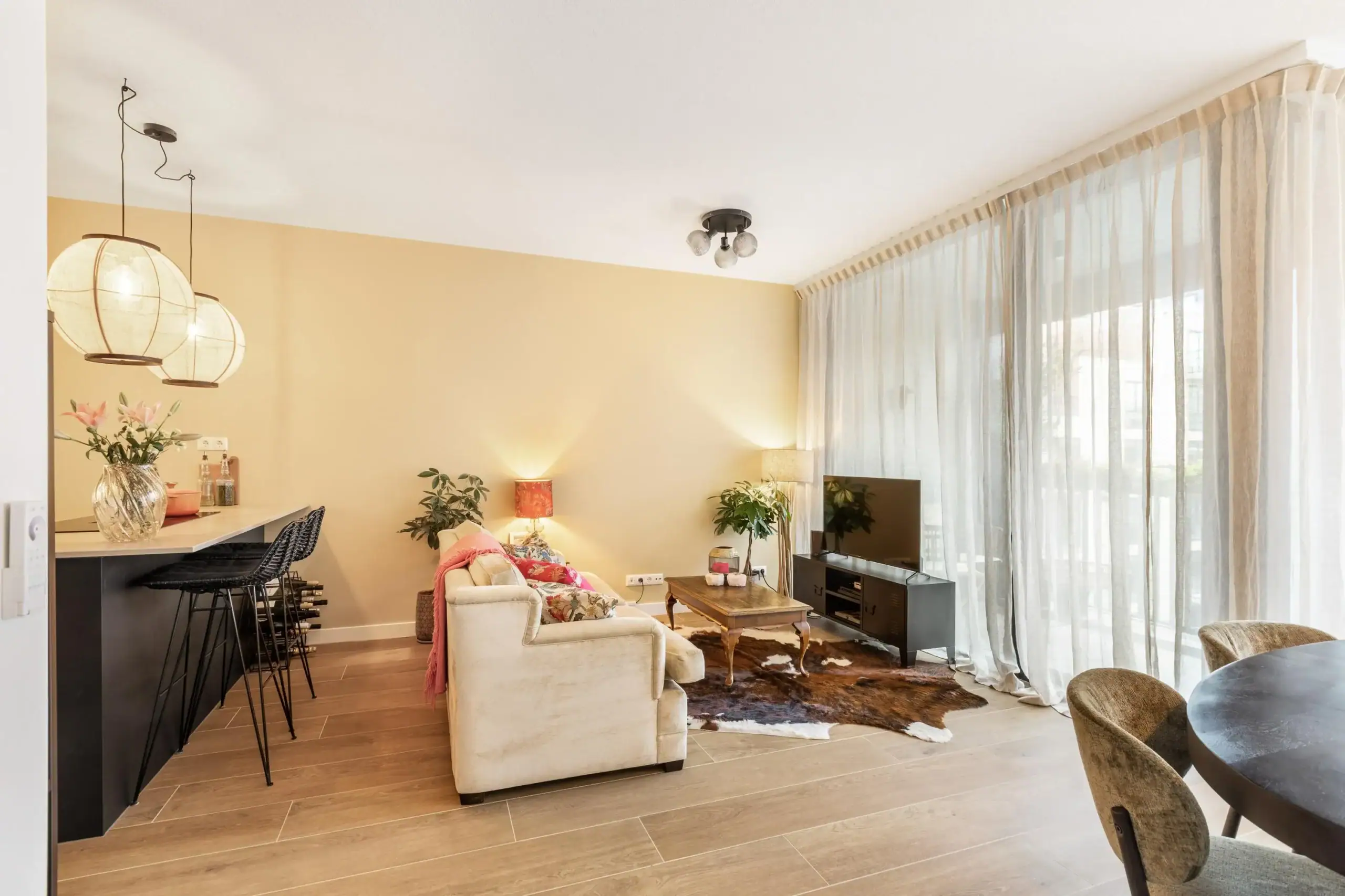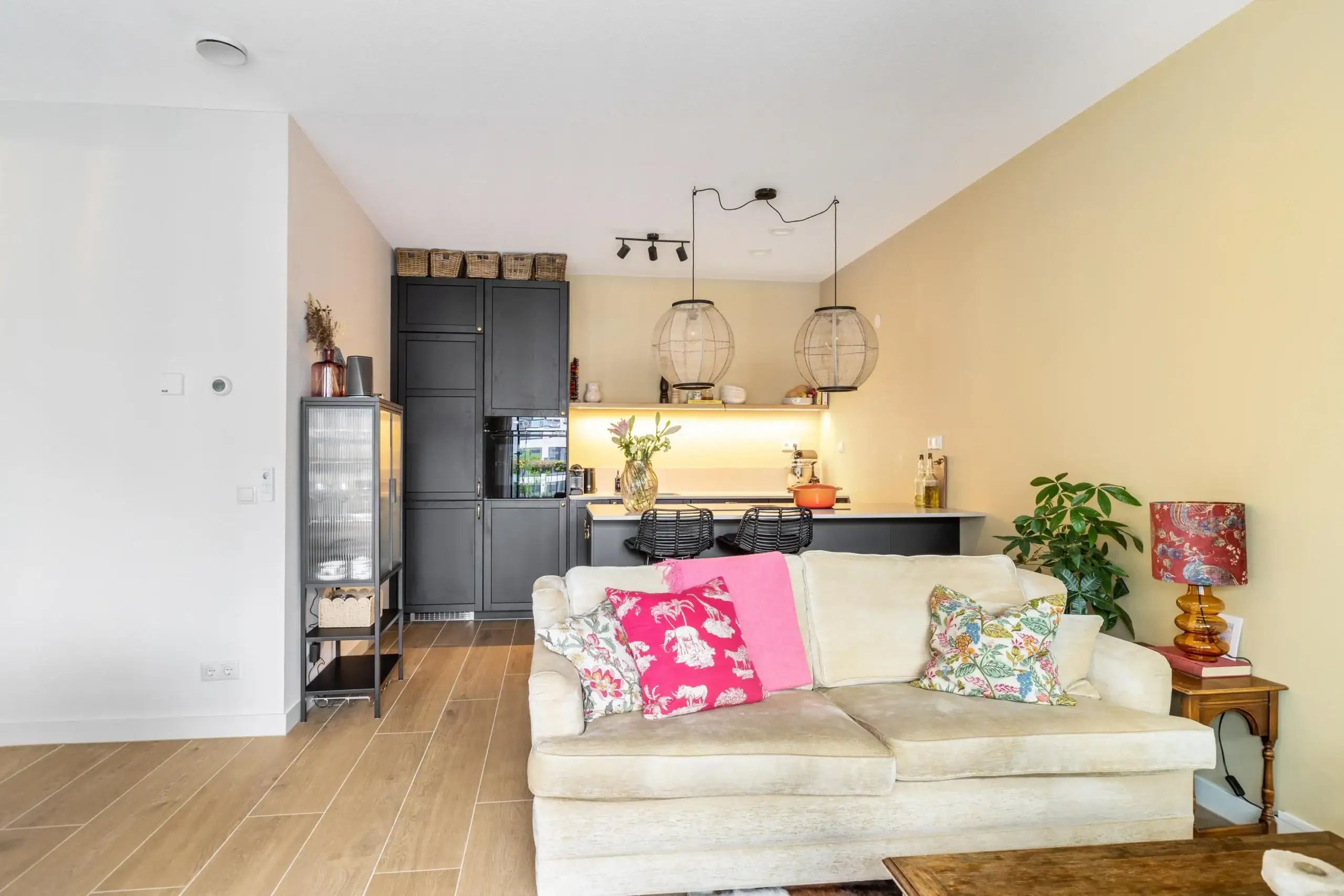 Through the elegant glass door, with black detailing, you enter the living room, which includes a cozy seating area, a dining table, and an open kitchen. The living room’s linen curtains contribute to the warm ambiance while offering privacy. The open kitchen is an absolute eye-catcher: designed in rich, dark tones with elegant gold accents and fully equipped with high-quality built-in appliances, including an extra-wide induction cooktop with integrated extraction, a boiling water tap, oven, dishwasher, refrigerator, and freezer. Extra-tall cabinets, nearly reaching the ceiling, illuminated soft-close drawers, and a sleek kitchen island ensure both design and functionality, providing an impressive amount of storage space.