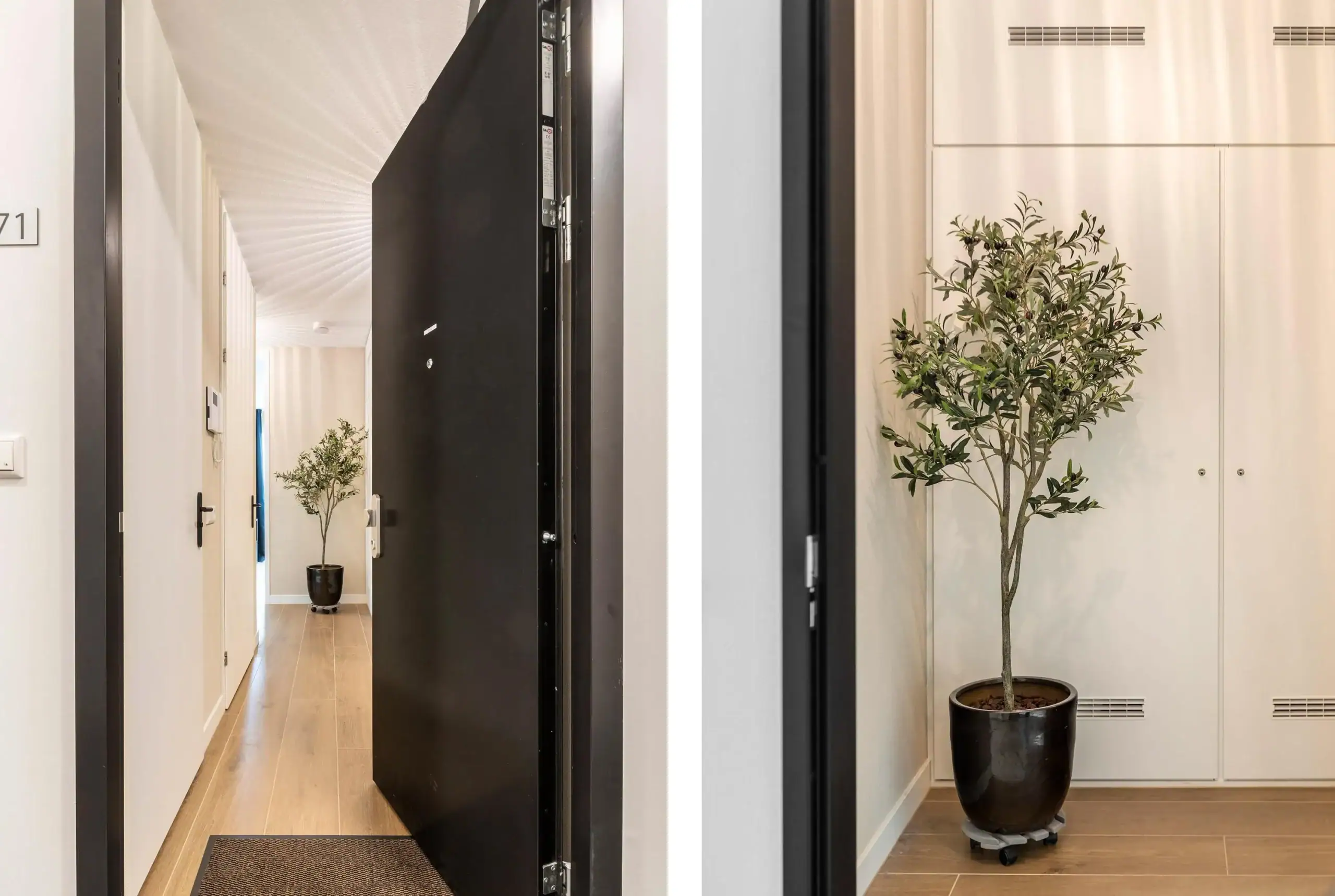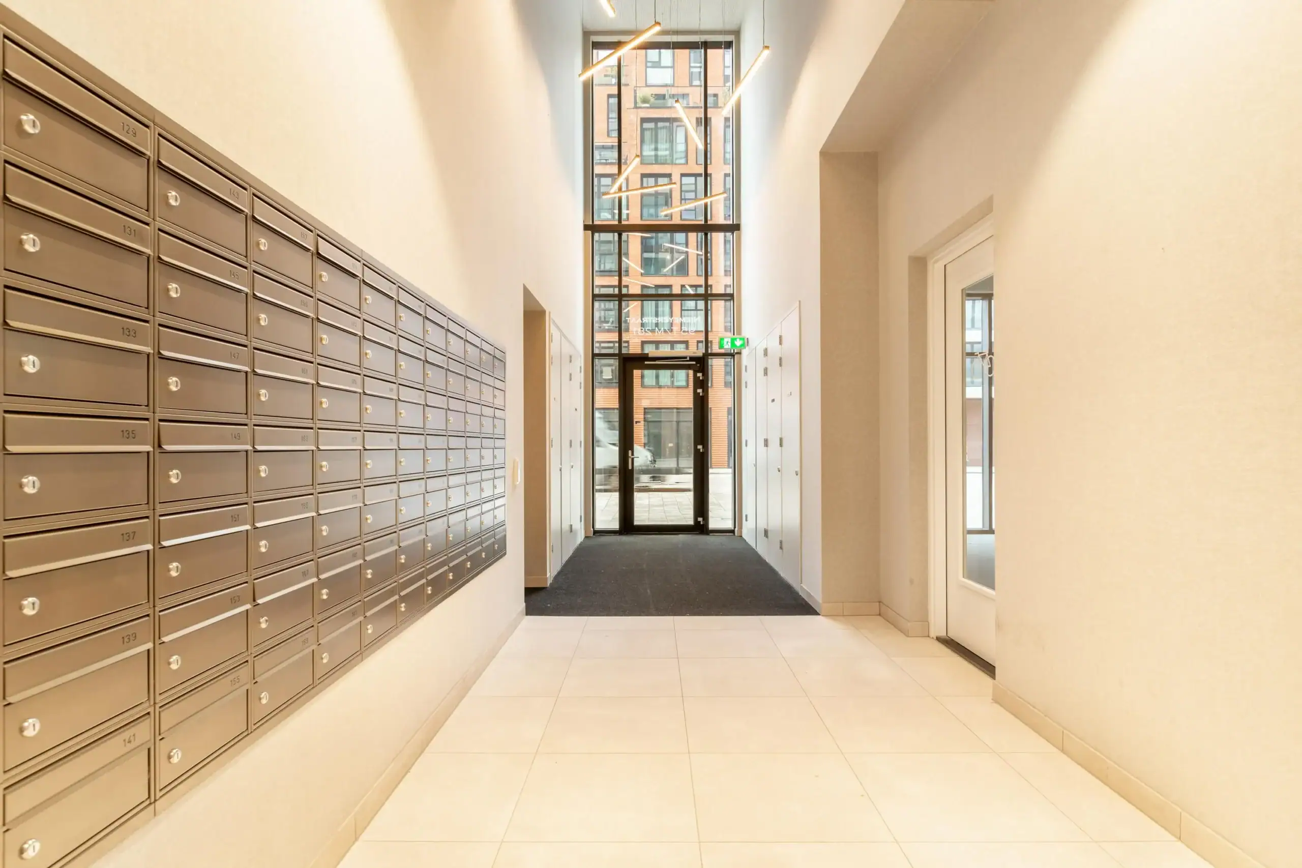Representative entrance with intercom, access to the courtyard garden, bike storage areas, and elevators.