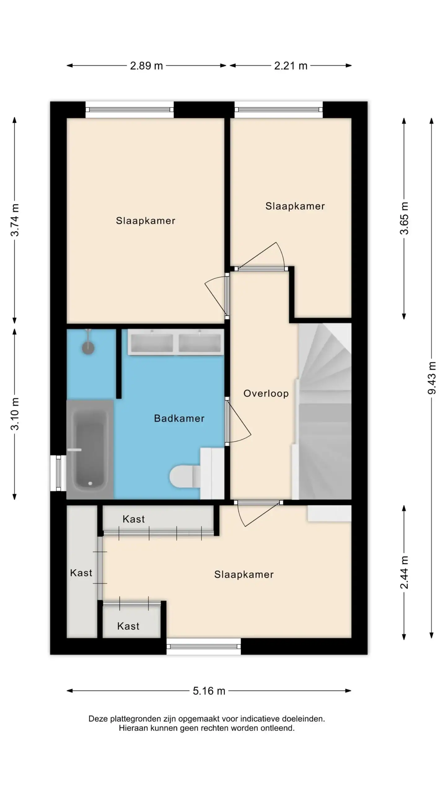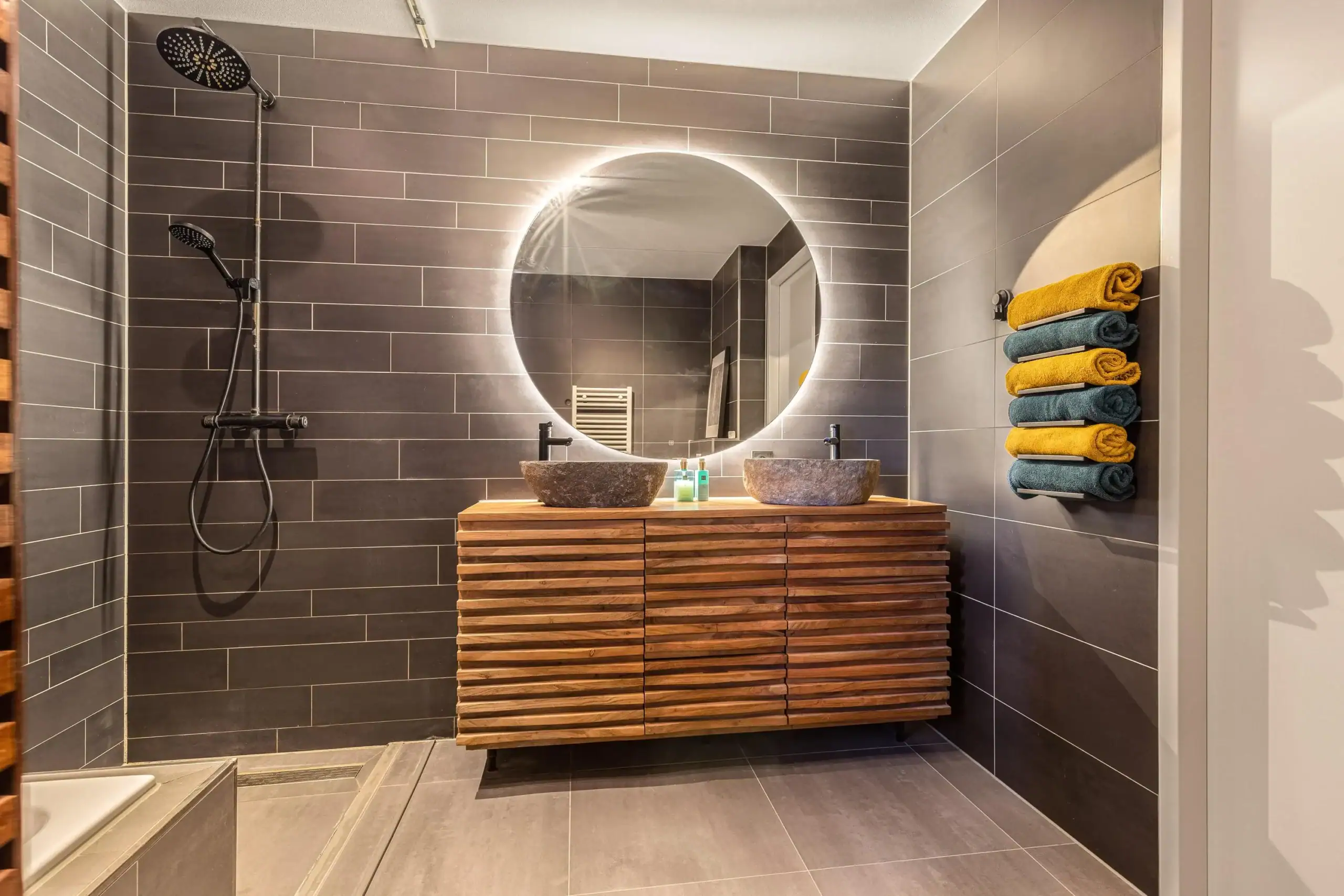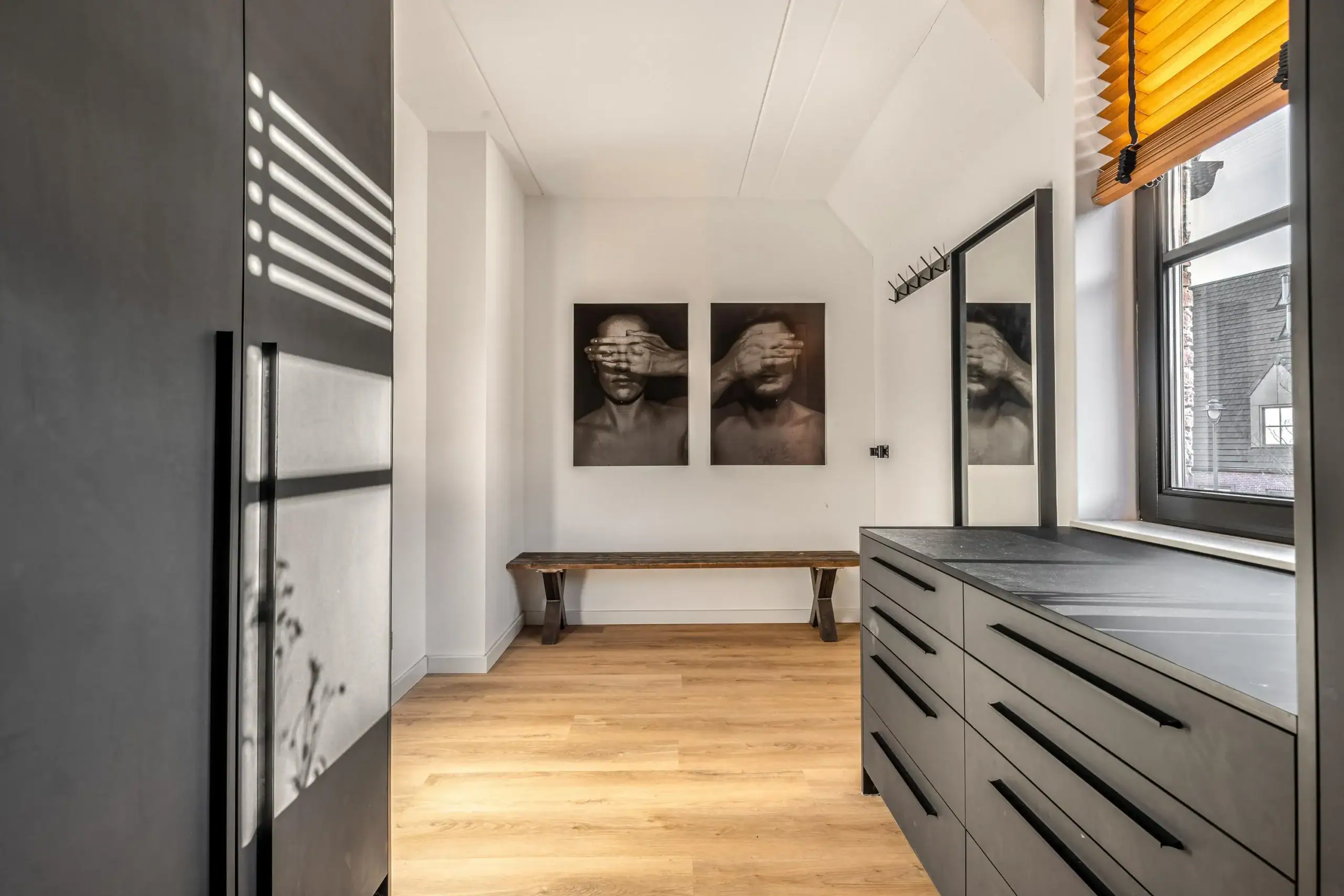 Spacious landing with access to three rooms, two of which are currently arranged as bedrooms. The room at the front has been set up as a luxurious walk-in closet and features beautiful custom-made wardrobes with lighting and practical pull-out hanging rails. The bathroom has a warm and stylish atmosphere thanks to the dark floor and wall tiles combined with warm wood accents. The space is fully equipped with a toilet, bathtub, a spacious walk-in shower with double shower head and sliding door, and a stylish double washbasin unit. At the rear there are two well-proportioned bedrooms, both of good size and with pleasant natural daylight.