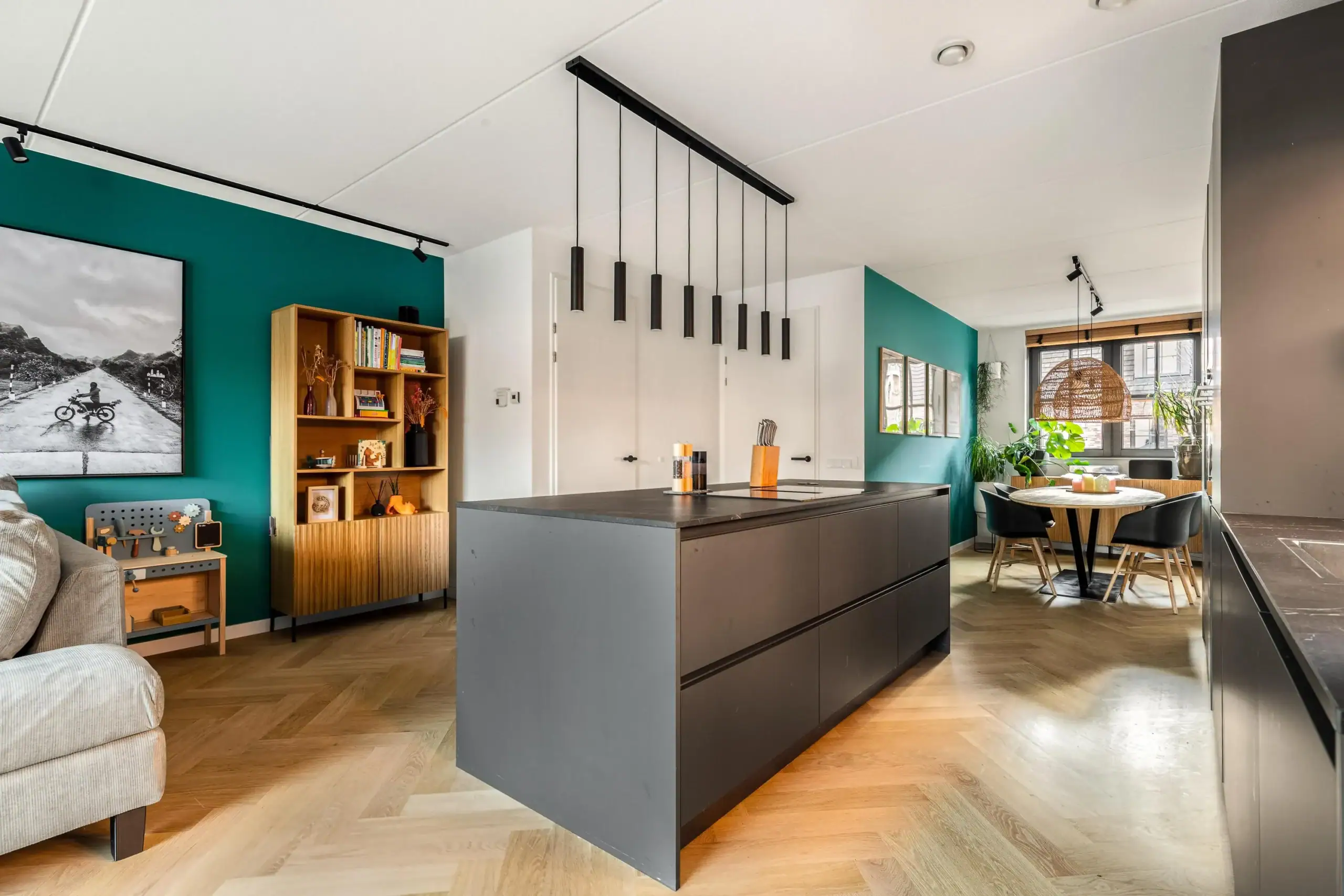 The property features a sunny front garden with a cozy seating area. Next to the house there is a practical garage with plenty of storage space and convenient French doors at both the front and rear. Through the entrance you enter the hallway with meter cupboard, toilet, wardrobe space and the staircase to the first floor. The living room is finished with a beautiful wooden herringbone floor and equipped with comfortable underfloor heating. There is also plenty of storage space in the pantry. The stunning kitchen-diner with a large cooking island is centrally positioned in the living room and forms the true heart of the home. The kitchen is equipped with various built-in appliances: induction hob with integrated extraction, Quooker, dishwasher, oven, combi-oven, refrigerator and freezer. There is ample workspace and plenty of storage in the drawers and cabinets. At the front there is space for a large dining table, with a large window providing plenty of natural light. At the rear is the cozy seating area with an attractive fireplace and a large glass sliding door to the backyard. The backyard is beautifully landscaped and equipped with lighting. There is also a convenient rear entrance and a practical storage shed for your belongings. The garden also features a jacuzzi, a wonderful luxury. The attached garage can be accessed via the side of the garden and also provides access to the front garden.
