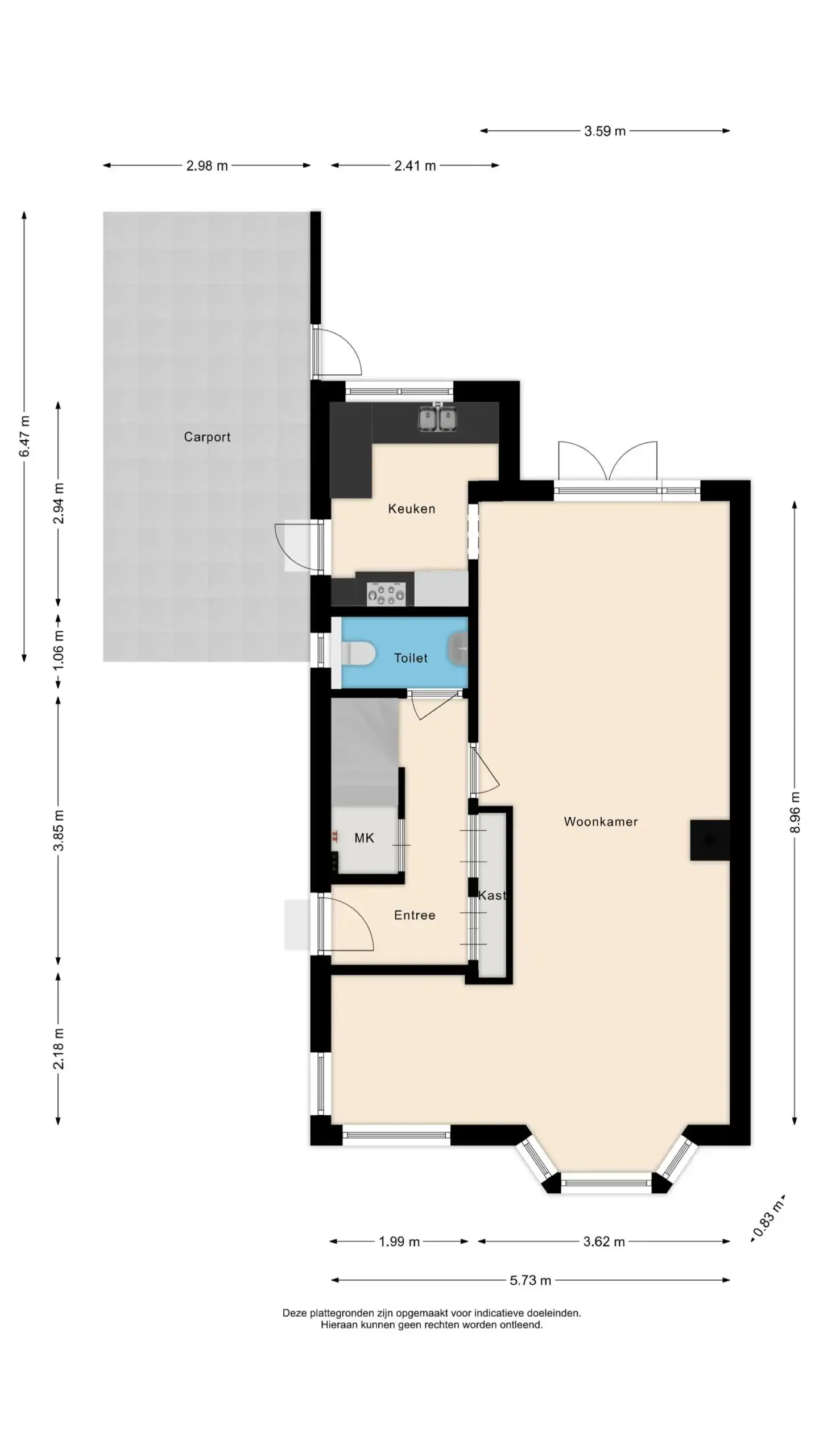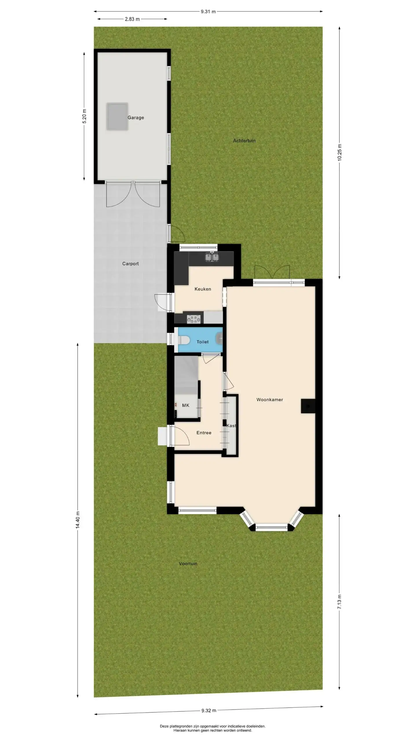 Front garden with private driveway, carport and garage. Entrance to the house. Hallway with toilet and stair cupboard. Living room with bay window at the front and French doors leading to the spacious south-facing garden. Kitchen equipped with fridge with freezer compartment, oven, 5-burner gas hob, extractor hood and dishwasher.